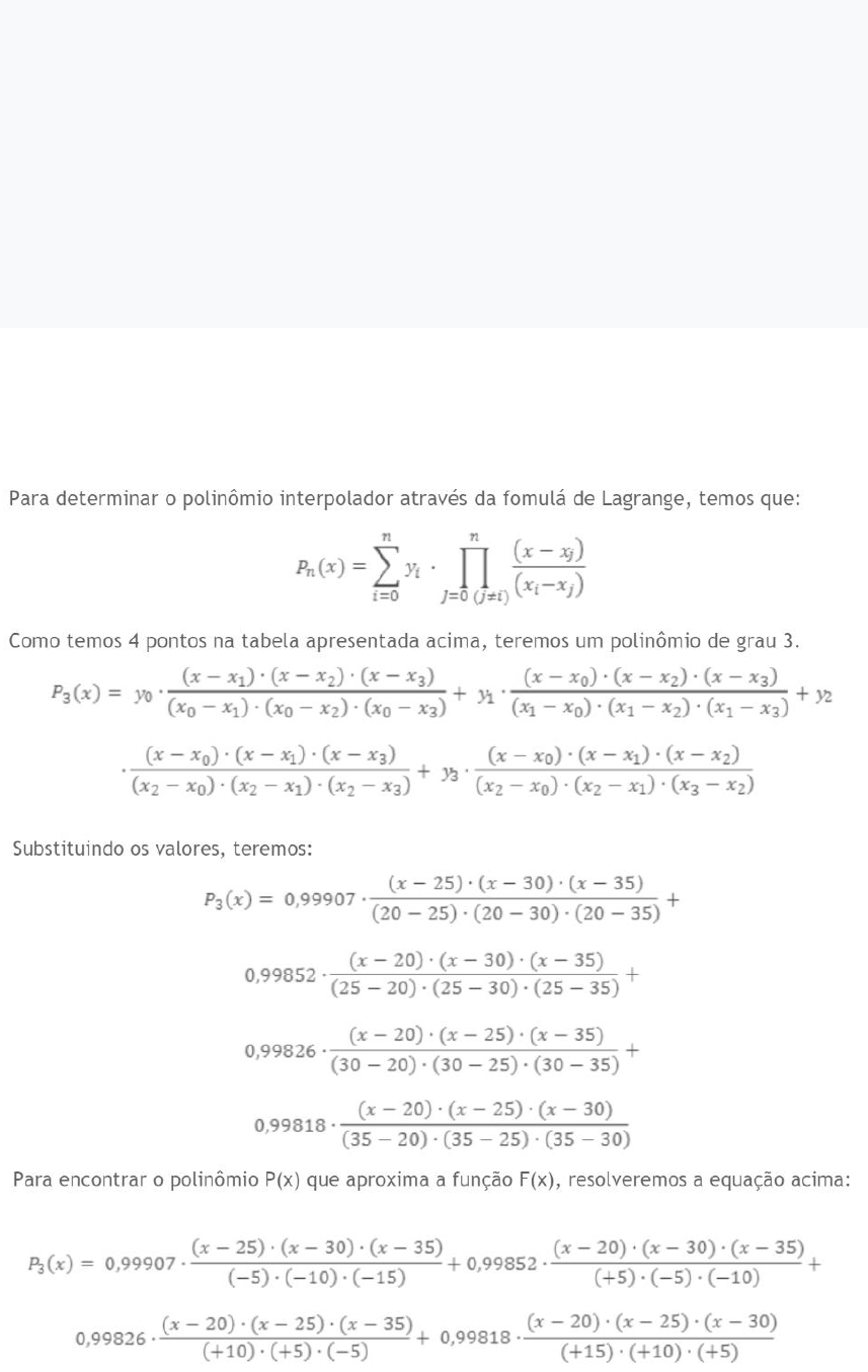 Página 1 de 2 Interpolar uma função f(x)é aproximá-la por outra função g(x), selecionada entre uma classe de funções que satisfazem certas propriedades. Normalmente, precisamos recorrer a esta ferramenta em 2 situações: a primeira, quando são conhecidos apenas alguns valores numéricos da função para um conjunto de pontos, e é necessário calcular o valor da função em um ponto não tabelado; a segunda, quando a função em estudo tem uma expressão tal que operações como a diferenciação e a integração são difíceis (ou impossíveis) de serem realizadas (FERNANDES, 2015, p. 101). FERNANDES, D. B. Cálculo numérico. São Paulo: Pearson Education do Brasil, 2015. Considere a tabela a seguir, a qual relaciona o calor específico da água e a temperatura e, a partir do exposto acima, utilize a fórmula de Lagrange para determinar o polinômio interpolador de maior grau possível que modela o calor específico em função da temperatura. Em seguida, calcule o calor específico da água a 27,5 graus celsius. Temperatura (graus celsius) 20 25 30 35 Calor específico 0,99907 0,99852 0,99826 0,99818 Resolução: Página 2 de 2 2023-11-13T11:44:28-0300 Fernando Nunes Leite