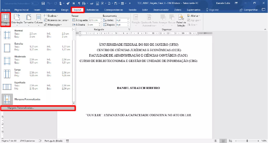 10 DICAS PARA FORMATAR TCC NO WORD DE ACORDO COM A ABNT O TCC ou monografia deve ser formatado de acordo com as normas da ABNT (Associação Brasileira de Normas Técnicas). Ao criar o documendo no Word, o estudante pode editar a fonte, margem, espaçamento, números de página, citações, sumário e referências bibliográficas. Veja a seguir as regras da ABNT e 10 dicas e truques para formatar seu trabalho de conclusão de curso e padronizá-lo de acordo com elas. 1. Margens Segundo a ABNT NBR 14724:2011, que regula as configurações de trabalhos acadêmicos, as margens da folha devem ter 3 cm no anverso esquerdo superior e no verso direito superior, e 2 cm no anverso direito inferior e verso esquerdo inferior. Passo 1. Para formatar a página no Microsoft Word dentro destas especificações, o usuário deve selecionar a barra “Layout”, clicar em “Margens” e escolher a opção “Margens Personalizadas...”. Na aba "Layout", selecione "Margens" e clique em "Margens Personalizadas..." — Foto: Reprodução/ Daniel Ribeiro 1 Passo 2. Uma janela será aberta com campos para configurar a distância de cada uma das margens separadam2ente. Altere conforme a ABNT ou as normas da instituição em que estuda. Na janela de personalização das margens, altere os valores segundo as especificações da ABNT — Foto: Reprodução/Daniel Ribeiro 2. Fonte, espaçamento e parágrafo De acordo com a ABNT NBR 14724:2011, recomenda-se fonte de tamanho 12 para todo trabalho, com espaçamento de 1,5 entre as linhas, salvo exceções para citações de mais de três linhas, notas de rodapé, paginação e legendas. Os critérios para parágrafos e tipo de fonte variam, mas é de costume utilizar Arial ou Times New Roman, com um recuo de 1,25 cm no início do parágrafo. Passo 1. Aperte em “Selecionar” e escolha a opção “Selecionar Tudo” para marcar todo o texto do documento e padronizar a fonte, o espaçamento e o parágrafo. 2 Em "Selecionar", aperte na opção "Selecionar Tudo" para marcar todo o texto do documento de uma só vez — Foto: Reprodução/Daniel Ribeiro Em "Selecionar", aperte na opção "Selecionar Tudo" para marcar todo o texto do documento de uma só vez — Foto: Reprodução/Daniel Ribeiro Passo 2. Clique com o botão direito do mouse no texto selecionado e escolha a opção “Fonte...” para configurar a fonte do documento. 3 Clique com o botão direito do mouse e escolha "Fonte..." — Foto: Reprodução/Daniel Ribeiro Passo 3. Na janela de configuração de fonte, escolha tipo e tamanho e confirme no botão “OK”. Escolha o tipo e o tamanho da fonte e, em seguida, pressione "OK" — Foto: Reprodução/Daniel Ribeiro Passo 4. Ainda com o texto inteiro do documento selecionado, clique com o botão direito do mouse e selecione a opção “Parágrafo...” para abrir a janela com opções de configuração do recuo do início do parágrafo e do espaçamento entre linhas. 4 Repita o processo e escolha "Parágrafo..." para configurar os parágrafos e espaçamentos — Foto: Reprodução/Daniel Ribeiro 3. Estilos de fontes O recurso de Estilos de fontes do Word facilita a organização da monografia ou TCC porque permite personalizar estilo de fonte de cada título de seção, corpo do texto, citações de mais de três linhas, referências bibliográficas etc. Passo 1. Selecione um título de seção e, após configurar sua fonte, parágrafo e espaçamento, clique com o botão esquerdo do mouse em uma das opções da barra de Estilos de Fontes e escolha “Atualizar Titulo 1 para Corresponder à Seleção”. 5 Selecione um título de seção já formatado e clique na opção "Atualizar Titulo 1 para Corresponder à Seleção" na barra de Estilos de Fontes — Foto: Reprodução/Daniel Ribeiro Passo 2. Repita o mesmo processo com o corpo do texto, citações de mais de três linhas, referências bibliográficas etc. Lembre-se de que é possível também renomear cada Estilo de fonte como quiser. Repita o processo com o corpo do texto do trabalho acadêmico e renomeie o Estilo de Fonte — Foto: Reprodução/Daniel Ribeiro Passo 3. Utilizando este recurso,é possível visualizar de forma mais eficiente e fluída as diferentes partes do documento através do “Painel de Navegação”. 6 Ao categorizar os títulos de seções e subseções, é possível utilizar o recurso de "Painel de Navegação" — Foto: Reprodução/Daniel Ribeiro 4. Capa A ABNT NBR 14724:2011 tem a capa dos trabalhos como elemento obrigatório e exige a apresentação da seguinte ordem de informações: nome da instituição, nome do autor, título, subtítulo e local da instituição onde será apresentado. Passo 1. As informações apresentadas na capa devem ter um espaçamento razoável o suficiente para destacá-las. Clique na opção “Mostrar Tudo” para visualizar melhor as fontes, espaçamentos e parágrafos. 7 Clique em "Marcar Tudo" para visualizar melhor os parágrafos e espaçamentos — Foto: Reprodução/ Daniel Ribeiro Passo 2. Utilize a “Quebra de Página” próximo às últimas linhas da página para que as configurações futuras não alterem a formatação da capa. Para isso, clique em “Inserir” e selecione “Quebra de Página”. Ao final da página, insira uma "Quebra de Página", conforme as indicações na figura, para dividir melhor o conteúdo da capa — Foto: Reprodução/Daniel Ribeiro 5. Numeração de Páginas Conforme a ABNT NBR 14724:2011, a numeração deve aparecer a partir da primeira folha da parte textual, no canto superior direito da folha e a 2 cm da borda superior. Se o documento já estiver com a margem padronizada segunda a norma, basta inserir a numeração de página. Na aba “Inserir”, clique em “Número de Página” e escolha a terceira opção de “Início de Página”. 8 Na aba "Inserir", clique em "Número de Página" e na opção marcada para paginar o documento — Foto: Reprodução/Daniel Ribeiro 6. Quebras de seção A