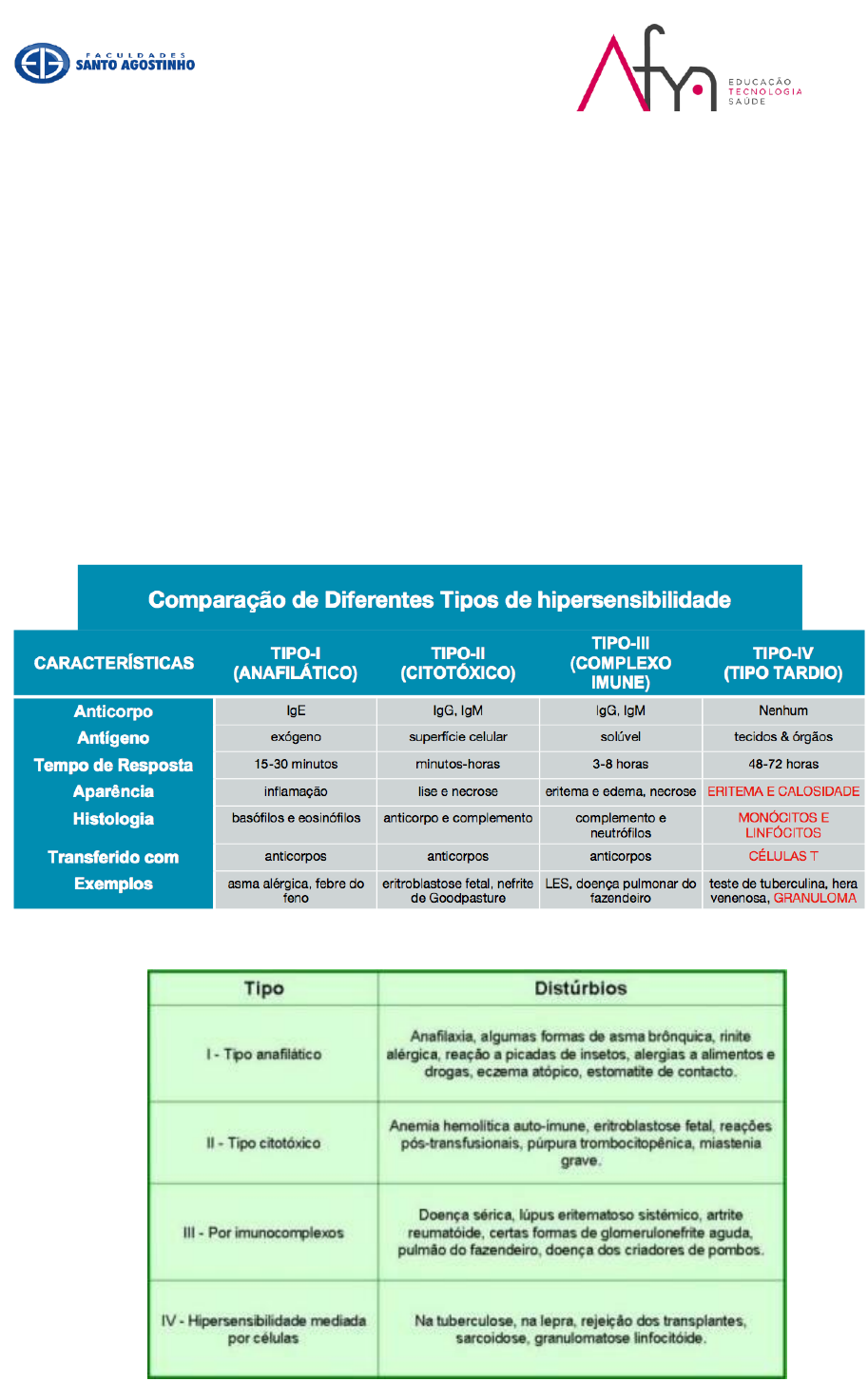 Faculdade Santos Agostinho – FASAI Componente Curricular: SOI III Turma: Medicina - 2021.2 Docente: Pedro Discentes: Francielle Santos Agostinho Pinheiro Diferenças entre os tipos de Hipersensibilidade Quando um indivíduo sofre uma estimulação imunológica anterior, o contato adicional com o antígeno leva a um reforço secundário da resposta imunitária. Entretanto, a reação pode ser excessiva e conduzir a grandes danos nos tecidos (hipersensibilidades), podendo ocorrer se o antígeno estiver presente em quantidades relativamente grandes ou se o estado imunológico humoral ou celular se encontrar em nível intensificado. 1. Hipersensibilidade tipo I: Reações de hipersensibilidade humoral tipo I ou atopias são estados inflamatórios de pele e/ou mucosas, mediados por Ig, mastócitos e basófilos com receptores de alta afinidade para IgE (RFcε 1). Outros mediadores altamente ativos que são liberados dos grânulos incluem o fator de plaquetas (PAF), heparina, certas enzimas e fatores quimiotáticos. As atopias podem ocorrer de forma localizada como rinite alérgica, dermatite atópica, asma brônquica, alergia alimentar atópica e atopias medicamentosas, ou de forma generalizada, levando ao choque anafilático. As reações inicialmente localizadas podem se tornar repetitivas ou generalizadas aumentando, assim, a morbidade e a mortalidade desses pacientes. 2. Hipersensibilidade tipo II: Citotoxidade celular ou hipersensibilidade citotóxica é uma reação de hipersensibilidade humoral tipo II, que resulta em lise da célula-alvo e em danos teciduais, levando a distúrbios funcionais e orgânicos deletérios ao indivíduo. Há lise da célula-alvo mediada por anticorpos contra antígenos da superfície celular que causam: fagocitose da célula pela atividade opsônica (Fc) ou imunoaderência (C3); citotoxidade extracelular não-fagocitária por células destruidoras com receptores para IgFc; e lise através da atuação de sistema complemento até C8 e C9. Dentre os quadros clínicos, podem ocorrer: ceratoconjuntivite tóxica, enteropatia perdedora de proteínas, reações por drogas, incompatibilidade ABO e eritroblastose fetal. 3. Hipersensibilidade tipo III: Reações por imunocomplexos ou doenças de imunocomplexos são reações de hipersensibilidade humoral tipo III, nas quais complexos formados por antígeno-anticorpo- complemento são responsáveis pela lesão tecidual. Foram descritas inicialmente como Doença do Soro. Os isótipos de imunoglobulinas mais envolvidos são IgM, IgG e, com menor freqüência, IgA, podendo os três isótipos estar presentes em imunocomplexos de um mesmo paciente. Causam ativação de granulócitos, macrófagos e da cascata do complemento, no local da inflamação, sendo a magnitude desta reação dependente da quantidade de imunocomplexos e da sua distribuição corporal. Tipos de reações: Doenças do soro, Doenças auto-imunes (artrite reumatóide, lúpus eritematoso sistêmico, dermatomiosite), Pneumonite ou alveolites, Reção de Arthus. 4. Hipersensibilidade tipo IV: As reações de hipersensibilidade tipo IV ou hipersensibilidade celular, ou ainda, reação tardia são mediadas por linfócitos timo-dependentes. A reação realiza-se pelos mecanismos habituais da resposta imunológica específica celular. Há estimulação dos linfócitos T com diferenciação final para T cititóxicos, auxiliares, T com função supressora, células T mémoria e T produtoras de citocinas. São estimulados pelo contato com o antígeno ligado ao macrófago, liberando linfocinas, sendo necessárias 24 a 72 horas para o desenvolvimento da reação inflamatória e por isto designa-se hipersensibilidade de tipo retardado. São exemplos de hipersensibilidade tipo IV: Teste de Mantoux para a sensibilidade à tuberculina, infecções por bactérias intracelulares, infecções fúngicas e virais, rejeição crônica a transplantes, fotodermatites, etc. Referências: BIER,O.,SILVA, W.D.da & MOTA,I. Imunologia Básica e Aplicada. 5ª ed. Rio de Janeiro, Guanabara- Koogan, 2003.388p FISCHDICK, Hazel de Andrade; AMORIM, Natale Ferreira Gontijo. Caracterização e tratamento cirúrgico das complicações após injeção de PMMA na face. Revista Oficial do Instituto Ivo Pitanguy e associação de ex-alunos do prof. Ivo Pitanguy, 2016.