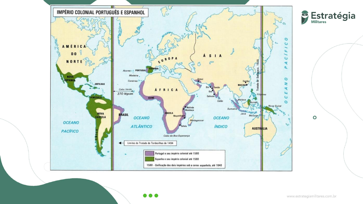 AULA 01 – História – Prof. Marco TúlioBRASIL COLÔNIA I – Prof. Marco Túlio Mapa dos impérios português e espanhol. Fonte: ARRUDA, José Jobson de A. Atlas histórico básico. 17ª ed. São Paulo: Ática, 2008.p. 20. AULA 01 – História – Prof. Marco TúlioBRASIL COLÔNIA I – Prof. Marco Túlio TRATADO DE TORDESILHAS (1494) ❑ Bula Inter Coetera (1493) → Arbitrado pelo papa Alexandre VI, o documento traçou uma linha imaginária situada a 100 léguas do Arquipélago de Cabo Verde, ficando acordado que os territórios dispostos a leste deste marco eram posse de Portugal, enquanto a porção oeste seria de propriedade do reino de Espanha. ❑ Tratado de Tordesilhas (1494) → Traçou uma nova linha imaginária, situada a 370 léguas de Cabo Verde, o que permitiu a Portugal garantir sua porção de terras no Novo Mundo. O acordo estabeleceu as terras a leste do meridiano para Portugal, e as terras a oeste para a Espanha. AULA 01 – História – Prof. Marco TúlioBRASIL COLÔNIA I – Prof. Marco Túlio Mapa dos impérios português e espanhol. Fonte: ARRUDA, José Jobson de A. Atlas histórico básico. 17ª ed. São Paulo: Ática, 2008.p. 20.