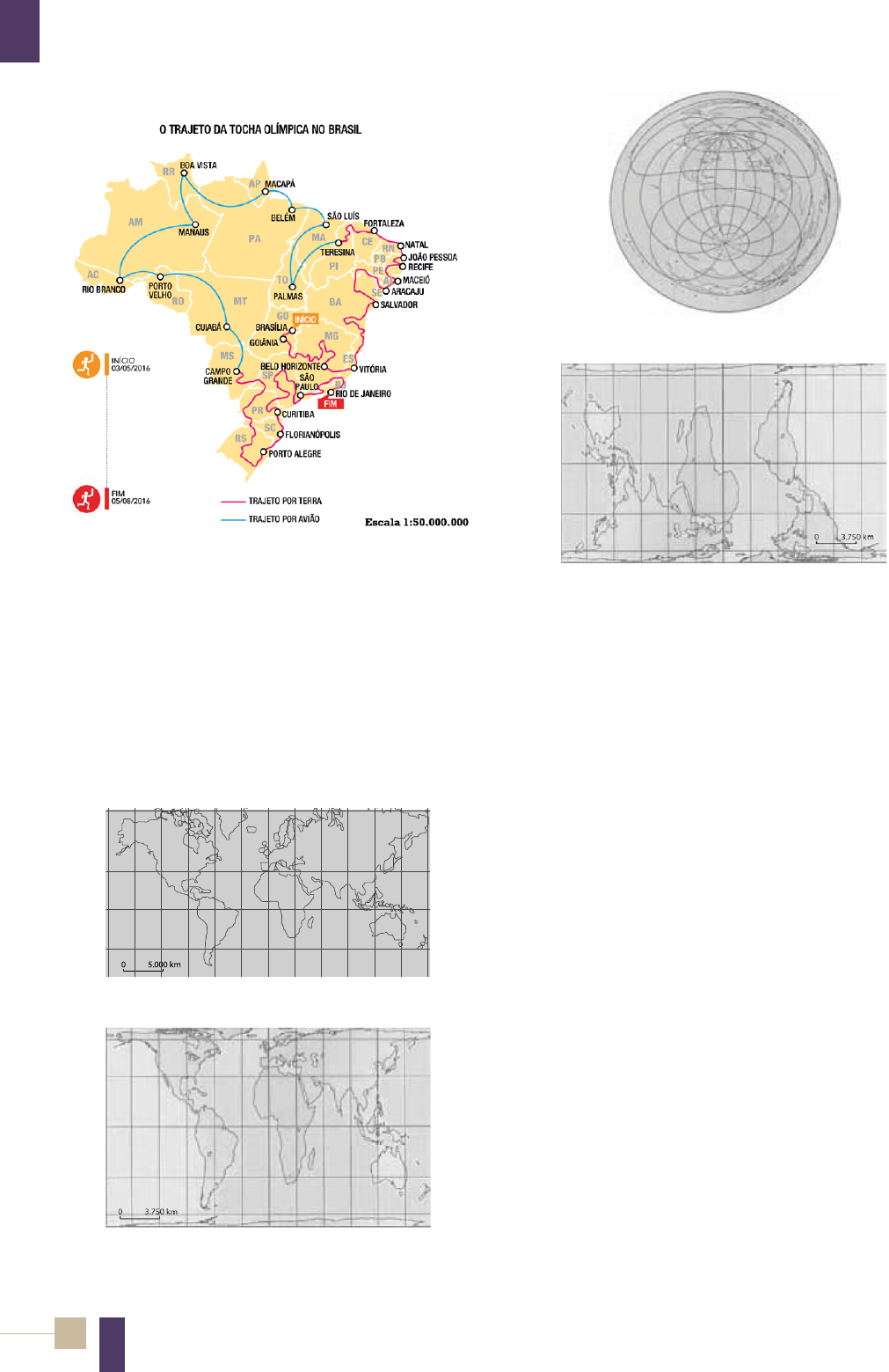 6 Adaptado de portaldarmc.com.br No mapa, o trajeto total da tocha olímpica em território bra- sileiro mede cerca de 72 cm, considerando os trechos por via aérea e por terra. A distância real, em quilômetros, percorrida pela tocha em seu trajeto completo, é de aproximadamente: A 3 600 B 7 000 C 36 000 D 70 000 7 Analise as diferentes projeções cartográficas. (Lygia Terra e Marcos Coelho. Geografia geral e geografia do Brasil, 2005. Adaptado.) (Lygia Terra e Marcos Coelho. Geografia geral e geografia do Brasil, 2005. Adaptado.) (James Tamdjan e Ivan Mendes. Geografia geral e do Brasil, 2005. Adaptado.) (James Tamdjan e Ivan Mendes. Geografia geral e do Brasil, 2005. Adaptado.) Considerando conhecimentos geográficos sobre projeções cartográficas, é correto afirmar que elas A respeitam os mesmos graus de proporcionalidade, con- formidade, equidistância e orientação, regras e conven- ções que garantem rigor na representação do planeta. B podem ser admitidas como representações fiéis da realidade, pois expressam de forma precisa e rigorosa o planeta como ele é. C trazem consigo diferentes formas de representação do planeta, buscando difundir ideologias e determinadas visões de mundo. D se caracterizam pela objetividade e neutralidade, sem que fatores de ordem política, técnica ou cultural te- nham influência sobre as formas de representação do planeta. E são relações métricas entre a superfície do planeta e as áreas representadas no mapa, não apresentando distor- ções e deformações em relação à realidade. GEOGRAFIA – FRENTE 1562 ATIVIDADE 2 Coordenadas geográficas e representações cartográficas 2020-PV-GEO-OCTA+-V1-F1.INDD / 22-10-2019 (10:31) / ANDERSON.OLIVEIRA / PDF GRAFICA 2020-PV-GEO-OCTA+-V1-F1.INDD / 22-10-2019 (10:31) / ANDERSON.OLIVEIRA / PDF GRAFICA 6 Adaptado de portaldarmc.com.br No mapa, o trajeto total da tocha olímpica em território bra- sileiro mede cerca de 72 cm, considerando os trechos por via aérea e por terra. A distância real, em quilômetros, percorrida pela tocha em seu trajeto completo, é de aproximadamente: A 3 600 B 7 000 C 36 000 D 70 000 7 Analise as diferentes projeções cartográficas. (Lygia Terra e Marcos Coelho. Geografia geral e geografia do Brasil, 2005. Adaptado.) (Lygia Terra e Marcos Coelho. Geografia geral e geografia do Brasil, 2005. Adaptado.) (James Tamdjan e Ivan Mendes. Geografia geral e do Brasil, 2005. Adaptado.) (James Tamdjan e Ivan Mendes. Geografia geral e do Brasil, 2005. Adaptado.) Considerando conhecimentos geográficos sobre projeções cartográficas, é correto afirmar que elas A respeitam os mesmos graus de proporcionalidade, con- formidade, equidistância e orientação, regras e conven- ções que garantem rigor na representação do planeta. B podem ser admitidas como representações fiéis da realidade, pois expressam de forma precisa e rigorosa o planeta como ele é. C trazem consigo diferentes formas de representação do planeta, buscando difundir ideologias e determinadas visões de mundo. D se caracterizam pela objetividade e neutralidade, sem que fatores de ordem política, técnica ou cultural te- nham influência sobre as formas de representação do planeta. E são relações métricas entre a superfície do planeta e as áreas representadas no mapa, não apresentando distor- ções e deformações em relação à realidade. GEOGRAFIA – FRENTE 1562 ATIVIDADE 2 Coordenadas geográficas e representações cartográficas 2020-PV-GEO-OCTA+-V1-F1.INDD / 22-10-2019 (10:31) / ANDERSON.OLIVEIRA / PDF GRAFICA 2020-PV-GEO-OCTA+-V1-F1.INDD / 22-10-2019 (10:31) / ANDERSON.OLIVEIRA / PDF GRAFICA 8 Com o objetivo de representar, o mais próximo possível do real, o espaço geográfico, os cientistas usaram as proje- ções cartográficas. As mais utilizadas são as de Mercator e Peters, representadas pelas figuras a seguir. Com base nos conhecimentos sobre projeções cartográfi- cas, assinale a alternativa correta. A Na projeção de Peters, o espaçamento entre os para- lelos aumenta da linha do equador para os polos, en- quanto o espaçamento entre os meridianos diminui a partir do meridiano central. B Na projeção de Mercator, o espaçamento entre os pa- ralelos diminui da linha do equador para os polos, en- quanto o espaçamento entre os meridianos aumenta a partir do meridiano central. C Na projeção de Peters, o plano da superfície de proje- ção é tangente à esfera terrestre (projeção azimutal); já na projeção de Mercator, o plano da superfície de pro- jeção é um cone (projeção cônica) envolvendo a esfera terrestre. D Na elaboração de uma projeção cartográfica, o planisfé- rio de Peters mantém as distâncias proporcionais entre os elementos do mapa, aumentando o comprimento do meridiano central. E A projeção de Mercator é desenvolvida em um cilin- dro, sendo mantida a propriedade forma; essa projeção mostra uma visão de mundo eurocêntrica. 9 Analise os mapas abaixo e assinale a alternativa que indi- que a resolução cartográfica mais adequada para represen- tar, com precisão, as distâncias da cidade de São Paulo em relação às várias localidades do mundo. A Projeção Azimutal Equidistante (Soukup) B Projeção Cilíndrica Conforme (Mercator) C Projeção Equivalente Interrompida (Good) D Projeção Equivalente (com base em Mollweide) E Projeção Cilíndrica Equivalente (Peters) Adap. Ferreira, 1998. GEOGRAFIA – FRENTE 1 ATIVIDADE 2 Coordenadas geográficas e representações cartográficas 563 2020-PV-GEO-OCTA+-V1-F1.INDD / 22-10-2019 (10:31) / ANDERSON.OLIVEIRA / PDF GRAFICA 2020-PV-GEO-OCTA+-V1-F1.INDD / 22-10-2019 (10:31) / ANDERSON.OLIVEIRA / PDF GRAFICA 1 Enem PPL 2015 QUEIROZ FILHO, A. P.; BIASI, M. “Técnicas de cartografia”. In: VENTURI, L. A. B. (Org.). Geografia: práticas de campo, laboratório e sala de aula. São Paulo: Sarandi, 2011 (adaptado). As figuras representam a distância real (D) entre duas resi- 