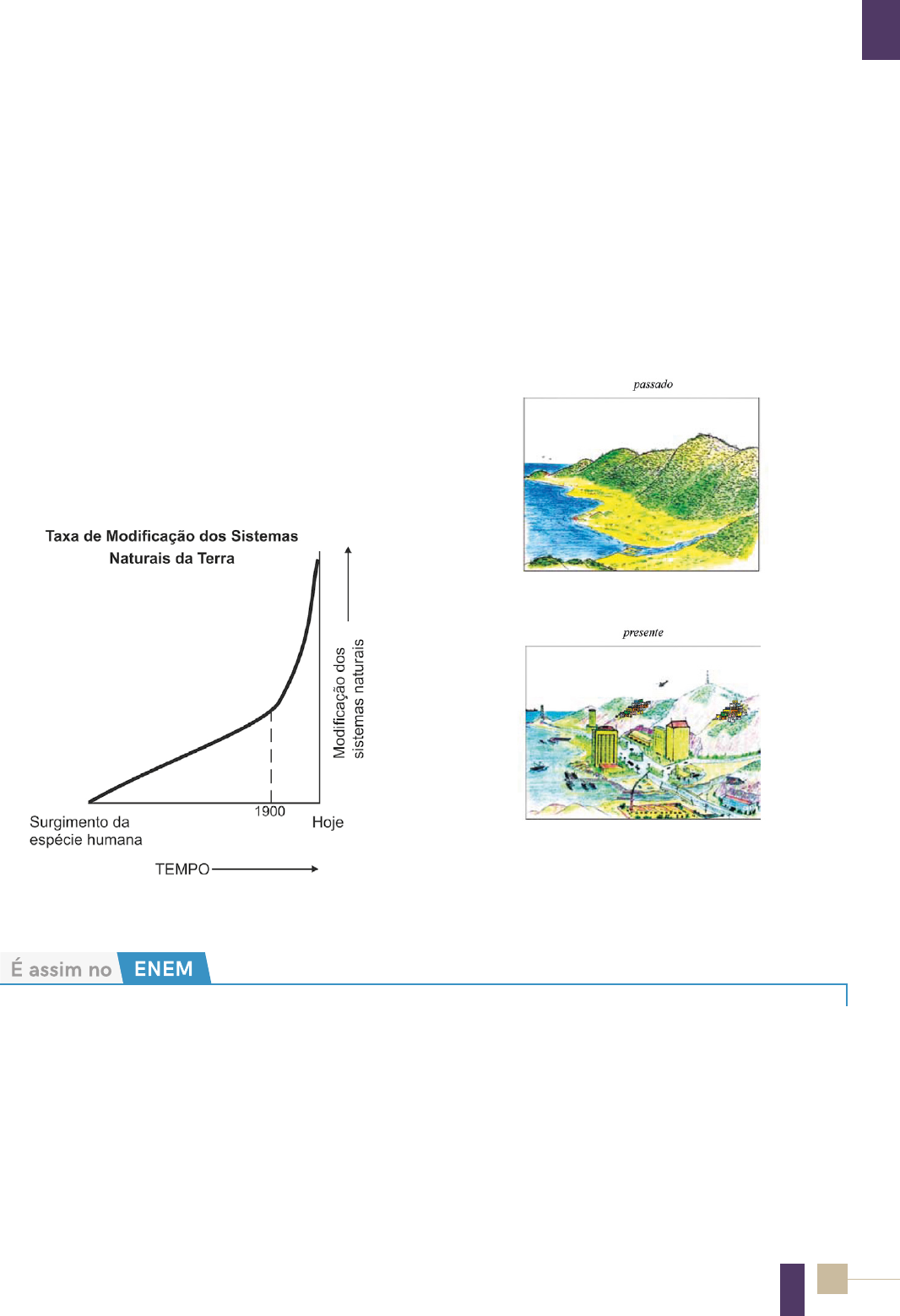 GEOGRAFIA – FRENTE 2612 ATIVIDADE 1 Do meio natural ao meio técnico-científico-informacional Que é feito de tua prosa, onde a morena sorria com toda noite nos olhos e na boca, todo dia. MEIRELES, Cecília. Viagem. As estrofes anteriores exemplificam uma estreita relação en- tre Geografia e Literatura. Em Província, pode-se observar a presença de dois conceitos geográficos. Assinale a opção que corresponde a esses dois conceitos. A Território e lugar. B Paisagem e lugar. C Região e território. D Paisagem e território 6 Texto IX A história do homem sobre a Terra é a história de uma ro- tura progressiva entre o homem e o entorno. Esse processo se acelera quando, praticamente ao mesmo tempo, o homem se descobre como indivíduo e inicia a mecanização do pla- neta, armando-se de novos instrumentos para tentar domi- ná-lo. A natureza artificializada marca uma grande mudança na história humana da natureza. Hoje, com a tecnociência, alcançamos o estágio supremo dessa evolução. SANTOS, Milton. Técnica, espaço, tempo: globalização e meio técnico científico informacional. Hucitec: São Paulo, 1998. p. 17. O Texto IX tem como temática aspectos da relação homem- -natureza em diferentes épocas. A partir do mesmo e utili- zando seus conhecimentos geográficos, assinale a alternativa correta sobre esta relação. A O avanço do meio técnico-científico informacional pos- sibilitou uma maior preservação da natureza, haja vista que as indústrias modernas utilizam tecnologia que res- tringe a poluição ambiental; além do fato de que, nas so- ciedades contemporâneas, há maior preocupação com a preservação do meio ambiente. B As sociedades contemporâneas têm um grande consu- mo de energia devido ao emprego de tecnologias que facilitam a comunicação, levando muitos países à maior exploração das fontes energéticas com redução dos im- pactos ambientais, principalmente nos rios e florestas, graças à utilização de tecnologias modernas na apropria- ção dos recursos naturais renováveis. C A tecnociência tem, entre seus princípios básicos, a uti- lização intensa da mão de obra humana, o estímulo à preservação da natureza e redução da ação do homem sobre esta, que ainda se apresenta impotente frente às grandes tragédias da natureza, a exemplo dos furacões e tsunamis. D Nas sociedades primitivas, cada grupo humano construía seu espaço de vida com as técnicas que inventava para tirar da natureza os elementos indispensáveis à sua so- brevivência; organizava a produção, sua vida social e o espaço geográfico na medida de suas próprias forças e necessidades. E Nos dias atuais, os objetos tecnológicos que nos servem são cada vez mais técnicos, criados para atender finalida- des específicas, facilitando as comunicações, mudando as relações sociais, interpessoais e com a natureza, gra- ças às políticas estatais de diversos países estimulados pelas Conferências Mundiais sobre o Meio Ambiente, a exemplo da Rio+20. 7 O espaço geográfico agora mundializado redefine-se pela combinação de signos. Seu estudo supõe que se levem em conta esses novos dados revelados pela modernização e pelo capitalismo agrícola, pela especialização regional das ativi- dades, por novas formas e localização das indústrias. SANTOS, Milton. Técnica, espaço e tempo. Rio de Janeiro: Hucitec, 1996. O trecho anterior expressa novas determinações do espaço geográfico identificadas com: A os territórios de exclusão. B as paisagens distópicas. C o meio técnico científico e informacional. D a redefinição de hierarquias urbanas. 8 Observe as imagens: TERRA, Lygia; ARAÚJO, Regina; GUIMARÃES, Raul Borges. Conexões: estudos de geografia geral e do Brasil. 1. ed. São Paulo: Moderna, 2008. p. 16. As figuras mostram concepções de pessoas, feitas há cerca de cem anos, sobre como seria o cotidiano no século XXI. Em relação ao Brasil, essas concepções estavam: 2020_OCTA+_V1_GEO_F2.INDD / 22-10-2019 (17:00) / ANDERSON.OLIVEIRA / PDF GRAFICA GEOGRAFIA – FRENTE 2 ATIVIDADE 1 Do meio natural ao meio técnico-científico-informacional 613 I. corretas, porque houve tanto a verticalização das cons- truções em grandes e médias cidades brasileiras como o progresso tecnológico dos meios de transporte e comunicação. II. erradas, porque houve a manutenção das paisagens ape- sar das marcas das técnicas e do trabalho humano. III. corretas, porque a evolução das técnicas tornou possível empregar conhecimentos, instrumentos e habilidades, destacando o meio técnico e incorporando às paisagens marcas do trabalho humano. Está(ão) correta(s) A apenas I. B apenas II. C apenas I e III. D apenas II e III. E I, II e III. 9 Analise este gráfico: Fonte: COATES, Donald Robert. Environmental Geology. New York: John Wiley & Sons, 1981. p. 23. 1. A partir dessa análise e considerando outros conhecimen- tos sobre o assunto, cite e explique duas razões que justifi- cam a elevada taxa de modificação dos sistemas naturais do planeta verificada a partir de 1900. 2. Leia esta afirmativa: “A alteração antrópica dos sistemas naturais do Planeta, ini- ciada com o surgimento da espécie humana, vem sendo res- ponsável pela produção do espaço geográfico.” Você concorda ou não com essa afirmativa? Justifique sua resposta. 10 Observe as figuras. Fonte: COATES, Donald Robert. Environmental Geology. New York: John Wiley & Sons, 1981. p. 23. GIOMETTI, Analúcia et al. (orgs.). Pedagogia cidadã – ensino de Geografia, 2006. (Adapt.) Faça uma análise espaço-temporal da paisagem, identifican- do quatro transformações feitas pelo homem. As questões selecionadas nesta seção são prioritariamente do Enem, mas questões de vestibulares diversos que apresentam características semelhantes aos itens do referido exame também foram usadas como recurso para estudo. 1 Enem O homem construiu sua história por meio do cons- tante processo