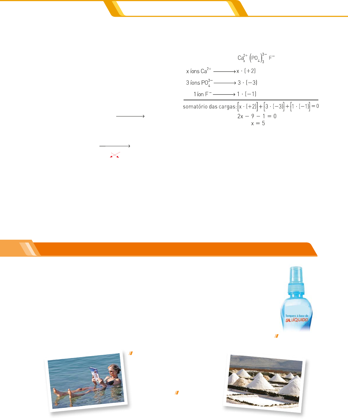 251CAPÍTULO 15 | LIGAÇÕES IÔNICAS OU ELETROVALENTES 1. Um elemento X, cujo número atômico é 12, com- bina-se com um elemento Y, situado na família 15 da tabela periódica, e resulta em um compos- to iônico cuja fórmula provável será: a) XY. b) XY2. c) X2Y. d) X2Y3. e) X3Y2. Solução Inicialmente, devemos fazer a distribuição eletrô- nica do elemento X: 12 X — 1s2 / 2s2 2p6 / 3s2 perde 2 e 2 X21 Como o elemento Y está na família 15, ele apre- senta cinco elétrons na sua camada de valência: Y e 3 e2 Y 32 fórmula iônica: X Y X 3 Y 2 receb 21 3 32 2 Resposta: alternativa e. 2. Considere os íons: Ca21, PO4 32 e F2. A combinação desses íons pode resultar na fluorapatita, mineral presente nos dentes, cuja fórmula química pode ser representada por Cax(PO4)3F. O valor de x nes- sa fórmula é: a) 1. b) 2. c) 3. d) 4. e) 5. Exercícios resolvidos Solução Como sabemos, o somatório das cargas deve ser igual a zero e, pela fórmula, temos: Resposta: alternativa e. 3. Considere os cátions e ânions abaixo e represen- te as fórmulas dos compostos iônicos fosfato de amônio e cloreto de potássio. • cátion potássio — K1 • cátion amônio — NH4 1 • ânion cloreto — C2 • ânion fosfato — PO4 32 Solução Fosfato de amônio: NH PO4 4 31 2 → (NH4)3PO4 Cloreto de potássio: K1C2 → KC O composto iônico mais comum O principal componente do sal de cozinha é o cloreto de sódio, um composto químico for- mado há milhões de anos. O sal pode ser encontrado nos mares ou em locais que foram co- bertos por camadas de sedimentos. É largamente empregado na alimentação humana e animal e em um grande número de indústrias: de tecidos, metais, plásticos, borracha, etc. A produção de sal marinho varia ao longo do ano de acordo com as condições meteo- rológicas de cada região. No Brasil, a produtividade é pequena no Rio de Janeiro e Ceará, menor ainda no Maranhão, em Sergipe e na Bahia e alcança maiores índices no Rio Gran- de do Norte, na zona compreendida entre Macau, Mossoró e Areia Branca. As fotografias mostradas estão relacionadas com o cloreto de sódio. Fundamentando seus conhecimentos R e p ro d u ç ã o / A rq u iv o d a e d it o ra Embalagem de “sal líquido”. O banho de mar é muito comum nas regiões litorâneas. Nessa imagem, mulher flutua no mar Morto (Jordânia, 2007). Salinas na ilha de Lanzarote, Canárias, em 2012. FA N t ra v e ls to ck /A la m y / F o to a re n a i m a g o s to ck & p e o p le /G ru p o K e y s to n e 1CONECTEQuim_MERC18Sa_U5_Cap15_p243a256.indd 251 7/2/18 1:39 PM 252 UNIDADE 5 | INTERAÇÕES ATÔMICAS E INTERMOLECULARES Com base nas informações e no que você já viu em capítulos anteriores, responda às questões de 1 a 5. 1. Qual é o nome do processo utilizado, nas salinas, para se extrair o sal da água do mar? 2. Explique por que uma pessoa consegue boiar nas águas do mar Morto enquanto lê uma revista. 3. Na água do mar, existem vários íons dissolvidos, tais como: • cátion sódio Na1. • cátion magnésio Mg21. • cátion potássio K1. • ânion cloreto C2. • ânion iodeto I2. • ânion sulfato SO 4 22. Sabendo que os compostos iônicos são resultan- tes da combinação entre cátions e ânions, for- mando substâncias em que a carga total é igual a zero, escreva, no caderno, as fórmulas dos com- postos iônicos: a) cloreto de sódio; b) iodeto de potássio; c) sulfato de magnésio; d) cloreto de magnésio; e) sulfato de sódio. 4. Cite quatro propriedades comuns a todas as subs- tâncias da questão anterior. 5. O que está incorreto no rótulo da embalagem de “sal líquido” reproduzida na página anterior? 6. Os compostos iônicos, no nosso dia a dia, são utilizados de várias maneiras. Elemento Número atômico (Z) Uso do íon flúor (F) 9 O íon fluoreto está presente nos cremes dentais e sua função é evitar a formação de cáries. alumínio (A) 13 O íon do alumínio faz parte da bauxita (minério de alumínio). enxofre (S) 16 O íon do enxofre (sulfeto) é o responsável pelo escurecimento de objetos de prata. cálcio (Ca) 20 O íon do cálcio está presente nos ossos. Escreva, no caderno, a fórmula do composto re- sultante da combinação entre: a) Ca e F; b) Ca e S; c) A e F; d) A e S. Água mineral Observando o rótulo de uma garrafa de água mineral, você irá notar que na sua composição química são indicados vários íons. Consulte as tabelas presentes neste capítulo e escreva, em seu caderno, as fórmulas desses íons. EXPLORE SEU MUNDO Desenvolvendo seus conhecimentos Sempre que necessário, consulte a tabela periódica. 1. A seguir são dadas as configurações eletrônicas dos átomos A e B. A: 1s2 2s2 2p6 3s2 3p6 4s1 B: 1s2 2s2 2p6 3s2 3p5 O cátion, o ânion e o composto formado por A e B são, respectivamente: a) A1, B2, AB. b) B1, A22, B 2 A. c) B21, A2, BA 2 . d) A21, B2, AB 2 . X 2. A figura a seguir mostra alguns elementos dos 2o e 3o períodos da tabela periódica. A combina- ção dos elementos mostrados, dois a dois, forma três compostos iônicos. Com esses dados, es- creva a fórmula desses compostos. Na 1 2 13 14 15 16 17 18 Mg Aø F B a n c o d e i m a g e n s / A rq u iv o d a e d it o ra 1CONECTEQuim_MERC18Sa_U5_Cap15_p243a256.indd 252 7/2/18 1:39 PM F e rn a n d a C re v in /A rq u iv o d a e d it o ra 253CAPÍTULO 15 | LIGAÇÕES IÔNICAS OU ELETROVALENTES 3. Considere os compostos formados pelos pares: I. 20 Ca e 17 C. II. 12 Mg e 16 S. III. 11 Na e 8 O. IV. 3 Li e 9 F. Determine a proporção entre as quantidades de cátions e de ânions nas fórmulas desses compostos. Leia o texto para responder à questão a seguir. Cinco amigos estavam estudando para a prova de Química e decidiram fazer um jogo com os ele- mentos da Tabela Periódica: • cada participante selecionou um isótopo dos elementos da Tabela Periódica e anotou sua escolha em um cartão de papel; • os jogadores Fernanda, Gabriela, Júlia, Paulo e Pedro decidir