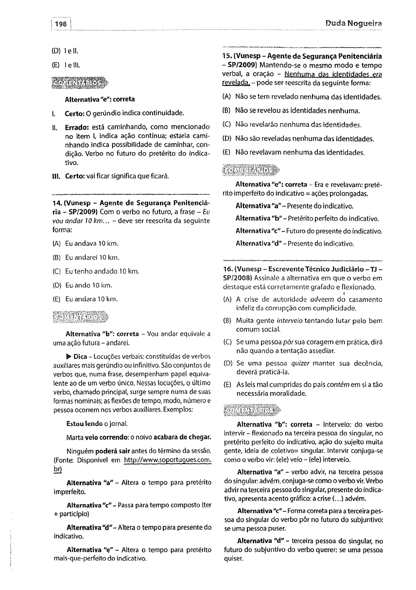 (D) lell. (E) I e 111. Alternativa "e": correta I. Certo: O gerúndio indica continuidade. 11. Errado: está caminhando, como mencionado no item I, indica ação contínua; estaria cami- nhando indica possibilidade de caminhar, con- dição. Verbo no futuro do pretérito do indica- tivo. 111. Certo: vai ficar significa que ficará. 14. (Vunesp- Agente de Segurança Penitenciá- ria - SP/2009) Com o verbo no futuro, a frase - Eu vou andar 1 O km ... - deve ser reescrita da seguinte forma: (A) Eu andava 10 km. (B) Eu andarei 10 km. (C) Eu tenho andado 1 O km. (D) Eu ando 10 km. (E) Eu andara 1 O km. Alternativa "b": correta - Vou andar equivale a uma ação futura- andarei. li>' Dica- Locuções verbais: constituídas de verbos auxiliares mais gerúndio ou infinitivo. São conjuntos de verbos que, numa frase, desempenham papel equiva- lente ao de um verbo único. Nessas locuções, o último verbo, chamado principal, surge sempre numa de suas formas nominais; as flexões de tempo, modo, número e pessoa ocorrem nos verbos auxiliares. Exemplos: Estou lendo o jornal. Marta veio correndo: o noivo acabara de chegar. Ninguém poderá sair antes do término da sessão. (Fonte: Disponível em http:/ /www.soportugues.com. M Alternativa "a" - Altera o tempo par a pretérito imperfeito. Alternativa "c"- Passa para tempo composto (ter +particípio) Alternativa "d"- Altera o tempo para presente do indicativo. Alternativa "e" - Altera o tempo para pretérito mais-que-perfeito do indicativo. 15. (Vunesp -Agente de Segurança Penitenciária - SP/2009} Mantendo-se o mesmo modo e tempo verbal, a oração - Nenhuma das identidades e@ ~- pode ser reescrita da seguinte forma: (A) Não se tem revelado nenhuma das identidades. (B) Não se revelou as identidades nenhuma. (C) Não revelarão nenhuma das identidades. (D) Não são reveladas nenhuma das identidades. (E) Não revelavam nenhuma das identidades. Alternativa "e": correta - Era e revelavam: preté- rito imperfeito do indicativo= ações prolongadas. Alternativa "a"- Presente do indicativo. Alternativa "b"- Pretérito perfeito do indicativo. Alternativa "c"- Futuro do presente do indicativo. Alternativa "d"- Presente do indicativo. ---·--------- 16. (Vunesp- Escrevente Técnico Judiciário- TJ- SP/2008) Assinale a alternativa em que o verbo em destaque está corretamente grafado e flexionado. ' (A) A crise de autoridade adveem do casamento infeliz da corrupção com cumplicidade. (B) Muita gente interveio tentando lutar pelo bem comum social. (C) Se uma pessoa pôr sua coragem em prática, dirá não quando a tentação assediar. (D) Se uma pessoa quizer manter sua decência, deverá praticá-la. (E) As leis mal cumpridas do país contém em si a tão necessária moralidade. Alternativa "b": correta - Interveio: do verbo intervir- flexionado na terceira pessoa do singular, no pretérito perfeito do indicativo, ação do sujeito muita gente, ideia de coletivo= singular. Intervir conjuga-se como o verbo vir: (ele) veio- (ele) interveio. Alternativa "a" - verbo advir, na terceira pessoa do singular: advém, conjuga-se como o verbo vir. Verbo advir na terceira pessoa do singular, presente do indica- tivo, apresenta acento gráfico: a crise( ... ) advém. Alternativa"c"- Forma correta para a terceira pes- soa do singular do verbo pôr no futuro do subjuntivo: se uma pessoa puser. Alternativa "d"- terceira pessoa do singular, no futuro do subjuntivo do verbo querer: se uma pessoa quiser. Alternativa "e" - Verbo conter: presente do indi· cativo, terceira pessoa do plural, apresenta o acento cir· cunflexo conforme o verbo ter. As leis (têm) contêm. 17. (Vunesp- Escrevente Técnico Judiciário - TJ - SP/2008) Assinale a alternativa em que a correlação entre os tempos verbais está correta. (A) Seria importante que você mantesse todos os seus dados em dia. (B) Será importante que você mantém todos os seus dados em dia. (C) Seria importante que você mantivesse todos os seus dados em dia. (0) Era importante que você manteria todos os seus dados em dia. (E) Foi importante que você mantinha todos os seus dados em dia. Alternativa "c": correta - Seri2: futuro do preté· rito do indicativo - afirmação condi:ional (exprime incerteza, probabilidade). Mantivesse: tempo: preté· rito imperfeito do subjuntivo (exprimindo vontade ou comando). Alternativa "a"- Forma verbal correta: mantivesse = verbo manter: segue o mesmo paradigma do verbo ter: pretérito imperfeito do subjuntivc= tivesse /man· tivesse. Alternativa "b"- Forma verbal correta: mantenha - noção presente do subjuntivo temporal no presente do subjuntivo, quase como uma ordem imperativa para o futuro. Será- importante que você mantenha. Alternativa "d"- Era- tempo: pretérito imperfeito do indicativo (designa um fato passado não concluído). Manteria - tempo: futuro do pretérito do indicativo - indicando uma condição futura hipotét:Gl r0ferente a fato passado que não se realizou. Alternativa "e"- Foi e mantinl1a. Não há correia· ção de tempos verbais. Foi -tempo: pretérito perfeito do indicativo= ação concluída. Mantinha- tempo: pre· térito imperfeito do indicativo= ação passada mas não concluída. Haveria correlação de tempo verbal com relação a forma foi da primeira oração em ... foi impor· tante que você mantivesse todos ... , no tempo: preté· rito imperfeito do subjuntivo. @ Charge: AQUECIMENTO GLOBAL (www.chargeonline.com.br) 18. (Vunesp - Escrevente Técnico Judiciário - TJ - SP/2008) Considerando-se o interlocutor do urso como VOCt, as formas verbais no imperativo devem assumir as seguintes flexões: (A) vá veja·- avise. (8) vai veja ·-·avisa. (C) vais vejos - avísas. (0) vá- vejo -avisa. (E) vai -vê·- avise. Alternativa "a": correta - Vá (você) - veja (você) - avise (você), todas as formas verbais estão no impe· r ativo afirmativo e são retiradas do presente do subjun· tivo: lrriperati".O afirmativo ;: P.resi!nt.~ do sUbjuntiV() ) que eu 
