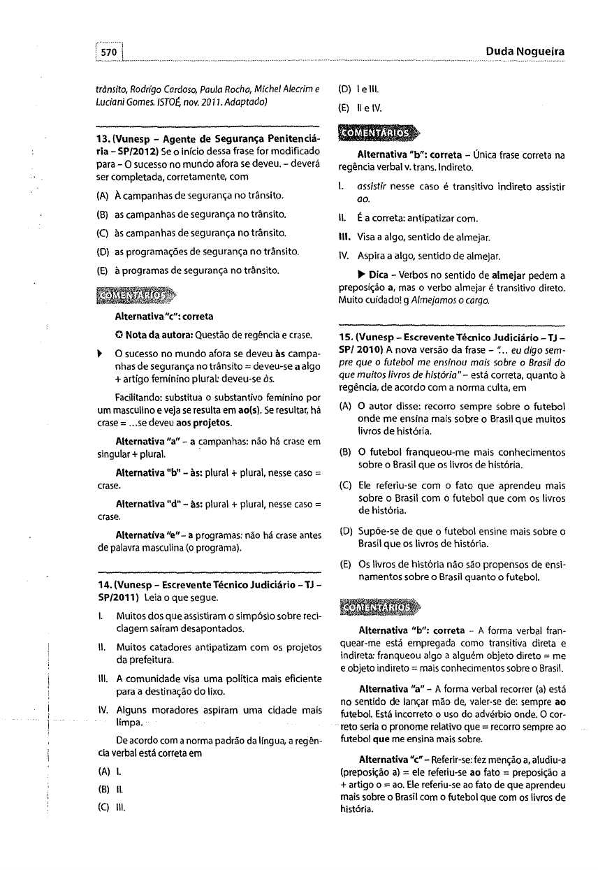 570 trdnsito, Rodrigo Cardoso, Paula Rocha, Michel Alecrim e Luciani Gomes. ISTO É, nov. 2011. Adaptado) 13. (Vunesp - Agente de Segurança Penitenciá- ria- SP/2012) Se o início dessa frase for modificado para- O sucesso no mundo afora se deveu.- deverá ser completada, corretamente, com (A) À campanhas de segurança no trânsito. (B) as campanhas de segurança no trânsito. (C) às campanhas de segurança no trânsito. (D) as programações de segurança no trânsito. (E) à programas de segurança no trânsito. Alternativa "c": correta O Nota da autora: Questão de regência e crase. ~ O sucesso no mundo afora se deveu às campa- nhas de segurança no trânsito= deveu-se a algo +artigo feminino plural: deveu-se às. Facilitando: substitua o substantivo feminino por um masculino e veja se resulta em ao(s). Se resultar, há crase= ... se deveu aos projetos. Alternativa "a" - a campanhas: não há crase em singular + plural. · Alternativa "b" - às: plural + plural, nesse caso = crase. Alternativa "d" - às: plural + plural, nesse caso = crase. Alternativa "e"- a programas: não há crase antes de palavra masculina (o programa). 14. (Vunesp- Escrevente Técnico Judiciário- TJ- SP/2011) Leia o que segue. Muitos dos que assistiram o simpósio sobre reci- clagem saíram desapontados. 11. Muitos catadores antipatizam com os projetos da prefeitura. 111. A comunidade visa uma politica mais eficiente para a destinação do lixo. IV. Alguns moradores aspiram uma cidade mais limpa. De acordo com a norma padrão da lfngua, a regên- cia verbal está correta em (A) l. (B) ll (C) 111. (O) lelll. (E) lleiV. Alternativa "b": correta - Única frase correta na regência verbal v. trans.lndireto. I. assistir nesse caso é transitivo indireto assistir ao. 11. t a correta: antipatizar com. 111. Visa a algo, sentido de almejar. IV. Aspira a algo, sentido de almejar. ,. Dica - Verbos no sentido de almejar pedem a preposição a, mas o verbo almejar é transitivo direto. Muito cuidado! g Almejamos o cargo. 1 S. (Vunesp- Escrevente Técnico Judiciário- TJ- SP/2010) A nova versão da frase- ·: .. eu digo sem- pre que o futebol me ensinou mais sobre o Brasil do que muitos livros de história"- está correta, quanto à regência, de acordo com a norma culta, em (A) O autor disse: recorro sempre sobre o futebol onde me ensina mais sobre o Brasil que muitos livros de história. (B) O futebol franqueou-me mais conhecimentos sobre o Brasil que os livros de história. (C) Ele referiu-se com o fato que aprendeu mais sobre o Brasil com o futebol que com os livros de história. (0) Supõe-se de que o futebol ensine mais sobre o Brasil que os livros de história. (E) Os livros de história não são propensos de ensi- namentos sobre o Brasil quanto o futebol. Alternativa "b": correta - A forma verbal fran- quear-me está empregada como transitiva direta e indireta: franqueou algo a alguém objeto direto = me e objeto indireto = mais conhecimentos sobre o Brasil. Alternativa "a"- A forma verbal recorrer (a) está no sentido de lançar mão de, valer-se de: sempre ao futebol. Está incorreto o uso do advérbio onde. O cor- reto seria o pronome relativo que = recorro sempre ao futebol que me ensina mais sobre. Alternativa "c"- Referir-se: fez menção a, aludiu-a (preposição a) = ele referiu-se ao fato = preposição a + artigo o = ao. Ele referiu-se ao fato de que aprendeu mais sobre o Brasil com o futebol que com os livros de história. Alternativa "d" - Supõe-se: verbo supor (T.D.) = presumiu= supõe algo. Supõe-se que o futebol (O.D.). Alternativa "e"- Propenso (adíetivo): ser favorá- vel a algo. Não são propensos a ensinamentos sobre o Brasil. Quanto (adv. de intensidade r.o sentido compa- rativo). Propensa a ... (tanto) quanto ao futebol (o é). 16. (Vunesp - Escrevente Técnico Judidário - TJ - SP/ 2010) As frases do trecho- Concordo que o futebol não é importante, que a:. pessoas lhe dão muita importância, que um time de 11 marmanjos serve como modelo para uma nação. - estão corre- tamente reescritas em: (A) Atenho-me à ideia de que o futebol não é importante, de que as pessoas supervalorizam- ·no, de que um time de 11 marmanjos presta-se a modelo para uma nação. (B) Atenho-me a ideia de que o futebol não é importante, de que as pessoas supervalorizam- -lo, de que um time de 11 marmanjos presta-se a modelo para uma nação. (C) Atenho-me à ideia de que o futebol não é importante, de que as pessoas supervalorizam- ·lhe,de que um time de 11 rrarmanjos presta-se à modelo para uma nação. (D) Atenho-me a ideia de que o futebol não é importante, de que as pessoas supervalorizam- ·no, de que um time de 11 marmanjos presta-se a modelo para uma nação. (E) Atenho-me a ideia de que o futebol não é importante, de que as pessoas supervalorizam ele, de que um time de 11 narmanjos presta-se à modelo para uma nação. Alternativa "a": correta. l> Atenho-me à ideia = atenho-me ao valor. Elimi- nadas alternativas b, de e. l> Supervalorizar é transitivo direto (admite o pro- nome oblíquo o), como o verbo está no plural e termina em m, a forma correta é supervalori- zam-no. Eliminada alternativa c. 17. (Vunesp- Escrevente Téalico Judiciário- TJ- SP/2010) Assinale a alternativa que completa corre- tamente a frase dada. Uma final de Copa do Mundo é um evento (A) de que um observador cJitural não pode ficar indiferente. 571 (B) sob o qual um observador cultural não pode ficar indiferente. (C) ao qual um observador cultural não pode ficar indiferente. (D) ao que um observador cultural não pode ficar indiferente. (E) do qual um observador cultural não pode ficar indiferente. Alternativa "c": correta - Ordem direta: Um observador cultural não pode ficar indiferente ao evento. Quem fica indiferente, fica indiferente a algo =ao qual. Apenas a alternativa d poderia gerar dúvida, mas a eliminamos porque não existe pronome relativo o que, apenas que. Eliminadas, também, as alternativas