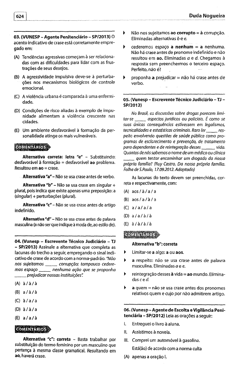 03, (VUNESP- Agente Penitenciário- SP/2013) O acento indicativo de crase está corretamente empre- gado em: (A) Tendências agressivas começam à ser relaciona- das com as dificuldades para lidar com as frus- trações de seus desejos. (B) A agressividade impulsiva deve-se à perturba- ções nos mecanismos biológicos de controle emocional. (C) A violência urbana é comparada à uma enfermi- dade. (D) Condições de risco aliadas à exemplo de impu- nidade alimentam a violência crescente nas cidades. (E) Um ambiente desfavorável à formação da per- sonalidade atinge os mais vulneráveis. ellhl!l •• Alternativa correta: letra "e" - Substituindo: desfavorável à formação = desfavorável ao problema. Resultou em ao =crase. Alternativa "a"- Não se usa crase antes de verbo. Alternativa "b"- Não se usa crase em singular + plural, pois indica que existe apenas uma preposição: a (singular)+ perturbações (plural). Alternativa "c"- Não se usa crase antes de artigo indefinido. Alternativa "d"- Não se usa crase antes de palavra masculina (a não ser que indique à moda de,ao estilo de). 04. (Vunesp - Escrevente Técnico Judiciário - TJ - SP/2013) Assinale a alternativa que completa as lacunas do trecho a seguir, empregando o sinal Indi- cativo de crase de acordo com a norma-padrão. "Não nos sujeitamos __ corrupção; tampouco cedere- mos espaço __ nenhuma ação que se proponha __ prejudicar nossas instituições·: (A) à/ à I à (B) a I à I à (C) à/ a I a (D) à/ à I a (E) a/a/à Alternativa "c": correta - Basta trabalhar por substituição do termo feminino por um masculino que pertença à mesma classe gramatical. Resultando em ao, haverá crase. Duda Nogueira ~ Não nos sujeitamos ao corrupto= à corrupção. Eliminadas alternativas b e e. ._ cederemos espaço a nenhum = a nenhuma. Não há crase antes de pronome indefinido e não resultou em ao. Eliminadas a e d. Chegamos à resposta sem preenchermos o terceiro espaço. Perfeito, não é? I> proponha a prejudicar = não há crase antes de verbo. OS. (Vunesp- Escrevente Técnico Judiciário- TJ- SP/2012) No Brasil, as discussões sobre drogas parecem limi- tar-se __ aspectos juridicos ou policiais. É como se suas únicas consequêncios estivessem em legalismos, tecnicalidades e estat/sticas criminais. R oro ler __ res- peito envolvendo questões de saúde pública como pro- gramas de esclarecimento e prevenção, de tratamento para dependentes e de reintegração desses ___ vida. Quantos de nós sabemos o nome de um médico ou clínica __ quem tentar encaminhar um drogado da nossa própria famflla? (Ruy Castra, Da nossa própria famllía. Folha de S. Paulo, 17.09.2012. Adaptado) As lacunas do texto devem ser preenchidas, cor- reta e respectivamente, com: (A) aos/à/a/a (B) aos/a/à/a (C) a I a I a I a (D) a I a I à I à (E) à I à I à I à Alternativa nb": correta Limitar-se a algo: a ou aos. ~ a respeito: não se usa crase antes de palavra masculina. Eliminadas a e e. ., reintegração desses à vida= ao mundo. Elimina- dasced. ~ a quem = não se usa crase antes dos pronomes relativos quem e cujo por não admitirem artigo. 06. (Vunesp- Agente de Escolta e Vigilância Peni- tenciária- SP/2012} leia as orações a seguir: I. Entreguei o livro à aluna. 11. Assistimos à novela. 111. Comprei um automóvel à gasolina. Está(ão) de acordo com a norma culta (A) apenas a oração I. Crase (8) apenas a oração 11. (C) as orações I e 11, apenas. (DJ as orações 1 e 111, apenas. (E) as orações I, 11 e 111. Alternativa "c": correta - Substitua a palavra feminina por uma masculina que pertença à mesma classe gramatical. Se resultar em ao(s), significa que há o acento indicativo de crase. I. Entreguei o livro ao rapaz= à aluna. 11. Assistimos ao filme= à novela. 111. Não se usa crase neste caso, embora seja polê- mica a regra: alguns gramáticos aceitam e outros não. Caberia recurso. Outros casos polêmicos: 1) Ensino a distância 2) Filé a cavalo e frango a passarinho. 3) Só faz vendas a vista. 4) Fez a redação a máquina. 5) Foi recebido a bala. 6) Ataque a bomba. 7) Baile a fantasia. 8) Sujeito a multa. 9) Todos os itens estão sujeitos a inspeção. 07. (Vunesp - Escrevente Técnico Judiciário - TJ - SP/2011) Assinale a alternativa que completa, cor- reta e respectivamente, as lacunas das frases. I. __ situações insustentáveis do lixo na capi- tal. 11. Esse problema chega __ autoridades que deverão tomar __ providências cabiveis. (A) As/ as/ as (B) Há I às I as (C) Há I as I às (D) Às/as/às (E) As/hás/as Alternativa "b": correta. ., Há situações =existem situações. O verbo haver é impessoal e deve permanecer no singular. Eli- minadas a, de e. ····································· ... J~~] .. Chega às autoridades = chega aos juizes. Subs- tituiu por substantivo masculino e resultou em ao = crase. Eliminada c. .. deverão tomar as providências =os cuidados. 08. (Vunesp - Escrevente Técnico Judiciário - TJ - SP/2011) Assinale a alternativa correta quanto ao uso do acento indicativo da crase. (A) Os catadores andam à pé e coletam lixo reciclá- vel pelas ruas da cidade. (8) O lixo reciclável é destinado à aterros sanitários em municfpios vizinhos. (C) Os especialistas estão à procura de soluções para o tratamento do lixo. (D) A prefeitura tem multo à fazer antes de implan- tar a coleta seletiva do lixo. (E) A notícia do lixo em São Paulo chegou à Vossa Excelência pelo jornal. I·Ji1l#UiW!ft. Alternativa "c": correta - à procura de é locução, por isso há crase e pelo fato e ser formada por palavra feminina, claro. .,.. Dica - Cuidado para não confundir com a pro- curar por, pois não há crase antes de verbo, embora a expressão seja, também, uma locução. Alternativa "a"- Palavra masculina: não há crase. Alternativa "b"- Palavra masculina: não há crase. Alternativa "d"- Não se usa crase antes de verbos; Alternativ