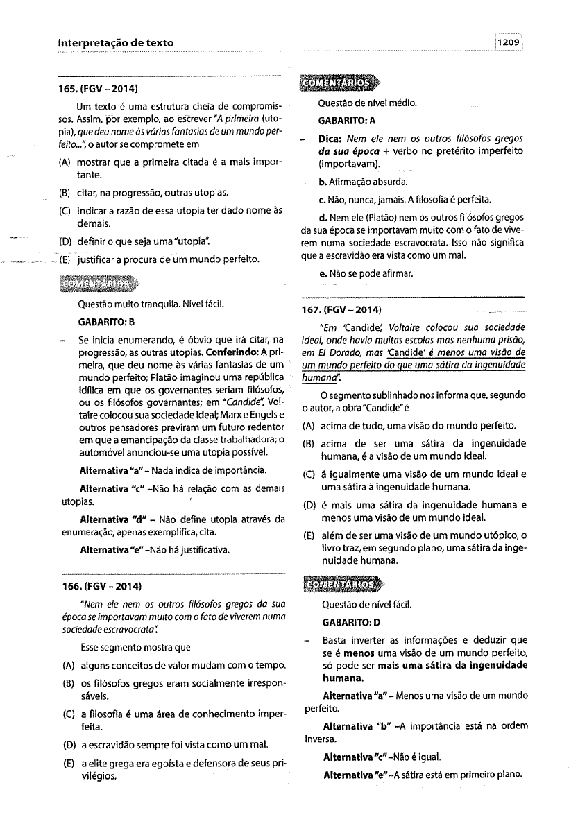 Interpretação de texto 165. (FGV- 2014) Um texto é uma estrutura cheia de compromis- sos. Assim, por exemplo, ao escrever "A primeira (uto- pia), que deu nome às vórias fantasias de um mundo per- feito .. :; o autor se compromete em (A) mostrar que a primeira citada é a mais impor- tante. (B) citar, na progressão, outras utopias. (C) indicar a razão de essa utopia ter dado nome às demais. (D) definir o que seja uma "utopia': ·(E) justificar a procura de um mundo perfeito. Questão muito tranquila. Nível fácil. GABARITO:B Se inicia enumerando, é óbvio que irá citar, na progressão, as outras utopias. Conferindo: A pri- meira, que deu nome às várias fantasias de um mundo perfeito; Platão imaginou uma república idnica em que os governantes seriam filósofos, ou os filósofos governantes; em "Candide~ Vol- taire colocou sua sociedade ideal; Marx e Engels e outros pensadores previram um futuro redentor em que a emancipação da classe trabalhadora; o automóvel anunciou-se uma utopia possfvel. Alternativa "a"- Nada indica de importância. Alternativa "c" -Não há relação com as demais utopias. Alternativa "d" - Não define utopia através da enumeração, apenas exemplifica, cita. Alternativa "e" -Não há justificativa. 166. (FGV -2014} "Nem ele nem os outros filósofos gregos da sua época se importavam muito com o fato de viverem numa sociedade escravocrata~ Esse segmento mostra que (A) alguns conceitos de valor mudam com o tempo. (B) os filósofos gregos eram socialmente irrespon- sáveis. (C) a filosofia é uma área de conhecimento imper- feita. (D) a escravidão sempre foi vista como um mal. (E) a elite grega era egofsta e defensora de seus pri- vilégios. Questão de nfvel médio. GABARITO: A Jl~!l9J Dica: Nem ele nem os outros filósofos gregos da sua época + verbo no pretérito imperfeito (importavam). b. Afirmação absurda. c. Não, nunca, jamais. A filosofia é perfeita. d. Nem ele (Platão) nem os outros filósofos gregos da sua época se importavam muito com o fato de vive- rem numa sociedade escravocrata. Isso não significa que a escravidão era vista como um mal. e. Não se pode afirmar. 167.(FGV-2014) "Em 'Candide; Voltaire colocou sua sociedade ideal, onde havia muitas escolas mas nenhuma prisão, em E/ Dorado, mas 'Candide' é menos uma visão de um mundo perfeito do que uma sátira da ingenuidade humana~ O segmento sublinhado nos informa que, segundo o autor, a obra "Candiqe• é (A) acima de tudo, uma visão do mundo perfeito. (B) acima de ser uma sátira da ingenuidade humana, é a visão de um mundo ideal. (C) á Igualmente uma visão de um mundo ideal e uma sátira à ingenuidade humana. (D) é mais uma sátira da ingenuidade humana e menos uma visão de um mundo ideal. (E) além de ser uma visão de um mundo utópico, o livro traz, em segundo plano, uma sátira da inge- nuidade humana. Questão de nfvel fácil. GABARITO: O Basta inverter as informações e deduzir que se é menos uma visão de um mundo perfeito, só pode ser mais uma sátira da ingenuidade humana. Alternativa "a"- Menos uma visão de um mundo perfeito. Alternativa "b" -A importância está na ordem inversa. Alternativa "c" -Não é igual. Alternativa "e" -A sátira está em primeiro plano. 168. (FGV - 2014) A utopia de Marx e Engels é sobretudo pertinente aos espaços (A) filosófico e religioso (B) religioso e ético (C) ético e econômico (0) econômico e polftico (E) político e filosófico Exige conhecimento de mundo, cultural e isso é obrigação de todo concurseiro, não acha? Pelo contexto, daria para chegar à resposta. TEORIA: Interpretação (página) . GABARITO: O As teorias de Marx e Engels eram em torno da sociedade, economia e política. Marx: As teorias de Marx sobre a sociedade, a economia e a política - conhecidas coletivamente como marxismo - afirmam que as sociedades huma- nas progridem através da luta de classes: um conflito entre a classe burguesa que controla a produção e um proletariado que fornece a mão de obra para a produ- ção. Ele chamou o capitalismo de •a ditadura da bur- guesia: acreditando que seja executada pelas clas- ses ricas para seu próprio benefício, Marx previu que, assim como os sistemas socioeconômicos anteriores, o capitalismo produziria tensões internas que condu- ziriam à sua autodestruição e substituição por um novo sistema: o socialismo. Ele argumentou que uma socie- dade socialista seria governada pela classe trabalha- dora a qual ele chamou de "ditadura do proletariado': o "estado dos trabalhadores" ou "democracia dos traba- lhadores~Marx acreditava que o socialismo viria a dar origem a uma apátrida, uma sociedade sem classes chamada de comunismo. Junto com a crença na inevi- tabilidade do socialismo e do comunismo, Marx lutou ativamente para a implementação do primeiro, argu- mentando que os teóricos sociais e pessoas economi- camente carentes devem realizar uma ação revolucio- nária organizada para derrubar o capitalismo e trazer a mudança socioeconômica. Engels: foi um teórico revolucionário alemão que junto com Karl Marx fundou o chamado socia- lismo científico ou marxismo. Ele foi coautor de diver- sas obras com Marx, sendo que a mais conhecida é o Manifesto Comunista. Também ajudou a publicar, após a morte de Marx, os dois últimos volumes de O Capital, principal obra de seu amigo e colaborador. Alternativa "a" -Religioso seria piada; filosófico também não. Alternativa "b" -Não religioso nem sobre ética. Duda Nogueira Alternativa "c" -Não em relação à ética. Alternativa "e" -Não filosófico. 169. (FGV- 2014) "Até John Lennon, na canção 'Imagine; prop6s sua utopia, na qual não haveria, entre outros atrasos, violên- cia e religião~ Infere-se desse segmento do texto que (A) John Lennon não deveria ter escrito a canção citada. (B) a canção citada não seria, de fato, uma utopia. (C) a religião seria um atraso. (0) a violência deveria fazer parte de um mundo ideal. (