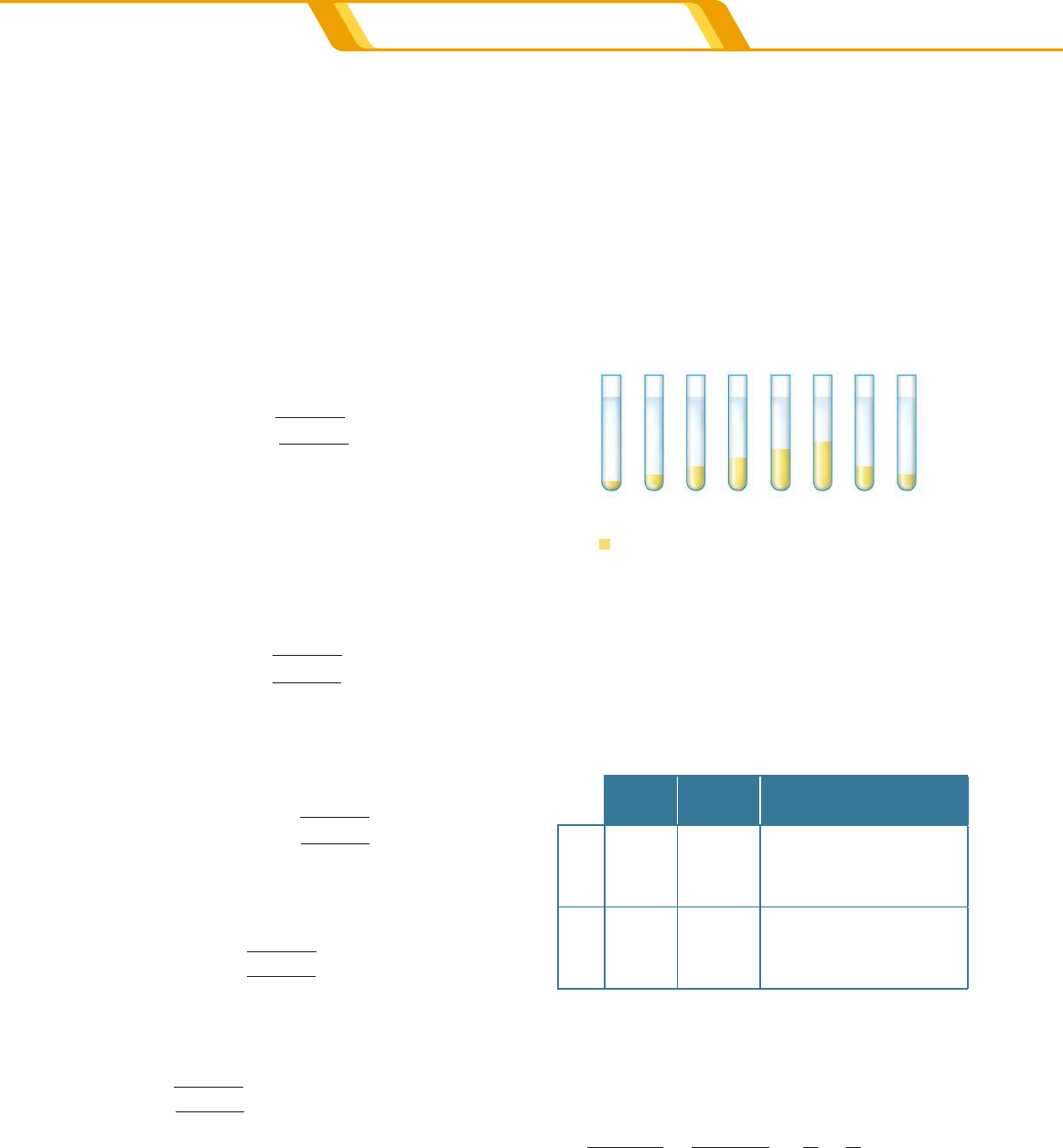 Exercícios resolvidos 89CAPÍTULO 4 | MISTURA DE SOLUÇÕES 1. Uma amostra impura de NaOH, de massa igual a 8,0 g, foi dissolvida até obterem-se 200 mL de so- lução aquosa. Uma alíquota (amostra líquida) de 25 mL dessa solução foi neutralizada totalmente quando titulada com 40 mL de H 2 SO 4 0,25 mol/L. Admitindo que as impurezas não reagem com o ácido, determine o teor de pureza do NaOH. (Dado: massa molar do NaOH 5 40 g ? mol21) Solução Inicialmente vamos determinar o número de mol de H 2 SO 4 consumidos. V 40 mL 40 10 L 0,25 mol/L de H SO 3 2 4 5 5 ? 2 0,25 mol de H SO 1,0 L x 40 10 L x 0,25 40 10 x 10 mol de H SO 2 4 3 3 2 2 4 ? 5 ? ? 5 2 2 2 A reação que ocorre na neutralização total pode ser representada pela equação: →1 H SO 2 NaOH Na SO 2 HO 1 mol 2 mol 2 4 2 4 21 1 Como a proporção é de 1 H 2 SO 4 : 2 NaOH, temos: 1 mol de H SO 2 mol de NaOH 10 mol de H SO x 2 4 2 2 4 2 x 5 2 ? 1022 mol de NaOH presente na amostra titulada Assim, a massa de NaOH presente na amostra de 25 mL é: 1 mol de NaOH 40 g 2 10 mol de NaOH x x 0,8 g de NaOH 2 ? 5 2 Como a solução preparada apresentava um volu- me de 200 mL, temos: 0,8 g de NaOH 25 mL x 200 mL x 6,4 g de NaOH5 A massa de 6,4 g de NaOH é a parte pura na amostra de 8,0 g. Assim: 8,0 g 100% 6,4 g x x 80% de pureza5 2. (Fuvest-SP) Em solução aquosa, íons de tálio podem ser precipitados com íons cromato. For- ma-se o sal pouco solúvel, cromato de tálio, T, x (CrO 4 ) y . Tomaram-se 8 tubos de ensaio. Ao primeiro, adicionaram-se 1 mL de solução de íons tálio (incolor) na concentração de 0,1 mol/L e 8 mL de solução de íons cromato (amarela), tam- bém na concentração de 0,1 mol/L. Ao segundo tubo, adicionaram-se 2 mL da solução de íons tálio e 7 mL da solução de íons cromato. Conti- nuou-se assim até o oitavo tubo, no qual os volu- mes foram 8 mL da solução de íons tálio e 1 mL da solução de íons cromato. Em cada tubo, obte- ve-se um precipitado de cromato de tálio. Os re- sultados foram os da figura. A coloração da solução sobrenadante diminui da esquerda para a direita. precipitado Os valores de x e y, na fórmula T, x (CrO 4 ) y , são, respectivamente: a) 1 e 1. b) 1 e 2. c) 2 e 1. d) 2 e 3. e) 3 e 2. Solução Admitindo que no tubo 6, contendo maior massa de precipitado, não exista excesso de reagente, temos: Quantidades iniciais: Volume Conc. Molar Quantidades T,y1 6 mL 0,1 mol/L n 5 µ ? V 5 5 (0,1 mol/L) ? (6 ? 1023 L) 5 5 0,6 ? 1023 mol CrO4 x2 3 mL 0,1 mol/L n 5 µ ? V 5 5 (0,1 mol/L) ? (3 ? 1023 L) 5 5 0,3 ? 1023 mol Assim: x T y CrO T (CrO ) x mol y mol 1 mol 0,6 10 0,3 10 x 0,6 10 y 0,3 10 x y 2 1 y 4 x x 4 y 3 3 3 3 → ⇒ − , ,1 ? ? ? 5 ? 5 1 2 2 2 2 Logo, os valores de x e y na fórmula do sal serão: x 5 2 y 5 1 R e p ro d u ç ã o / A rq u iv o d a e d it o ra 2CONECTEQuim_MERC18Sa_U1_Cap04_p079a106.indd 89 8/2/18 11:12 AM C o n c e it o g ra f/ A rq u iv o d a e d it o ra C o n c e it o g ra f/ A rq u iv o d a e d it o ra Fundamentando seus conhecimentos 10,1 mol/L HC, 1,0 L 0,1 mol/L KOH 1,0 L solução A solução B solução final 2,0 L solução X solução Y 0,5 mol/L de HBr 0,20 L 0,2 mol/L AgNO 3 0,50 L 0,2 mol/L NaC, 0,50 L 1 1,0 L 0,2 mol/L de NaOH 0,30 L 1 I II III 0,1 mol/L de H 3 PO 4 2,0 L 0,2 mol/L de KOH 3,0 L 5,0 L 1 C o n c e it o g ra f/ A rq u iv o d a e d it o ra C o n c e it o g ra f/ A rq u iv o d a e d it o ra 90 UNIDADE 1 | DISSOLUÇÃO O esquema a seguir representa a mistura de soluções aquosas. A reação pode ser representada pela equação: →HC KOH KC HO 2 1 1, , Com base nessas informações, responda às ques- tões 1 a 6. 1. Determine o número de mol de HC,. 2. Determine o número de mol de KOH. 3. Algum dos reagentes estava em excesso? Justifique. 4. A solução final será ácida, básica ou neutra? 5. Qual o número de mol de KC, formado? 6. Calcule a concentração em mol/L de KC, na so- lução final. Observe a mistura de soluções esquematizada a seguir e responda às questões 7 a 12. A equação da reação ocorrida após a mistura das soluções pode ser representada por: →2 NaOH 1 H SO 1 Na SO 2 HO 2 4 2 4 2 1 1 13. A solução final será ácida, básica ou neutra? 14. Determine o número de mol de H 2 SO 4 na solução final. 15. Calcule a concentração de H 2 SO 4 , em mol/L, na solução final. 16. Calcule a concentração do sal, em mol/L, na so- lução final. O esquema a seguir representa a mistura de duas soluções aquosas de ácido fosfórico e hidróxido de potássio, onde ocorre uma reação. Com base nesses dados, responda às questões 17 a 21. A reação que ocorre com a mistura das soluções pode ser representada por: →HBr NaOH NaBr HO 2 1 1 7. Determine o número de mol de HBr na solução X. 8. Determine o número de mol de NaOH na solução Y. 9. Algum dos reagentes está em excesso? Justifique. 10. A solução final será ácida, básica ou neutra? 11. Calcule a concentração em mol/L do sal formado. 12. Calcule a concentração em mol/L do excesso, caso exista. Considere o esquema a seguir e responda às questões 13 a 16. � V � 0,50 L 1 2444444444 3444444444 0,40 L de uma solução aquosa de NaOH 0,25 mol/L 0,10 L de uma solução aquosa de H2SO4 1 mol/L 17. Equacione a reação de neutralização total entre o ácido fosfórico e o hidróxido de potássio. 18. Determine o número de mols de H 3 PO 4 no frasco I. 19. Determine o número de mols de KOH no frasco II. 20. Determine o número de mols do sal no frasco III. 21. Calcule a concentração em mol/L do sal no fras- co III. A respeito do esquema a seguir, que mostra a mistura das soluções de AgNO 3 e cloreto de sódio, responda às questões 22 a 26. 22. Equacione a reação entre AgNO 3 e NaC,. 23. Qual o número de mols do precipitado formado? 24. Qual o número de mols do sal solúvel presente na solução final? 25. Calcule a concentração em mol/L do NaNO 3 na solução final. 26. A concentração em mol/L do NO3 2 na