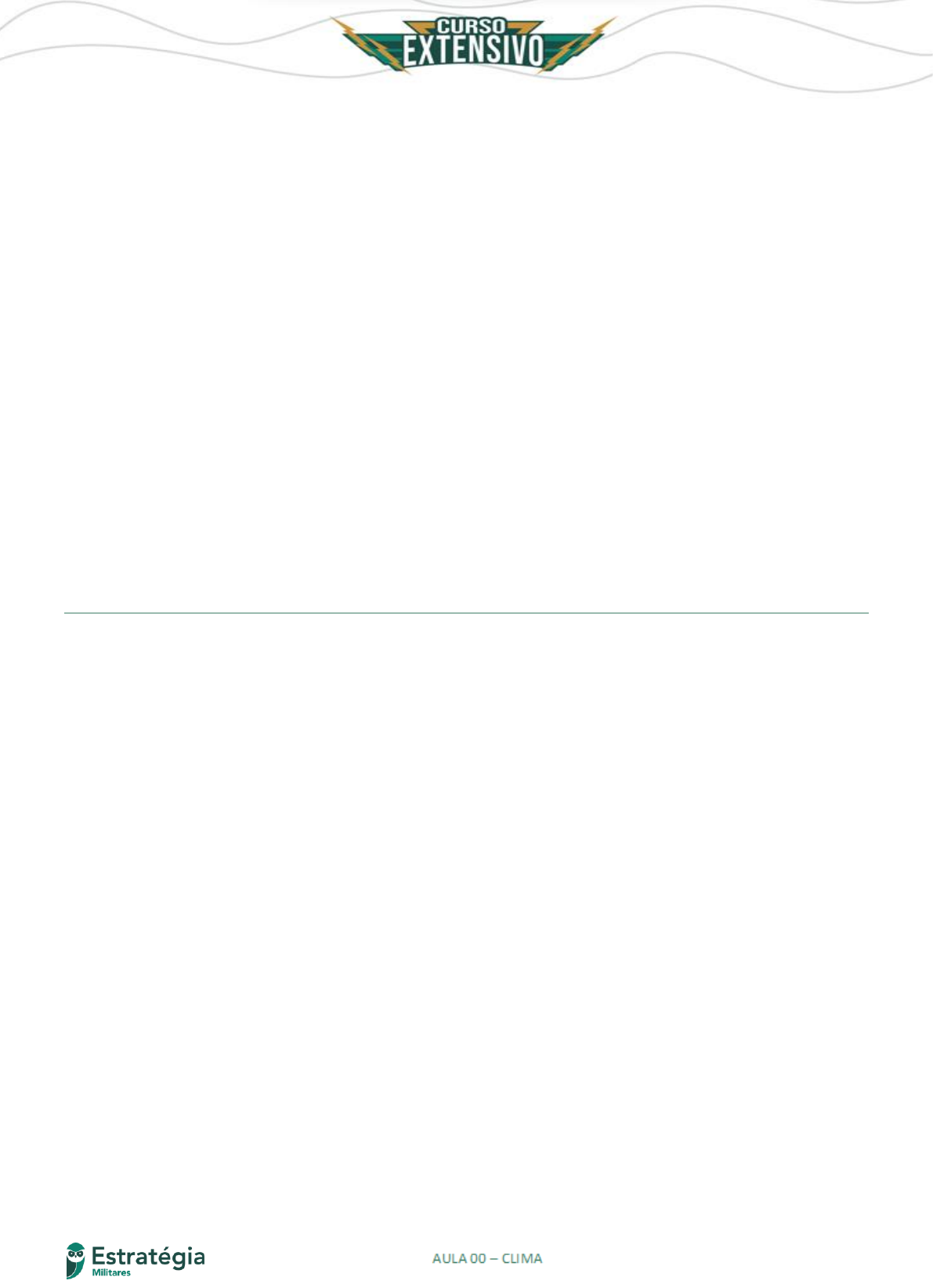 127 Prof. Priscila Lima Ariano Suassuna é um dos grandes nomes da literatura brasileira e como fundador do Movimento Armorial, suas obras refletiam a realidade do Nordeste. O seu livro “O auto da Compadecida” além de influenciar através de páginas foi levado às telas de cinema e transmitiu a paisagem de umas das áreas de maior repulsão demográfica durante a década de 1970, quando uma seca além do comum atingiu a sub-região de vegetação xeromórfica. Em tal obra, o cenário reflete o clima: Alternativa a. INCORRETA. A obra tem por cenário o sertão nordestino, onde o clima é o semiárido. Alternativa b. INCORRETA. O sertão nordestino é marcado pela aridez. Alternativa c. INCORRETA. O clima subtropical não abrange o Nordeste. Alternativa d. INCORRETA. Cuidado! O Brasil não dispõe de clima desértico, mas sim o semiárido Alternativa e. CORRETA. O clima semiárido que abrange o sertão nordestino e é caracterizado pelos baixos índices pluviométricos. Gabarito: e 33. (Estratégia Militares – Inédita / Professora Priscila Lima) Leia a definição a seguir: Diferente daquilo que é considerado padrão, no clima em questão as chuvas se concentram no outono e no inverno graças ao choque de massas de ar e, consequente predomínio de chuvas frontais. Assinale a alternativa que reflete um munícipio ao qual tal definição pode ser aplicada: (A) São Paulo (SP) (B) Rio de Janeiro (RJ) (C) Maceió (AL) (D) Manaus (AM) (E) Belém (PA) Resolução 128 Prof. Priscila Lima Alternativa a. INCORRETA. Em São Paulo o clima é o tropical de altitude, logo as chuvas concentram-se no verão. Alternativa b. INCORRETA. No Rio de Janeiro as chuvas se concentram no verão. Alternativa c. CORRETA. O clima de Maceió é o litorâneo úmido que sob a ação da mPa (massa Polar atlântica) e a mTa (massa Tropical atlântica) tem suas chuvas concentradas no outono/inverno Alternativa d. INCORRETA. O clima de Manaus é o Equatorial, com chuvas bem distribuídas durante todo o ano Alternativa e. INCORRETA. Assim como o clima de Manaus, em Belém o Equatorial com chuvas bem distribuídas durante todo o ano é o que vigora. Gabarito: c 34. (Estratégia Militares – Inédita / Professora Priscila Lima) Observe os dados a seguir: Altitude: Entre 10m e 12m Meses Jan Fev Março Abril Maio Junho Julho Ago Set Out Nov Dez Temp. média (°C) 24.8 24 21.8 18.6 15.8 14.7 14.9 16.3 18.2 20.5 22.7 21.6 Temp. mínima (°C) 20.1 19.5 17.4 14.1 11.5 10.3 10.6 11.8 13.2 15.4 17.4 16.9 Temp. máxima (°C) 29.6 28.5 26.2 23.1 20.1 19.2 19.3 20.8 23.2 25.7 28.1 26.3 Chuva (mm) 109 116 114 101 107 134 130 128 137 115 101 105 Sobre a realidade envolvendo essa tabela, é correto afirmar que está indicando o clima: (A) Tropical úmido, com temperaturas máximas próximas de 30°C durante o verão, e, sob a ação da mPa, durante o inverno, as temperaturas caem em todo o litoral e as chuvas se intensificam no nordeste oriental. (B) Tropical de altitude, com temperaturas mais amenas que as demais porções do país de clima tropical, onde o relevo é fundamental para garantir a grande amplitude térmica anual e enclaves de araucárias. (C) Equatorial, em um ano de forte influência da mPa durante o inverno, intensificando o fenômeno da friagem e baixa ação dos aerossóis provenientes do deserto do Saara, reduzindo as médias pluviométricas. 129 Prof. Priscila Lima (D) Subtropical, com , aproximadamente, 10°C de amplitude térmica, uma vez que a inclinação da Terra favorece verões com forte incidência solar e invernos mais intensos no país. Entretanto, o município em questão não pode ser Curitiba. (E) Semiárido, com baixa precipitação anual e variação de temperatura típica de regiões áridas e semiáridas, onde a continentalidade e o solo arenoso levam à grande amplitude térmica. Comentários Alternativa a. INCORRETA. Cuidado! A alternativa traz muitos fatos, entretanto, perceba que há uma constância na pluviosidade, ou seja, ausência de uma estação seca, logo não pode ser o clima tropical. Alternativa b. INCORRETA. Novamente, repare que não há uma estação seca. Outro cuidado, o relevo garante temperaturas mais amenas, uma vez que esses planaltos garantem maior altitude. Alternativa c. INCORRETA. As temperaturas não oscilam tanto no clima Equatorial, mesmo sob forte ação da mPa no inverno. Alternativa d. CORRETA. A tabela em questão refletiria o seguinte climograma Alternativa e. INCORRETA. Analisando as temperaturas médias durante o inverno já é possível descartar o clima semiárido, mas com certeza os índices pluviométricos na Caatinga são bem menores. Gabarito: d. 35. (Estratégia Militares – Inédita / Professora Priscila Lima Mês mais quente: Janeiro - Temperatura média: 24,8 °C Mês mais frio: Junho - Temperatura média: 14,7 °C Amplitude térmica anual = 10,1°C Ausência de estação seca