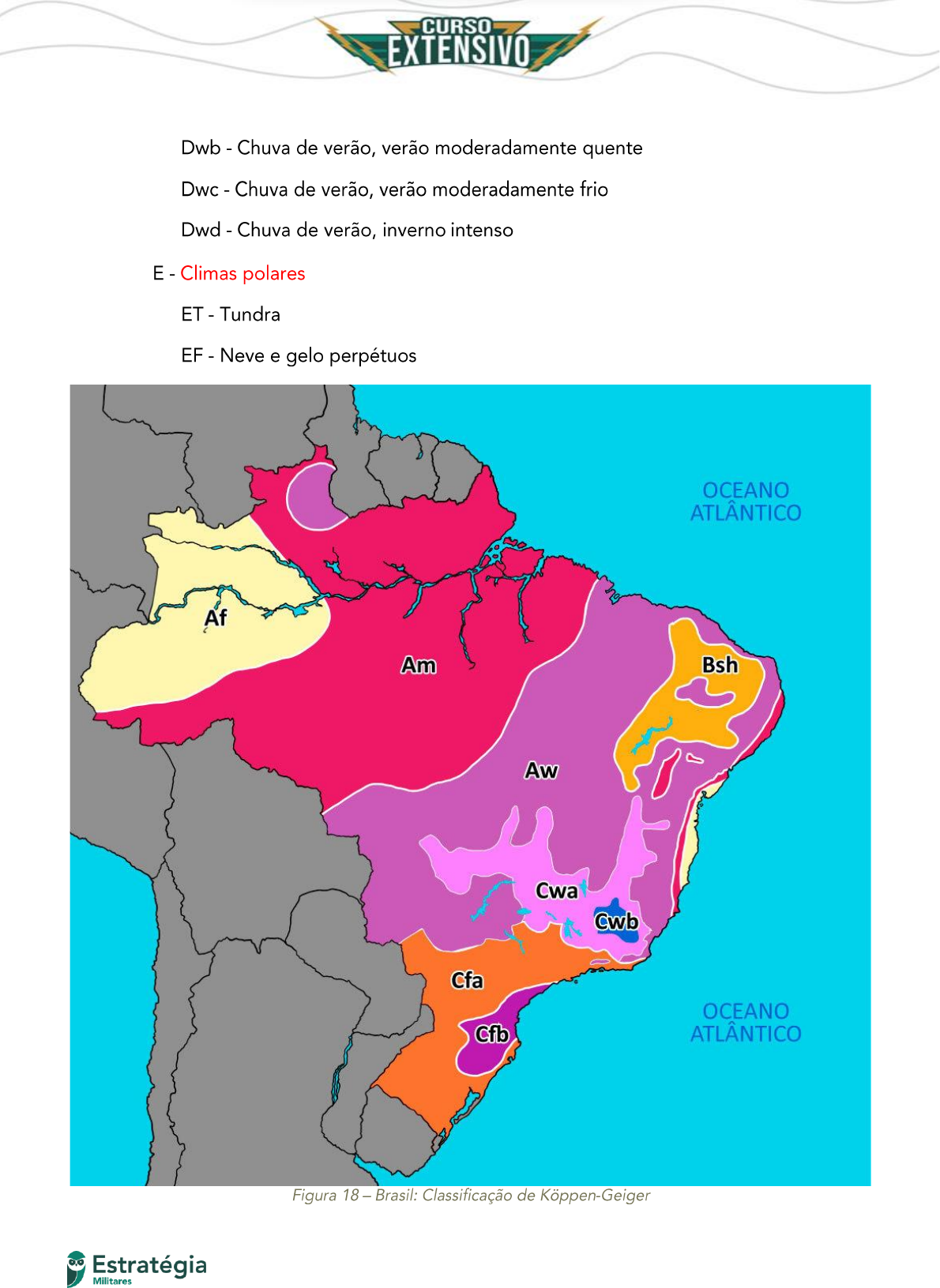 37 Prof. Saulo AULA 00 – CLIMATOLOGIA ➢ ➢ ➢ e) ➢ ➢ 38 Prof. Saulo AULA 00 – CLIMATOLOGIA 39 Prof. Saulo AULA 00 – CLIMATOLOGIA Meses do ano pluviosidade Cuidado com a escala de mm de chuva, pois uma barra elevada não significa, necessariamente, que o índice pluviométrico é elevado. Neste caso sim, pois apresenta 160 mm em janeiro, mas se fosse 60, por exemplo, o índice pluviométrico seria baixo. temperatura Fique atento à unidade. Na maioria das vezes ela aparece em Celsius, mas poderia ser Kelvin ou Fahrenheit. Temperaturas mais elevadas (verão), pluviosidade mais elevada Quente e úmido Temperaturas mais baixas (inverno) no “meio do ano” – Hemisfério Sul Temperaturas mais amenas (inverno), pluviosidade mais reduzida Frio e seco Padrão: Verão úmido e inverno seco – Clima Tropical
