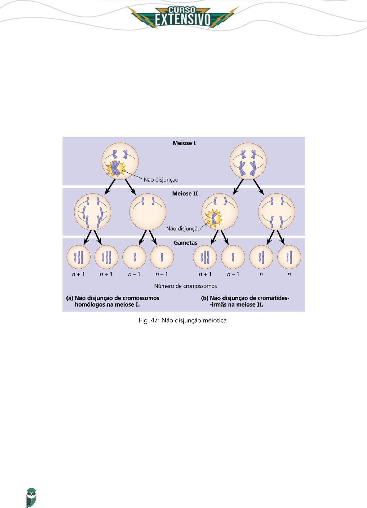 AULA 1 – CITOLOGIA E GENÉTICA – CN 2024 52 Prof. Daniel Reis tipo (monossomia), com 3 cromossomos de um tipo (trissomia) ou ainda sem um par de homólogos (nulissomia). As aneuploidias são causadas por erros durante a divisão celular que levam à chamada não-disjunção cromossômica. Caso isso ocorra em células germinativas, a meiose produzirá gametas com número defeituoso de cromossomos e, se houver fecundação, o zigoto gerado apresentará também esse problema. A não disjunção pode ocorrer durante a meiose I, fazendo com que os cromossomos homólogos não se separem, ou na meiose II, fazendo com que as cromátides irmãs não se separem. A Síndrome de Down é um exemplo de não-disjunção cromossômica e seus portadores apresentam trissomia do cromossomo 21. Os afetados apresentam baixa estatura, pescoço grosso, língua protrusa, mãos curtas e largas e diversos graus de retardo mental que prejudicam a aprendizagem, a memória e a linguagem. O cariótipo da pessoa é 47, XX +21 (mulher) ou 47, XY +21 (homem). AULA 1 – CITOLOGIA E GENÉTICA – CN 2024 53 Prof. Daniel Reis Quando a o erro na disjunção ocorre em cromossomos sexuais, isso leva ao aparecimento de síndromes que afetam o desenvolvimento dos caracteres sexuais do indivíduo. Um exemplo é a Síndrome de Turner, que ocorre em decorrência da não-disjunção dos cromossomos sexuais na formação do espermatozoide, fazendo com que ele não carregue nenhum cromossomo sexual. O resultado é uma mulher de cariótipo 45, X, quase sempre estéril e com baixo desenvolvimento dos órgãos sexuais. AULA 1 – CITOLOGIA E GENÉTICA – CN 2024 54 Prof. Daniel Reis Outro exemplo é a Síndrome de Klinefelter, que gera indivíduos com um cromossomo X extra e de genótipo 47, XXY. A presença do cromossomo Y determina o sexo masculino, mas as características sexuais são pouco desenvolvidas e o indivíduo tem baixa fertilidade.