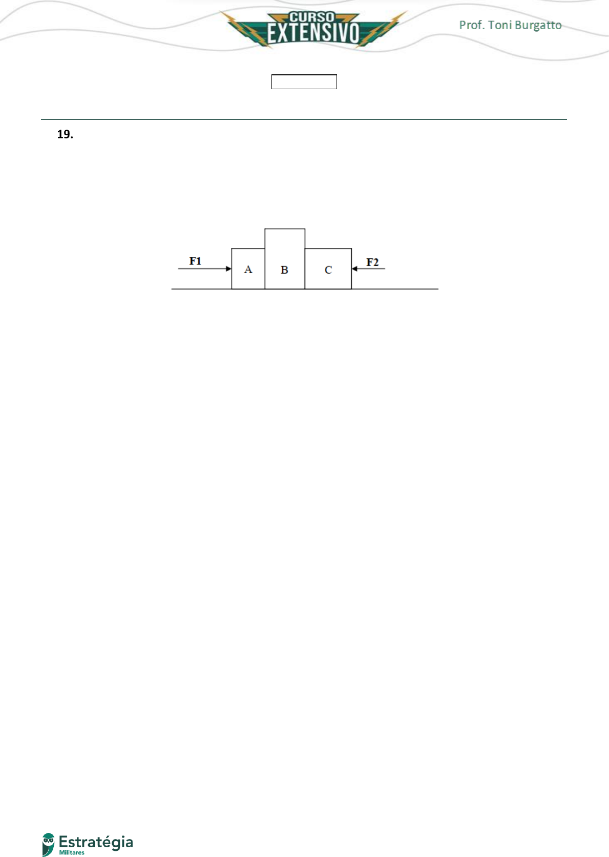 106 AULA 02 – Temos especiais de Dinâmica 𝐹′ = 240 𝑁 Gabarito: E (EFOMM – 2009) Três blocos 𝐴, 𝐵 e 𝐶 encontram-se agrupados e sob a ação das forças 𝐹1 = 100 𝑁 e 𝐹2 = 50 𝑁, conforme desenho abaixo, deslizando em superfície na qual o coeficiente de atrito é 𝜇 = 0,1. Sabendo que as massas desses blocos são, respectivamente, 5, 10 e 5 kg, a aceleração do sistema é de (dado: 𝑔 = 10 𝑚/𝑠2) a) zero (não há deslocamento). b) 1,5 𝑚/𝑠2, para a direita. c) 1,5 𝑚/𝑠2, para a esquerda. d) 3,0 𝑚/𝑠2, para a direita. e) 3,0 𝑚/𝑠2, para a esquerda. Comentários: A diferença entre as forças 𝐹1 e 𝐹2 é de: 𝐹1 − 𝐹2 = 100 − 50 = 50 𝑁 Portanto, o sistema tenderia a se mover para a direita. Agora, precisamos analisar a força de atrito. Se pensarmos os três blocos como um só, já que o atrito entre eles é o mesmo, podemos determinar a força de atrito estática máxima por: 𝑓𝑎𝑡 = 𝜇 ⋅ 𝑁𝑐𝑜𝑛𝑗𝑢𝑛𝑡𝑜 𝑓𝑎𝑡 = 𝜇 ⋅ (𝑚𝐴 +𝑚𝐵 +𝑚𝐶) ⋅ 𝑔 Substituindo valores: 𝑓𝑎𝑡 = 0,1 ⋅ (5 + 10 + 5) ⋅ 10 𝑓𝑎𝑡 = 0,1 ⋅ 20 ⋅ 10 𝑓𝑎𝑡 = 20 𝑁 Logo, a força resultante sobre esse conjunto pode ser expressa por: (𝐹1 − 𝐹2) − 𝑓𝑎𝑡 = (𝑚𝐴 +𝑚𝐵 +𝑚𝐶) ⋅ 𝑎 50 − 20 = 20 ⋅ 𝑎 107 AULA 02 – Temos especiais de Dinâmica 𝑎 = 1,5 𝑚/𝑠2 Gabarito: A (EFOMM – 2006) Aplica-se força de 200 𝑁 a um corpo de massa 25 𝑘𝑔, em plano horizontal com atrito; verifica-se, em laboratório, que sua velocidade aumenta de 18 𝑘𝑚/ℎ para 27 𝑘𝑚/ℎ em 0,4 𝑠. O coeficiente de atrito dinâmico entre o corpo e a superfície do plano horizontal é a) 0,125 b) 0,175 c) 0,225 d) 0,275 e) 0,325 Comentários: Para o movimento na horizontal, devemos ter que: 𝐹 − 𝑓𝑎𝑡 = 𝑚 ⋅ 𝑎 Como ele varia a velocidade em 0,4 s, temos: 𝑎 = Δ𝑣 Δ𝑡 𝑎 = ( 27 3,6 − 18 3,6) 0,4 ⇒ 𝑎 = 9 3,6 ⋅ 0,4 𝑎 = 6,25 𝑚/𝑠2 Portanto: 𝐹 − 𝜇 ⋅ 𝑚 ⋅ 𝑔 = 𝑚 ⋅ 𝑎 200 − 𝜇 ⋅ 25 ⋅ 10 = 25 ⋅ 6,25 ∴ 𝜇 = 0,175 Gabarito: B (EN – 2019) Analise a figura abaixo. A figura acima mostra dois blocos 𝐴 e 𝐵 de massas 𝑚 e 3𝑚, respectivamente, ligados por uma corda inextensível e de massa desprezível passando por uma polia ideal sem atrito e através de um 108 AULA 02 – Temos especiais de Dinâmica orifício 𝑂. No movimento da corda. considere que o orifício atua com uma força de atrito constante, 𝐹. Sabendo-se que a aceleração do sistema é 𝑔/3, onde 𝑔 é a aceleração da gravidade, qual o módulo da força de atrito 𝐹? a) 𝑚𝑔 3 b) 2𝑚𝑔 3 c) 𝑚𝑔 2 d) 𝑚𝑔 e) 2𝑚𝑔 Comentários: No bloco 𝐵, temos apenas a força peso e a tração atuando no corpo. Portanto: 𝑚𝐵 ∙ 𝑔 − 𝑇𝐵 = 𝑚𝐵 ∙ 𝑎 Para o fio passando pelo orifício, temos: 𝑇𝐵 − 𝐹 − 𝑇𝐴 = 𝑚𝑓𝑖𝑜 ∙ 𝑎 No bloco 𝐴, vem: 𝑇𝐴 −𝑚𝐴 ∙ 𝑔 = 𝑚𝐴 ∙ 𝑎 Somando as três equações e considerando nula a massa do fio, temos: 𝑚𝐵 ∙ 𝑔 − 𝑇𝐵 + 𝑇𝐵 − 𝐹 − 𝑇𝐴 + 𝑇𝐴 −𝑚𝐴 ∙ 𝑔 = 𝑚𝐵 ∙ 𝑎 + 𝑚𝑓𝑖𝑜 ∙ 𝑎 + 𝑚𝐴 ∙ 𝑎 𝑚𝐵 ∙ 𝑔 − 𝐹 −𝑚𝐴 ∙ 𝑔 = 𝑚𝐵 ∙ 𝑎 + 𝑚𝑓𝑖𝑜⏟ ≅0 ∙ 𝑎 + 𝑚𝐴 ∙ 𝑎 Substituindo os valores das massas e da aceleração, vem: 3𝑚 ∙ 𝑔 − 𝐹 −𝑚 ∙ 𝑔 = 3𝑚 ∙ 𝑔 3 + 𝑚 ∙ 𝑔 3 ∴ 𝐹 = 2 3 𝑚𝑔 Gabarito: B (EN – 2018) Analise a figura abaixo. A figura mostra um pêndulo cônico no qual um pequeno objeto de massa 𝑚, preso à extremidade inferior de um fio, move-se em uma circunferência horizontal de raio 𝑅, corri o módulo da