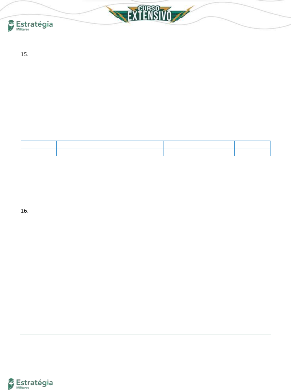 34 Prof. Ismael Santos AULA 02 – Sistema Métrico Decimal Assinale a alternativa que corresponde ao valor da soma 679 dm + 10 m em metros: a) 689 b) 679,1 c) 77,9 d) 16,79 e) 10,679 Comentário: Sabendo que: km hm dam m dm cm Mm 6 7 9 Portanto: 679 𝑑𝑚 = 67,9 𝑚 Por fim: 67,9 𝑚 + 10 𝑚 = 77,9 𝑚 Gabarito: C Assinale a alternativa que corresponde ao valor de 100 m/s em km/h: Dado: 1 m/s = 3,6 km/h a) 0,36 b) 36 c) 360 d) 3600 e) 36000 Comentário: Do enunciado: 1 𝑚/𝑠 = 3,6 𝑘𝑚/ℎ Portanto: 100 𝑚/𝑠 = 360 𝑘𝑚/ℎ Gabarito: C 35 Prof. Ismael Santos AULA 02 – Sistema Métrico Decimal Assinale a alternativa que corresponde ao valor de 54 km/h em m/s: Dado: 1 m/s = 3,6 km/h a) 0,15 b) 0,54 c) 15 d) 150 e) 540 Comentário: Do enunciado: 1 𝑚/𝑠 = 3,6 𝑘𝑚/ℎ Portanto: 54 𝑘𝑚/ℎ = 54 3,6 𝑚/𝑠 = 15 𝑚/𝑠 Gabarito: C Assinale a alternativa que corresponde ao valor de 2,5 g/cm³ em kg/m³: a) 0,25 b) 2,5 c) 250 d) 2500 e) 25000000 Comentário: Do enunciado: 2,5 𝑔 𝑐𝑚3 = 2,5 𝑔 𝑐𝑚3 𝑘𝑔 1000 𝑔 1000000 𝑐𝑚3 𝑚3 = 2,5 1000 𝑘𝑔 𝑚3 = 2500 𝑘𝑔 𝑚3 Gabarito: D 36 Prof. Ismael Santos AULA 02 – Sistema Métrico Decimal Um recipiente possui um volume de 80000 cm³. Assinale a alternativa que corresponde o volume de água, em litros, necessário para preencher 3/4 do volume do recipiente: a) 0,60 b) 6 c) 60 d) 600 e) 20 Comentário: Sabendo que: km³ hm³ dam³ m³ dm³ (litros) cm³ (ml) mm³ 80 000 Portanto: 𝑉 = 80 𝑙 3 4 𝑉 = 60 𝑙 Gabarito: C Assinale a alternativa que corresponde ao valor de 24 calorias em joule: Dado: 1 caloria = 4,2 Joule a) 4,2 b) 5,7 c) 48 d) 100,8 e) 176,4 Comentário: Do enunciado: 1 𝑐𝑎𝑙 = 4,2 𝐽 Portanto: 24 𝑐𝑎𝑙 = 100,8 𝐽 Gabarito: D