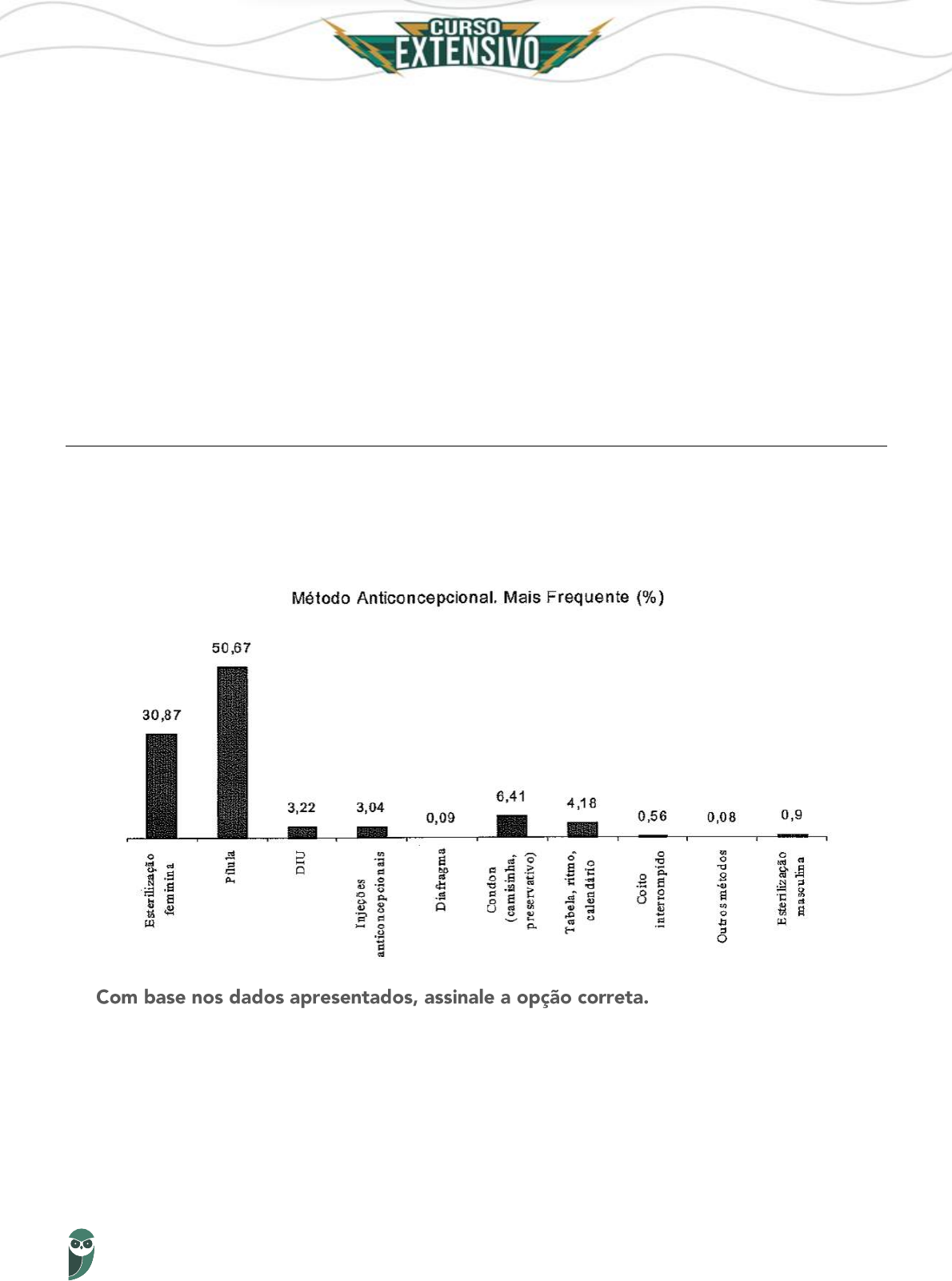 AULA 2 – FISIOLOGIA HUMANA 43 Prof. Daniel Reis Sabemos que o doador não pode apresentar aglutinogênios para os quais o receptor possua aglutininas. Dessa forma, vamos analisar as alternativas. A letra A está errada pois se o receptor não possui aglutinogênios, quer dizer que ele tem aglutininas anti- A e anti-B, o que inviabiliza a transfusão pois o doador possui os 2 aglutinogênios. A letra B também está errada pois como o receptor não possui aglutinogênio B, ele terá aglutinina anti-B, o que inviabiliza a transfusão pois o doador tem aglutinogênio B. A letra C está correta pois o doador não possui aglutinogênios, permitindo sua transfusão para qualquer outro tipo de sangue (de acordo somente com o sistema ABO). A letra D e E estão incorretas, pois os doadores possuem aglutinogênios correspondentes às aglutininas dos receptores. Gabarito: “c” 11. (Colégio Naval, 2008) Analise o gráfico abaixo, em que se mostra a preferência na escolha do tipo de método anticoncepcional. (A) O método mais utilizado previne a fecundação, porque impede o amadurecimento do óvulo e sua liberação do ovário. (B) Os métodos que impedem o contato do sêmen com o útero presentes no gráfico, são o diafragma, DIU e condon. (C) Os métodos considerados naturais, representados no gráfico, são o coito interrompido, a tabela e o condon. AULA 2 – FISIOLOGIA HUMANA 44 Prof. Daniel Reis (D) Os métodos cirúrgicos representados são a esterilização masculina e feminina, que impedem a produção de células reprodutivas. (E) Os métodos contraceptivos que também são indicados na prevenção de DSTs são o condon e o coito interrompido. Comentários Analisando as alternativas teremos: a letra B está errada pois o DIU não impede o contato do sêmen com o útero. A letra C está errada pois o condon não é um método natural. A letra D está errada pois os métodos cirúrgicos não impedem a produção de células reprodutivas. A letra E está errada pois o coito interrompido não previne as DSTs. Assim, a alternativa correta é a letra A. Gabarito: “a” 12. (Colégio Naval, 2006) "Nas cadelas e gatas, a esterilização, ou ovário histerectomia, é um procedimento que consiste na retirada do ovário e do útero. Nos machos, a castração consiste na retirada dos testículos." (O Dia 18/ 03/ 2006) Em relação ao texto acima, é correto afirmar que a retirada (A) do ovário impedirá a produção dos hormônios progesterona e estrogênio. (B) do útero impedirá a formação do gameta feminino. (C) dos testículos não impedirá a fecundação. (D) do ovário não impedirá a formação do gameta feminino. (E) dos testículos não impedirá formação do gameta masculino. Comentários Analisando as alternativas teremos: a letra B está errada pois o gameta feminino não é produzido no útero. A letra C está errada pois a retirada dos testículos impede a produção de espermatozoides e, consequentemente, a fecundação. A letra D está errada pois os ovários produzem o gameta feminino. A letra E está errada pois os testículos produzem o gameta masculino. É o ovário que produz os hormônios progesterona e estrogênio, sendo correta a alternativa A. Gabarito: “a” 13. (Colégio Naval – 2004) AULA 2 – FISIOLOGIA HUMANA 45 Prof. Daniel Reis Sabe-se que o cérebro é composto por várias partes que são responsáveis pelo controle de importantes funções do organismo humano, entre elas o dos movimentos respiratórios que é realizado (A) Pelo cérebro. (B) Pelo cerebelo. (C) Pelo bulbo. (D) Pela medula. (E) Pela hipófise. Comentários O centro de controle dos movimentos respiratórios está localizado no bulbo. Gabarito: “c” 14. (Colégio Naval – 2011) Na espécie humana, a formação de gêmeos pode ocorrer por dois processos distintos. Um dos processos origina os gêmeos idênticos e o outro, os gêmeos não idênticos. Os esquemas abaixo representam a formação dos dois tipos de gêmeos. Os espermatozoides estão representados pelas letras “SPTZ” e o número de cromossomos por “n” ou “2n”. Assinale a opção que completa corretamente as lacunas da sentença abaixo. Em relação aos gêmeos formados nas situações “A” ou “B”, é correto afirmar que em _____ são formados gêmeos ________ por ____ gametas. Cada gameta apresenta _____ cromossomos. (A) “A” / bivitelinos / dois / 46. (B) “B” / bivitelinos / quatro / 46. (C) “B” / univitelinos / quatro / 23.