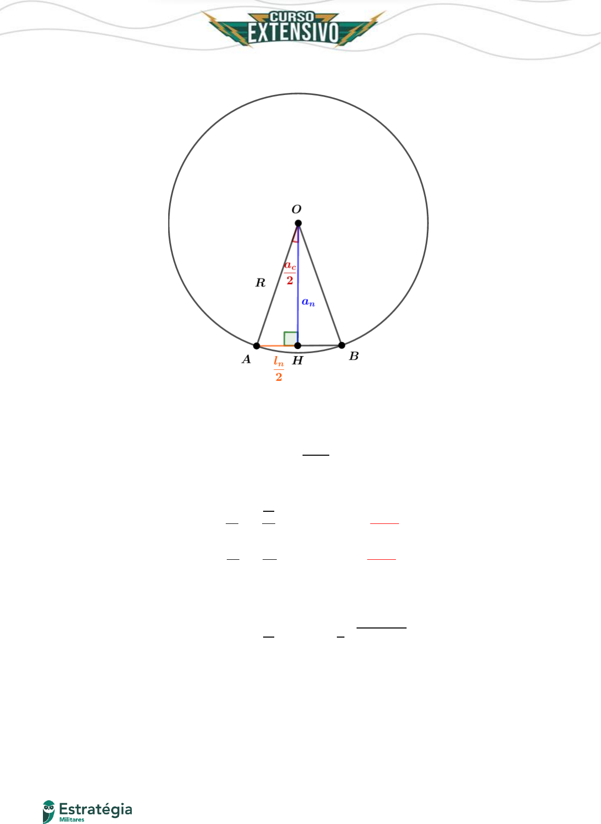 13 Prof. Victor So AULA 03 – GEOMETRIA PLANA IV 𝐴𝐵̅̅ ̅̅ é um dos lados do polígono regular de 𝑛 lados. Sabemos que o ângulo central é dado por: 𝑎𝑐 = 360° 𝑛 Usando as relações trigonométricas no triângulo retângulo 𝑂𝐴𝐻, temos: 𝑠𝑒𝑛 ( 𝑎𝑐 2 ) = 𝑙𝑛 2 𝑅 ⇒ 𝒍𝒏 = 𝟐𝑹𝒔𝒆𝒏 ( 𝟏𝟖𝟎° 𝒏 ) cos ( 𝑎𝑐 2 ) = 𝑎𝑛 𝑅 ⇒ 𝒂𝒏 = 𝑹𝐜𝐨𝐬 ( 𝟏𝟖𝟎° 𝒏 ) Podemos aplicar o teorema de Pitágoras no triângulo 𝑂𝐴𝐻 e encontrar 𝑎𝑛 em função de 𝑙𝑛 e 𝑅: 𝑅2 = 𝑎𝑛 2 + ( 𝑙𝑛 2 ) 2 ⇒ 𝒂𝒏 = 𝟏 𝟐 √𝟒𝑹𝟐 − 𝒍𝒏 𝟐 Também é possível deduzir a fórmula do lado de um polígono regular de 2𝑛 lados em função do raio 𝑅 e do lado 𝑙𝑛 do polígono regular de 𝑛 lados. Veja a figura: 14 Prof. Victor So AULA 03 – GEOMETRIA PLANA IV 𝑙𝑛 e 𝑎𝑛 é o lado e o apótema do polígono regular de 𝑛 lados, respectivamente. Note que Δ𝐶𝐸𝐵~Δ𝐴𝐶𝐵: Δ𝐶𝐸𝐵~Δ𝐴𝐶𝐵 ⇒ 𝐶𝐵 𝐸𝐵 = 𝐴𝐵 𝐶𝐵 ⇒ 𝑙2𝑛 𝑅 − 𝑎𝑛 = 2𝑅 𝑙2𝑛 ⇒ (𝑙2𝑛) 2 = 2𝑅(𝑅 − 𝑎𝑛) (𝐼) Escrevendo 𝑎𝑛 em função de 𝑙𝑛 e 𝑅, temos: 𝑎𝑛 = 1 2 √4𝑅2 − 𝑙𝑛 2 Substituindo em (𝐼): (𝑙2𝑛) 2 = 2𝑅 (𝑅 − 1 2 √4𝑅2 − 𝑙𝑛 2) ∴ 𝒍𝟐𝒏 = √𝑹(𝟐𝑹 − √𝟒𝑹 𝟐 − 𝒍𝒏 𝟐) 1.2.5. COMPRIMENTO DA CIRCUNFERÊNCIA Vimos que o lado de um polígono regular de 𝑛 lados é dado por: 15 Prof. Victor So AULA 03 – GEOMETRIA PLANA IV 𝑙𝑛 = 2𝑅𝑠𝑒𝑛 ( 180° 𝑛 ) O perímetro desse polígono é igual a: 𝑝𝑛 = 𝑛 ⋅ 2𝑅 ⋅ 𝑠𝑒𝑛 ( 180° 𝑛 ) Se tomarmos 𝑛 um número que tende ao infinito, o perímetro desse polígono se aproxima ao comprimento da circunferência circunscrita a ele. Então, aplicando o limite, temos: 𝐶 = lim n→∞ (2𝑅 ⋅ 𝑛 ⋅ 𝑠𝑒𝑛 ( 180° 𝑛 )) ⇒ 𝐶 = 2𝑅 lim n→∞ (𝑛 ⋅ 𝑠𝑒𝑛 ( 180° 𝑛 )) ⏟ 𝜋 ⇒ 𝐶 = 2𝜋𝑅 Assim, temos que o comprimento de uma circunferência é dado por: 𝑪 = 𝟐𝝅𝑹 1. 𝑨𝑩̅̅ ̅̅ , 𝑩𝑪̅̅ ̅̅ , 𝑪𝑫̅̅ ̅̅ e 𝑫𝑬̅̅ ̅̅ são 4 lados consecutivos de um icoságono regular. Os prolongamentos dos lados 𝑨𝑩̅̅ ̅̅ e 𝑫𝑬̅̅ ̅̅ cortam-se em 𝑰. Calcule o ângulo 𝑩Î𝑫. Resolução: O ângulo central do icoságono regular é dado por: