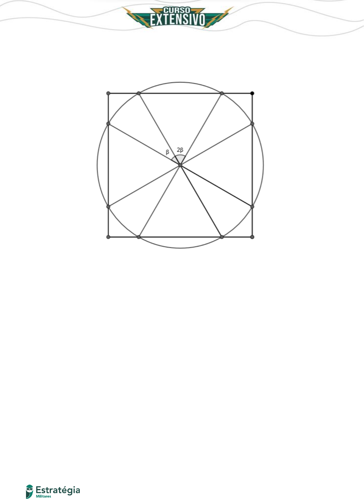 367 Prof. Victor So AULA 03 – GEOMETRIA PLANA IV Fazendo um esquema da situação, temos: Pela figura acima, percebe-se que há 4 ângulos iguais a 𝛽 e 4 iguais a 2𝛽, formando um ângulo de 360°. Disso, temos: 4𝛽 + 4(4𝛽) = 360° ⇒ 12𝛽 = 360° ⇒ 𝛽 = 30° O próximo passo é encontrar o raio da circunferência. Para isso, observe a figura abaixo: 368 Prof. Victor So AULA 03 – GEOMETRIA PLANA IV Nela, podemos observar que o lado do quadrado é igual a duas vezes a altura do triângulo destacado na figura: 2( 𝑟√3 2 ) = 2 ⇒ 𝑟 = 2 √3 Perceba ainda que a área interna a ambos se constitui de 4 setores circulares de 30° e 4 triângulos de ângulo 60° entre os lados de medida 𝑟. Logo: 4 ∙ ( 30 360 ∙ 𝜋𝑟2) = 𝑟2 = ( 2 √3 ) 2 = 4 3 Já que 𝜋 = 3. Além disso: 4 ∙ ( 𝑟 ∙ 𝑟 ∙ 𝑠𝑒𝑛 60° 2 ) = 2 ∙ ( 2 √3 ) 2 ∙ √3 2 = 6,8 3 Já que √3 = 1,7. Por fim, basta somar as áreas: 4 3 + 6,8 3 = 10,8 3 = 3,6 Gabarito: “e”. 369 Prof. Victor So AULA 03 – GEOMETRIA PLANA IV 191. (CN/2007) Deseja-se revestir uma área retangular, de 198 cm de comprimento e 165 cm de largura, com um número exato de lajotas quadradas, de tal forma que a medida do lado dessas lajotas, expressa por um número inteiro em cm, seja a maior possível. Quantas lajotas deverão ser usadas? a) 27 b) 30 c) 33 d) 36 e) 38 Comentários Do estudo da geometria plana, a área retangular é calculada por: 198 ∙ 165 Queremos lajotas quadradas de lados inteiros. Seja 𝑙 o lado dessa lajota. Sua área é dada por 𝑙2. Dessa forma, devemos fatorar a área para descobrir os possíveis lados que essa lajota pode ter. Fatorando o número 198 ∙ 165: 2 ∙ 32 ∙ 11 ∙ 3 ∙ 5 ∙ 11 Para termos o maior lado do quadrado possível, devemos agrupar a maior quantidade de fatores com expoente 2, isto é: (3 ∙ 11)2 ∙ 2 ∙ 5 ∙ 3 Observe que o lado da lajota deve ser 3 ∙ 11 = 33, de modo que o número de lajotas é dado por 2 ∙ 5 ∙ 3 = 30. Gabarito: “b”. 192. (CN/2007) Dado um triângulo ABC de área 72, sobre a mediana AM = 12, traçam-se os segmentos AQ = 3 e QP = 6. Sabendo-se que E é o ponto de intersecção entre as retas BP e QC, qual é a área do triângulo QPE? a) 6 b) 8 c) 9 d) 12