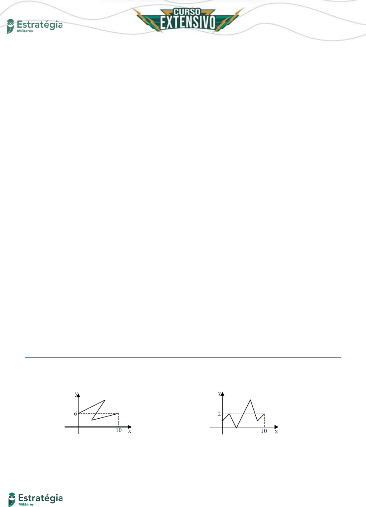 28 Prof. Ismael Santos AULA 05 – INTRODUÇÃO ÀS FUNÇÕES Veja, no exemplo acima, que o gráfico é cortado por três retas (g, h, i) perpendiculares ao eixo x. Perceba que cada reta corta o gráfico em apenas um ponto, mostrando que o gráfico da parábola acima pode ser considerada uma função. 9. (EEAR 2022.1) Seja uma função 𝒇: 𝑨 → 𝑩 tal que 𝑨 = {𝟎, 𝟏, 𝟐, 𝟑, 𝟒} e 𝑩 = ℝ . A alternativa que apresenta todos os pontos de um possível gráfico de 𝒇 é: a) (𝟎, 𝟎); (𝟎, 𝟏); (𝟎, 𝟐); (𝟎, 𝟑) 𝒆 (𝟎, 𝟒) b) (𝟎, 𝟎); (𝟏, 𝟎); (𝟐, 𝟎); (𝟑, 𝟎) 𝒆 (𝟒, 𝟎) c) (𝟎, 𝟎); (𝟏,−𝟏); (𝟐, −𝟐) 𝒆 (𝟑,−𝟑) d) (𝟎, 𝟏); (𝟐, 𝟑); (𝟒, 𝟓) 𝒆 (𝟓, 𝟔) Comentário: Note que para que seja uma função, deve-se atender à alguns pré-requisitos, como: • Todos os elementos do domínio são “utilizados” •Não podemos ter um mesmo elemento do domínio conectado à um ou mais elementos do contradomínio Essas não são as únicas condições, mas resolvem nosso problema. Avaliando cada alternativa, temos: a) Um mesmo elemento do domínio possui 5 imagens diferentes → 𝑓 não seria uma função b) Correto! Liga cada elemento de A a um único de B c) Um elemento do domínio não está sendo utilizado (4) → 𝑓 não seria uma função d) O elemento 5 não pertence ao domínio da função 𝑓 10. (EEAR-2010) Considerando 𝑫 = [𝟎, 𝟏𝟎] o domínio de uma função 𝒚 = 𝒇(𝒙), um gráfico que poderia representá-la é: a) b) 29 Prof. Ismael Santos AULA 05 – INTRODUÇÃO ÀS FUNÇÕES c) d) Comentário: Na letra A, não temos uma função. Na letra C, o domínio no gráfico não condiz com o do enunciado. Na letra D, o domínio está aberto em 10, logo, não corresponde ao do enunciado. De acordo com a definição de função e do intervalo dado, temos que a única possibilidade é o item b. 11. (EsPCEx-2001) - Se o domínio da função 𝒇(𝒙) = (𝒙𝟐 − 𝟗) ⋅ (𝒙𝟐 − 𝟒) ⋅ 𝒙𝟐 é 𝑫(𝒇) = {−𝟑,−𝟐, 𝟎, 𝟐, 𝟑}, pode-se dizer que seu conjunto imagem possui: a) exatamente 5 elementos. b) exatamente 4 elementos. c) um único elemento. d) exatamente 2 elementos. e) exatamente 3 elementos. Comentário: Perceba que se trata de uma função polinomial par, uma vez que todos os expoentes são pares. Além disso, veja que 3,2 e 0 são raízes da função. Dessa forma, segue que todos os elementos do domínio são raízes da função. Assim, o único elemento da imagem é 0. 12. (EPCAR 2000) Qual dos gráficos NÃO representa uma função? a) b) c) d) 30 Prof. Ismael Santos AULA 05 – INTRODUÇÃO ÀS FUNÇÕES Comentários Para que uma função esteja definida, cada x do domínio deve ter como imagem apenas um elemento do contradomínio. Observe que no gráfico representado no item c, cada x do domínio tem como imagem mais de um elemento do contradomínio e, portanto, não representa uma função. Obs.: Note que isso só vale porque estamos considerando a função de 𝒙 → 𝒚. 13. (EPCAR 2002) Dados os conjuntos 𝑨 = {−𝟏, 𝟎, 𝟏, 𝟐} e 𝑩 = {𝟎, 𝟏, 𝟐, 𝟑, 𝟒} assinale dentre as relações seguintes, a alternativa que representa uma função de 𝑨 em 𝑩. a) {(−𝟏, 𝟎); (𝟎, 𝟏); (𝟏, 𝟐); (𝟏, 𝟑); (𝟐, 𝟒)} b) {(−𝟏, 𝟏); (𝟎, 𝟏); (𝟏, 𝟎); (𝟏, 𝟐)} c) {(𝟎, 𝟏); (𝟏, 𝟎); (𝟐, 𝟏); (𝟐, 𝟒)} d) {(−𝟏, 𝟏); (𝟎, 𝟎); (𝟏, 𝟏); (𝟐, 𝟒)} Comentários Se queremos uma função de A em B, cada elemento de A deve ter como imagem apenas um elemento de B, o que nos leva a eliminar os itens a, b e c, pois em a, o elemento 1 do conjunto A tem como imagem 2 e 3, em ‘b’ o elemento 1 tem como imagem 0 e 2 e em ‘c’ o elemento 2 tem como imagem os elementos 2 e 4, descaracterizando uma função. Portanto, apenas no item ‘d’ temos uma função de A em B possível. 14. (CMRJ 2000) Cada figura abaixo, mostra uma relação binária de 𝑨 = {𝟏, 𝟐, 𝟑, 𝟒} em 𝑩 = {𝟓, 𝟔, 𝟕, 𝟖}. Neste caso, podemos afirmar que: