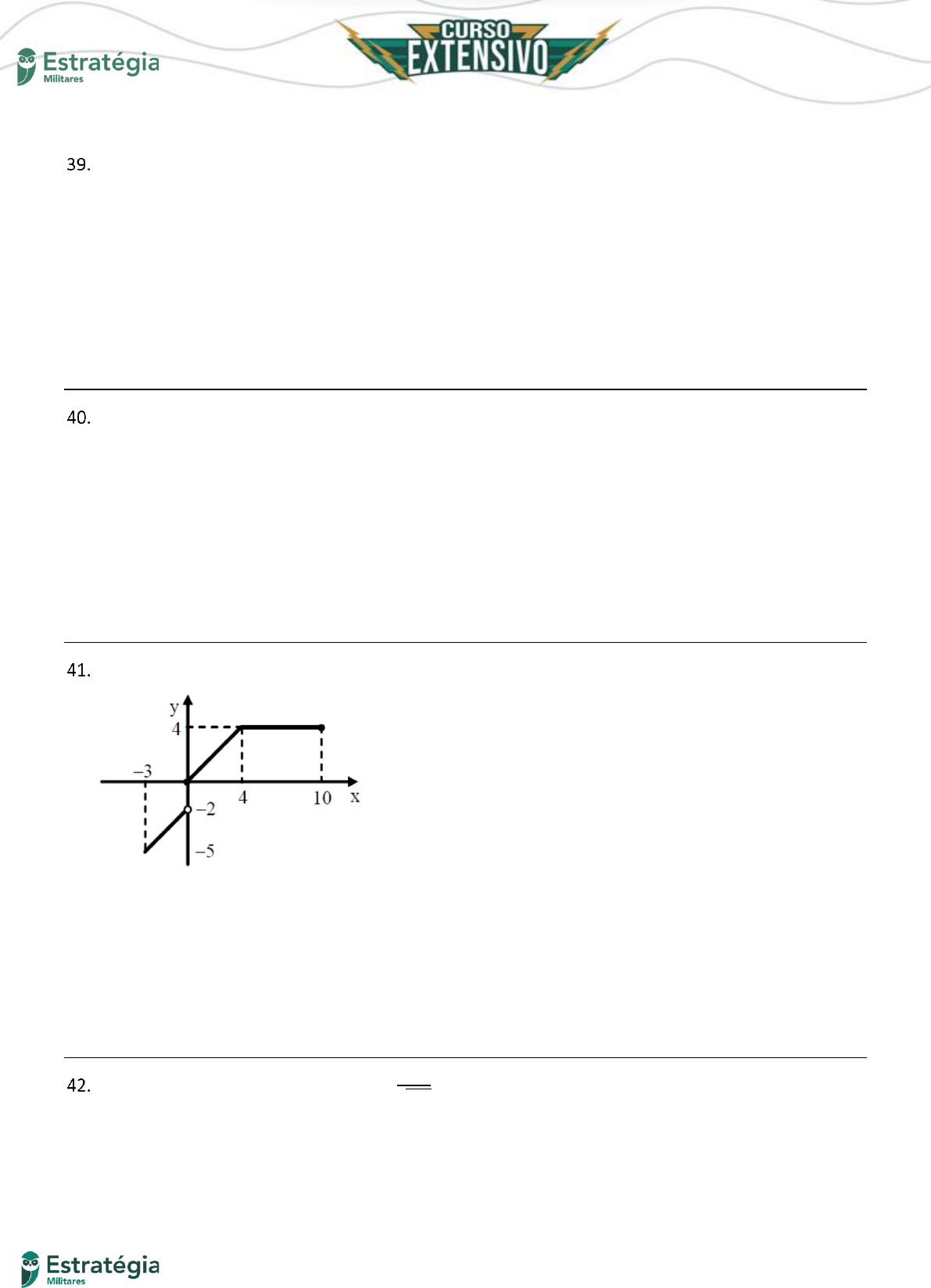 58 Prof. Ismael Santos AULA 05 – INTRODUÇÃO ÀS FUNÇÕES (EEAR-2014) O ponto de intersecção dos gráficos das funções 𝒇(𝒙) = 𝒙 + 𝟐 e 𝒈(𝒙) = 𝟐𝒙 − 𝟏 pertence ao ___ quadrante. a) 1º b) 2º c) 3º d) 4º (EEAR-2015) Sejam f e g funções polinomiais de primeiro grau, tais que o gráfico de f passa por (2, 0) e o de g, por (−2, 0). Se a intersecção dos gráficos é o ponto (0, 3), é correto afirmar que: a) f e g são crescentes. b) f e g são decrescentes. c) f é crescente e g é decrescente. d) f é decrescente e g é crescente. (EEAR-2015) O conjunto imagem da função representada pelo gráfico é: a) ]−𝟓,−𝟐] ∪ [𝟎, 𝟏𝟎] b) ]−𝟐, 𝟎] ∪ [𝟒, 𝟏𝟎] c) −𝟓,−𝟐[ ∪ [𝟎, 𝟒] d) [−𝟐, 𝟎] ∪ 𝟎, 𝟒[ (EEAR-2015) Seja a função real 𝒇(𝒙) = 𝒙+𝟓 √𝒙−𝟏 . A sentença que completa corretamente a expressão do conjunto domínio 𝑫 = {𝒙 ∈ ℝ|____} dessa função é: a) x 1 b) x 1 59 Prof. Ismael Santos AULA 05 – INTRODUÇÃO ÀS FUNÇÕES c) x 0 d) x 0 (EEAR-2017) O domínio da função real 𝒈(𝒙) = √𝒙−𝟏 √𝒙𝟐−𝟒 𝟑 . é 𝑫 = {𝒙 ∈ ℝ_______________}: a) x 1 e x 2 b) x 2 e x 4 c) 1 x 1− d) 2 x 2 e x 0− (EEAR-2017) Se 𝒇(𝒙) = 𝒙−𝟏 𝒙+𝟏 + 𝟑𝒙 √𝒙+𝟒 é uma função, seu domínio é 𝑫 = {𝒙 ∈ ℝ_______________}: a) x 4 e x 1 b) x 4 e x 1 c) x 4 e x 1− − d) x 4 e x 1− − (EEAR-2002) O gráfico abaixo representa as funções reais P(x) e Q(x). Então, no intervalo [−𝟒, 𝟖] tem-se que 𝑷(𝒙) ⋅ 𝑸(𝒙) < 𝟎 para todo 𝒙 ∈ ℝ tal que: a) −𝟐 < 𝒙 < 𝟒 b) −𝟐 < 𝒙 < −𝟏 𝒐𝒖 𝟓 < 𝒙 < 𝟖 c) −𝟒 ≤ 𝒙 < −𝟐 𝒐𝒖 𝟐 < 𝒙 < 𝟒 d) −𝟏 ≤ 𝒙 < 𝟓 (EEAR-2007) A função 𝒇: 𝑨 → ℝ, definida por 𝒇(𝒙) = √𝒙𝟐 + 𝟒𝒙 + 𝟑 tem conjunto domínio A igual a: 60 Prof. Ismael Santos AULA 05 – INTRODUÇÃO ÀS FUNÇÕES a) {𝒙 ∈ ℝ|𝒙 ≤ 𝟏 𝒐𝒖 𝒙 ≥ 𝟑}. b) {𝒙 ∈ ℝ|𝒙 < 𝟏 𝒐𝒖 𝒙 > 𝟑}. c) {𝒙 ∈ ℝ|𝒙 < −𝟑 𝒐𝒖 𝒙 > −𝟏}. d) {𝒙 ∈ ℝ|𝒙 ≤ −𝟑 𝒐𝒖 𝒙 ≥ −𝟏}. (EEAR-2018) Dada a função 𝒇(𝒙 − 𝟏) = 𝒙𝟐 + 𝟑𝒙 − 𝟐, considerando os valores de 𝒇(𝟏) 𝒆 𝒇(𝟐), pode- se afirmar corretamente que: a) 𝒇(𝟏) = 𝒇(𝟐) + 𝟒 b) 𝒇(𝟐) = 𝒇(𝟏)–𝟏 c) 𝒇(𝟐) = 𝟐𝒇(𝟏) d) 𝒇(𝟏) = 𝟐𝒇(𝟐)