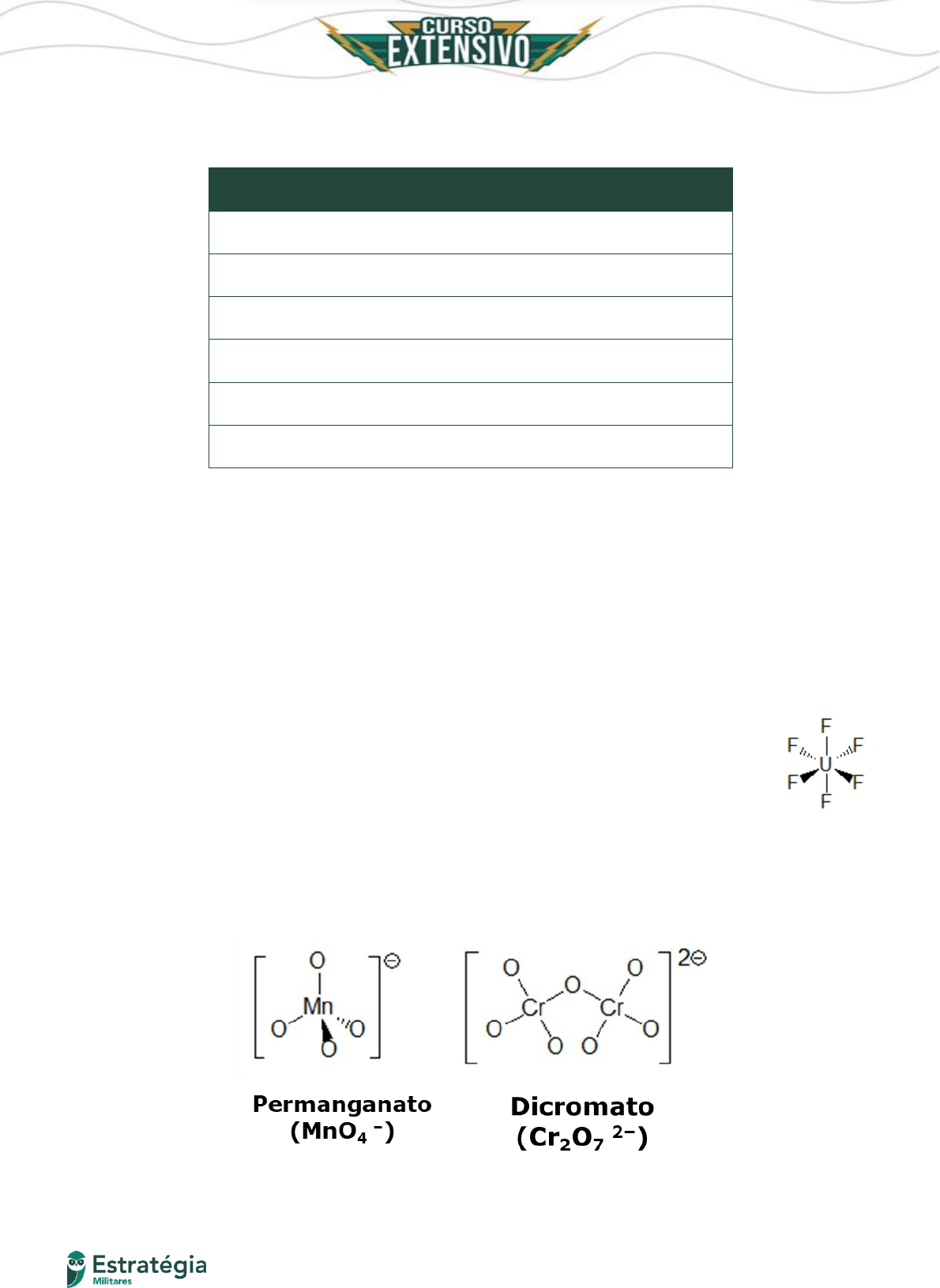 55 Prof. Thiago Cardoso AULA 05 – LIGAÇÕES QUÍMICAS Tabela 9: Energias de Ionização do Cromo Potencial Reação Energia 1º 𝐶𝑟 (𝑔) → 𝐶𝑟+(𝑔) + 𝑒− Δ𝐻 = +652,9 𝑘𝐽/𝑚𝑜𝑙 2º 𝐶𝑟+ (𝑔) → 𝐶𝑟2+(𝑔) + 𝑒− Δ𝐻 = +1590,6 𝑘𝐽/𝑚𝑜𝑙 3º 𝐶𝑟2+ (𝑔) → 𝐶𝑟3+(𝑔) + 𝑒− Δ𝐻 = +2987 𝑘𝐽/𝑚𝑜𝑙 4º 𝐶𝑟3+ (𝑔) → 𝐶𝑟4+(𝑔) + 𝑒− Δ𝐻 = +4743 𝑘𝐽/𝑚𝑜𝑙 5º 𝐶𝑟4+ (𝑔) → 𝐶𝑟5+(𝑔) + 𝑒− Δ𝐻 = +6702 𝑘𝐽/𝑚𝑜𝑙 6º 𝐶𝑟5+ (𝑔) → 𝐶𝑟6+(𝑔) + 𝑒− Δ𝐻 = +8745 𝑘𝐽/𝑚𝑜𝑙 Observe que as energias de ionização crescem rapidamente. O valor da 5ª energia de ionização já é mais de 10 vezes o valor da primeira energia de ionização. Isso dificulta bastante a formação de íons com carga +5. Como regra, podemos anotar que: ✓ Normalmente, os compostos iônicos apresentam cargas pequenas, geralmente +1 a +3; ✓ Existem pouquíssimos compostos iônicos com carga +4 ou superior, e, geralmente, eles são com o oxigênio. São exemplos: PbO2 e Sn(OH)4; Portanto, se um composto tiver uma carga muito elevada no metal, como +5 ou +6, provavelmente ele não será iônico, mas sim molecular, formado por ligações covalentes. Um exemplo interessante é o hexafluoreto de urânio (UF6), que é um composto molecular. Se fosse iônico, como o flúor tem carga igual a –1, o urânio teria a carga +6. Dessa forma, é muito difícil que o hexafluoreto de urânio (UF6) seja iônico, pois seria necessário gastar muita energia para arrancar tantos elétrons. É também relativamente comum alguns íons compostos, formados por ligações covalentes. São exemplos: 56 Prof. Thiago Cardoso AULA 05 – LIGAÇÕES QUÍMICAS • Quando a diferença de eletronegatividade entre o metal e o não metal não for muito grande: uma ligação somente será iônica quando a diferença de eletronegatividade entre o metal e o não metal for muito grande. Caso contrário, ela terá um acentuado caráter covalente. É o que acontece com a maioria dos compostos do berílio, como o BeF2, que não são tipicamente iônicos. O berílio até forma alguns compostos tipicamente iônico, mas geralmente são de ânions compostos oxigenados, como o nitrato de berílio (Be(NO3)2) e o sulfato de berílio (BeSO4). O alumínio, por sua vez, forma um composto iônico com o flúor (AF3), mas um composto molecular com o cloro (AC3). Isso acontece, porque a diferença entre o flúor é muito mais eletronegativo, portanto, tem maior facilidade de induzir à formação de compostos iônicos. Outro caso interessante é o tetraetilchumbo, que é um composto molecular, em que o chumbo forma ligações covalentes com o carbono. (Estratégia Militares – TFC – Inédita) Assinale a alternativa que indica um composto que seja formado exclusivamente por ligações iônicas: a) KNO3 b) BeSO4 c) MgS 57 Prof. Thiago Cardoso AULA 05 – LIGAÇÕES QUÍMICAS d) K2SO4 e) CaCO3 Comentários Os íons compostos são formados por ligações covalentes. São exemplos: Portanto, somente o sulfeto de magnésio (MgS) é um composto formado exclusivamente por ligações iônicas. Gabarito: C (Estratégia Militares – TFC – Inédita) São propriedades dos compostos iônicos: I – condutividade elétrica no estado líquido II – alta resistência a impactos mecânicos III – altas temperaturas de fusão Está (ão) CORRETA (S): a) Apenas I e II. b) Apenas I e III. c) Apenas II e III. d) Nenhuma. e) Todas as afirmações. Comentários Vamos analisar as afirmações. I – Os compostos iônicos não conduzem no estado sólido, mas são condutores no estado líquido. Afirmação correta.