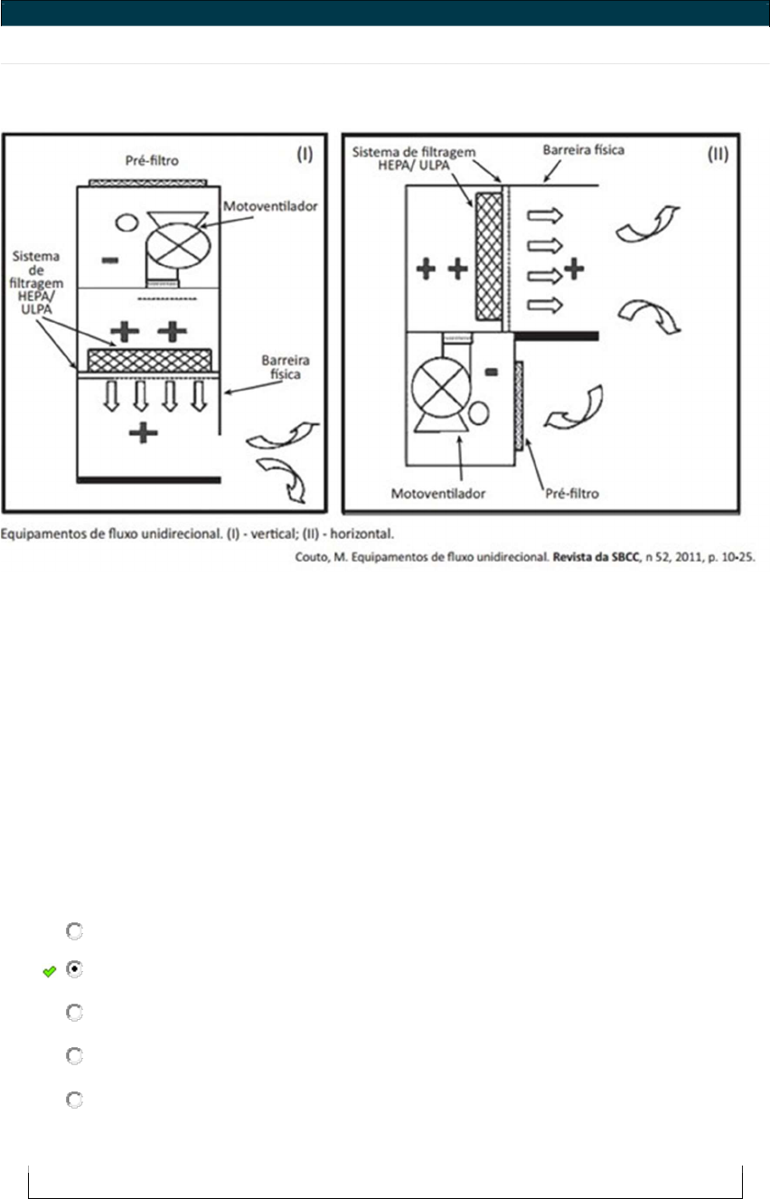 INTRODUÇÃO ÀS BOAS PRÁTICAS LABORATORIAIS Os equipamentos de fluxo unidirecional são desenvolvidos com o propósito de propiciar a manipulação segura de materiais biológicos, conforme se observa nas figuras a seguir. Com relação à utilização correta desse tipo de equipamento e levando em consideração as figuras acima, avalie as asserções que se seguem e a relação proposta entre elas. I. Os equipamentos de fluxo unidirecional horizontal são câmaras que apresentam um fluxo de ar filtrado e laminar no sentido horizontal, oferecendo proteção ao material manipulado, ao operador e ao meio ambiente. PORQUE II. A direção do fluxo de ar que circula no interior das câmaras de fluxo unidirecional horizontal não permite que o ar do meio ambiente contamine o material e, também, que possíveis aerossóis formados a partir da manipulação entrem em contato com o operador. A asserção I é uma proposição verdadeira, e a II é uma proposição falsa. As asserções I e II são proposições falsas. As asserções I e II são proposições verdadeiras, e a II é uma justificativa correta da I. A asserção I é uma proposição falsa, e a II é uma proposição verdadeira. As asserções I e II são proposições verdadeiras, mas a II não é uma justificativa correta da I. Data Resp.: 17/05/2023 14:08:55 Explicação: A resposta correta é: As asserções I e II são proposições falsas. 2. A infraestrutura de um laboratório é planejada de acordo com as regulamentações e com nível de biossegurança. De acordo com o contexto analise as assertivas abaixo: Os níveis de Biossegurança são avaliados e regulamentados de acordo com o setor do laboratório e possui uma normativa diferentes da fiscalização de infraestrutura. PORQUE A legislação no Brasil é regulamenta pela RDC nº 50 de 21 de fevereiro de 2002, que dispõe somente dos projetos físicos de estabelecimentos assistenciais de saúde. As duas assertivas estão corretas, mas a segunda não é uma justificativa correta da primeira. A primeira assertiva está errada, mas a segunda está correta. Nenhuma das assertivas estão corretas. A primeira assertiva está correta, mas a segunda está errada. As duas assertivas estão corretas, e a segunda é uma justificativa correta da primeira. Data Resp.: 17/05/2023 14:10:13 Explicação: Atualmente, no Brasil, a legislação que regulamenta esse setor é a RDC nº 50 de 21 de fevereiro de 2002, que dispõe sobre o regulamento técnico para planejamento, programação, elaboração e avaliação de projetos físicos de estabelecimentos assistenciais de saúde. O layout de um laboratório pode também ser considerado um tipo de contenção laboratorial conhecida como barreira secundária. BIOSSEGURANÇA 3. A acreditação é uma espécie de avaliação e certificação de qualidade de serviços e pode ser utilizada para atestar excelência na qualidade de assistência à saúde. Com relação a acreditação hospitalar, marque a alternativa incorreta: A certificação de acreditação é fornecida após análises de documento e atividades do hospital. Para conquistar um certificado de acreditação, os hospitais devem implantar um sistema de gestão da qualidade. O processo de acreditação tem como características ser voluntário, periódico e reservado. O nível 3 de acreditação contempla aqueles hospitais que possuem políticas de melhoria contínua, boa estrutura e novas tecnologias. Existem três níveis de acreditação que se diferenciam apenas pela eficiência de gestão hospitalar. Data Resp.: 17/05/2023 14:11:00 Explicação: A resposta correta é: Existem três níveis de acreditação que se diferenciam apenas pela eficiência de gestão hospitalar. 4. Os procedimentos realizados durante a coleta de amostras clínicas devem ser bem executados para evitar erros durante todo o processo de análise. O exame de urina é um dos mais solicitados pelos médicos e as orientações para uma coleta correta são muito conhecidas pela população em geral. Com relação as orientações de coleta de urina, leia as afirmativas abaixo e marque a opção incorreta: A etapa de higiene genital com água e sabão pode ser substituída pelo afastamento dos lábios genitais, nas mulheres, e do prepúcio, nos homens. Após a coleta da urina, não há necessidade de esta ser levada imediatamente ao laboratório, visto que é um espécime clínico com pouca chance de alteração. O primeiro jato de urina deve ser desprezado para que haja a retirada do excesso de microrganismos da uretra, coletando-se o jato intermediário. O sabão utilizado para a higiene genital pode contaminar o pote coletor e destruir microrganismos, alterando assim o resultado de uma urinocultura. Colher preferencialmente a primeira urina da manhã, pois encontra-se mais concentrada, oferecendo uma maior chance de encontrar os analitos procurados. Data Resp.: 17/05/2023 14:11:53 Explicação: A resposta correta é: Após a coleta da urina, não há necessidade de esta ser levada imediatamente ao laboratório, visto que é um espécime clínico com pouca chance de alteração. EQUIPAMENTOS E VIDRARIAS APLICADAS EM LABORATÓRIO CLÍNICO 5. Com o reconhecimento da importância da balança, a partir do final do século XIX deu-se início um avanço no desenvolvimento deste equipamento. Com o intuito de obter análises mais exatas, menos susceptíveis à ação do operador e mais rápidas, a tradicional balança de dois pratos começou a dar lugar aos modelos de um só prato, que por sua vez foram substituídos pelas balanças eletrônicas. ( Fonte: texto adaptado de AFONSO, J. C.; SILVA, R. M. Da. A evolução da balança analítica. Química Nova, 2004. v. 27, n. 6, p. 1021-1027) No processo de instalação de uma balança de precisão em um laboratório clínico, é necessário que sejam tomados alguns cuidados para que não ocorra interferência nas pesagens. Marque a alternativa que descreve corretamente 