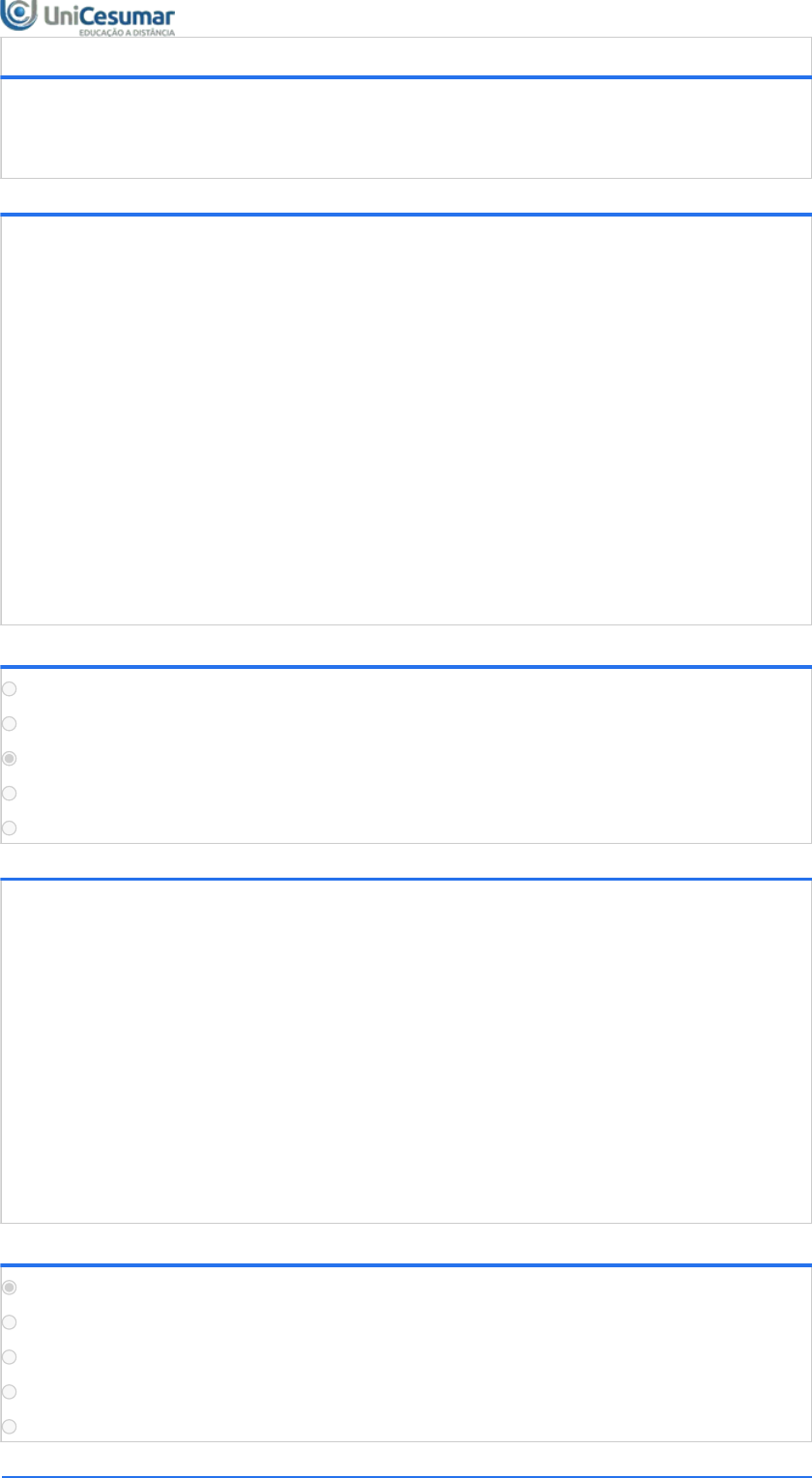 16/03/24, 13:32 Unicesumar - Ensino a Distância about:blank 1/4 ATIVIDADE 02 - NUT - ALIMENTOS FUNCIONAIS - 51/2024 Período:11/03/2024 08:00 a 21/04/2024 23:59 (Horário de Brasília) Status:ABERTO Nota máxima:0,50 Gabarito:Gabarito será liberado no dia 22/04/2024 00:00 (Horário de Brasília) Nota obtida: 1ª QUESTÃO Os alcaloides são uma classe diversificada de compostos orgânicos nitrogenados, muitos dos quais são produzidos por plantas como parte de suas estratégias defensivas contra herbívoros e patógenos. A cafeína, um alcaloide amplamente conhecido, é um estimulante encontrado em várias plantas, incluindo o café (Coffea spp.), chá (Camellia sinensis), e algumas variedades de cacau. Fonte: Higdon, J. V.; Frei, B. Coffee and health: A review of recent human research. Critical Reviews in Food Science and Nutrition, 46(2), 101-123, 2006. Assim, com base nesta informação, analise as asserções a seguir e a relação proposta entre elas: I. A cafeína exerce seu principal mecanismo de ação inibindo competitivamente os receptores de adenosina. PORQUE II. A adenosina é um neurotransmissor estimulante que aumenta a atividade neuronal no cérebro. A respeito dessas asserções, assinale a opção correta. ALTERNATIVAS As asserções I e II são proposições verdadeiras, e a II é uma justificativa correta da I. As asserções I e II são proposições verdadeiras, mas a II não é uma justificativa correta da I. A asserção I é uma proposição verdadeira, e a II é uma proposição falsa. A asserção I é uma proposição falsa, e a II é uma proposição verdadeira. As asserções I e II são proposições falsas. 2ª QUESTÃO COVID-19 é uma doença altamente contagiosa provocada pelo coronavírus da síndrome respiratória aguda grave 2 (SARS-CoV-2). Em 2020, devido ao surto, foi caracterizada pela Organização Mundial da Saúde (OMS) como pandemia. A infecção causada pelo novo coronavírus tem alta mortalidade em uma pequena parcela da população infectada, especialmente em indivíduos idosos, imunodeprimidos, diabéticos, cardiopatas e hipertensos. A relação entre a vitamina D e a infecção por COVID-19 tem sido objeto de intensa pesquisa, dada a importância da vitamina D no sistema imunológico. Estudos têm investigado se a deficiência de vitamina D pode influenciar a suscetibilidade à infecção pelo SARS-CoV-2 e a gravidade dos casos. Fonte: Smith, A. J., et al. Vitamin D deficiency and its association with COVID-19 severity and mortality in a diverse urban population. Nutrients, 13(5), 1726, 2021. Assinale a alternativa que apresenta um fonte rica da forma D2 da dessa vitamina. ALTERNATIVAS Cogumelos. Gema de ovos. Sardinha enlatada. Carnes vermelhas. Leites enriquecidos. 3ª QUESTÃO 16/03/24, 13:32 Unicesumar - Ensino a Distância about:blank 2/4 A Agência Nacional de Vigilância Sanitária (ANVISA) define, por meio da RDC 429/2020, Fibra alimentar como polímero de carboidrato com três ou mais unidades monoméricas que não são hidrolisadas pelas enzimas endógenas do trato digestivo humano. O aumento na ingestão de fibras reduz os níveis séricos de colesterol, melhora a glicemia em pacientes com diabetes, reduz o peso corporal e foi associado com menores níveis séricos de proteína C reativa ultrassensível. Fonte: BRASIL. Ministério da Saúde. Agência Nacional de Vigilância Sanitária (ANVISA). Resolução – RDC nº 429, de 8 de outubro de 2020. Dispõe sobre a rotulagem nutricional dos alimentos embalados. Diário Oficial da União, Brasília/DF, 9 out. 2020. Assinale a alternativa que apresenta a propriedade que está diretamente associada à capacidade de uma fibra reter água. ALTERNATIVAS Viscosidade. Solubilidade. Fermentabilidade. Capacidade de ser fermentada. Produção de ácidos graxos de cadeia curta. 4ª QUESTÃO A alicina é um composto sulfurado encontrado em vegetais do gênero Allium, notadamente no alho (Allium sativum). Este composto é formado quando a aliina, um composto precursor, é convertida pela enzima alliinase durante o corte ou esmagamento do alho. A alicina é responsável pelo característico aroma e sabor picante do alho, mas também é reconhecida por suas propriedades bioativas. Fonte: Lawson, L. D.; Hunsaker, S. M. Allicin bioavailability and bioequivalence from garlic supplements and garlic foods. Nutrients, 10(7), 812, 2018. Considerando as propriedades bioativas da alicina e outros compostos sulfurados presentes em vegetais do gênero Allium, assinale a alternativa que apresenta o principal destaque desses compostos em relação à saúde. ALTERNATIVAS Efeito oxidante. Indução do crescimento tumoral. Promoção de inflamações crônicas. Redução da absorção de nutrientes. Quimioprevenção de diversos tipos de câncer. 5ª QUESTÃO Os compostos fenólicos são uma classe imensa de substâncias químicas encontradas principalmente em frutas e vegetais. Embora muitos estudos apontem para a baixa biodisponibilidade desses compostos intactos após a ingestão devido à metabolização durante o processo digestivo, o consumo regular dessas substâncias tem sido associado a inúmeros benefícios para a prevenção de doenças, manutenção da saúde e bem-estar. Fonte: BASSEGIO, A. M. Alimentos Funcionais. Indaial-SC: Arqué, 2023. Assinale a alternativa que apresenta uma propriedade sensorial dos alimentos constituídos por compostos fenólicos. ALTERNATIVAS Doçura. Umami. Picância. Salinidade. Adstringência. 16/03/24, 13:32 Unicesumar - Ensino a Distância about:blank 3/4 6ª QUESTÃO A vitamina A é uma vitamina lipossolúvel, ou seja, solúvel em gorduras e óleos derivados de isoprenoides. Incorpora o retinol, o ácido retinoico, o 3,4-didehydroretinol (vitamina A2), os ésteres de retinil e o 3,4- didehydroretinal. Na dieta, a vitamina A é majoritariamente encontrada em duas formas: como retinol, a forma pré-formada encontrada em alimentos de origem animal, ou em alguns caroteno