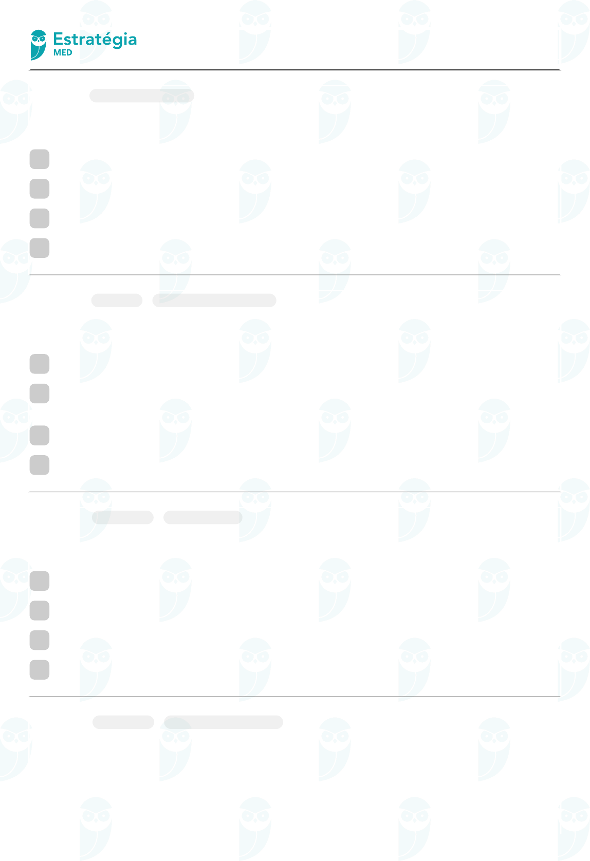 Sd do olho vermelho vinicius martins - 500.237.318-69 Acessar Lista Questão 1 Conjuntivite Bacteriana Lactente de 1 mês trazido pela mãe a seu plantão na UPA refere ter observado que desde os primeiros dias de vida apresenta lacrimejamento aumentada do lado direito. Qual a possível hipóteses diagnostica. A Conjuntivites viral. B Conjuntivites bacteriana. C Obstrução congênita das vias lacrimais. D Alergia ao sabonete líquido. 4000216619 Questão 2 Introdução Síndrome do Olho Vermelho Homem de 32 anos, funileiro, dá entrada no Pronto-Atendimento de madrugada, relatando quadro de dor ocular bilateral intensa, com fotofobia, sensação de areia nos olhos e hiperemia facial. Neste caso, a sequência correta para a conduta é: A Lavagem ocular intensa com soro fisiológico gelado, analgesia, exame do fundo do olho e repouso por 48 horas. B Lavagem intensiva, oclusão e encaminhamento para avaliação oftalmológica em até 48 horas se persistir o quadro. C Analgesia, avaliação ocular externa, oclusão e encaminhamento para avaliação oftalmológica. D Aplicação de corticoide tópico, oclusão, analgesia e encaminhamento para avaliação oftalmológica. 4000212936 Questão 3 Conjuntivites Conjuntivite Viral As conjuntivites são o principal diagnóstico de olho vermelho em crianças e adolescentes. A principal etiologia desses casos é A química. B viral. C fúngica. D bacteriana. 4000212311 Questão 4 Conjuntivites Hemorragia Subconjuntival Um paciente diabético que estava utilizando corticoides sistêmicos submeteu-se a uma cirurgia de catarata há 3 dias. Agora, ele apresenta hiperemia ocular, redução da acuidade visual e visão turva. Os achados da ectoscopia são ilustrados na imagem abaixo. https://med.estrategia.com/cadernos-e-simulados/cadernos/c5c3391d-718c-45ec-9f1d-fbca3fb55464 Diante do cenário clínico apresentado, bem como o tema que ele suscita, julgue o item. É um caso de conjuntivite complicada com hemorragia subconjuntival, uma condição potencialmente grave. No entanto, o tratamento adequado envolve o uso de colírio forti cado de amplo espectro a cada hora, com reavaliação programada após 24-48 horas. A Certo. B Errado. 4000208436 Questão 5 Clínica Médica Conjuntivites Hemorragia Subconjuntival Um paciente diabético que estava utilizando corticoides sistêmicos submeteu-se a uma cirurgia de catarata há 3 dias. Agora, ele apresenta hiperemia ocular, redução da acuidade visual e visão turva. Os achados da ectoscopia são ilustrados na imagem abaixo. Diante do cenário clínico apresentado, bem como o tema que ele suscita, julgue o item. Devido à recente manipulação, é mais provável que os germes gram-negativos, como Pseudomonas, Klebsiella e Proteus, estejam envolvidos, especialmente considerando o curto período de evolução. A Certo. B Errado. 4000208435 Questão 6 Clínica Médica Conjuntivites Ceratites Inf ecciosas Um paciente diabético que estava utilizando corticoides sistêmicos submeteu-se a uma cirurgia de catarata há 3 dias. Agora, ele apresenta hiperemia ocular, redução da acuidade visual e visão turva. Os achados da ectoscopia são ilustrados na imagem abaixo. Diante do cenário clínico apresentado, bem como o tema que ele suscita, julgue o item. Os fatores de risco para a condição em questão incluem o uso de drogas endovenosas e o olitraumatismo, enquanto a presença de abscesso hepático e cirurgia abdominal não estão associados a esse quadro. A Certo. B Errado. 4000208434 Questão 7 Conjuntivite Bacteriana Aguda Tracoma Recém nascido inicia no quinto dia de vida com congestão das conjuntivas, secreção purulenta moderada bilateral e quemose. Sem outros sintomas sistêmicos. Bacterioscopia da secreção revela-se negativa. Sobre o manejo deste paciente analise as afirmativas abaixo. I. – A ausência de bactérias torna mais provável a conjuntivite ser de origem viral ou química. II. – O tratamento deve ser realizado com azitromicina por via oral. III. – Pode evoluir com formação de pseudomembrana na conjuntiva tarsal. Sobre esta situação selecione a opção correta. A As afirmativas I e II são verdadeiras. A afirmativa III é falsa. B As afirmativas I e III são verdadeiras. A afirmativa II é falsa. C As afirmativas II e III são verdadeiras. A afirmativa I é falsa. D As afirmativas I, II e III são verdadeiras. E As afirmativas I, II e III são falsas. 4000206325 Questão 8 Celulite PréSeptal Celulite Orbitária PósSeptal Menino de 10 anos vem com queixa de cefaleia, febre e mal-estar, acompanhados de hiperemia e edema periorbitário em olho direito. Ao exame apresenta-se com proptose, limitação dolorida de movimentos do olho e diminuição da acuidade visual. Sobre este quadro analise as afirmativas abaixo. I. – O potencial de complicações é baixo. II. – São indicadas hospitalização e antibioticoterapia sistêmica. III. – A causa mais comum é a extensão direta ou a disseminação venosa originária de seios paranasais infectados. Sobre esta situação selecione a opção correta. A As afirmativas I e II são verdadeiras. A afirmativa III é falsa. B As afirmativas I e III são verdadeiras. A afirmativa II é falsa. C As afirmativas II e III são verdadeiras. A afirmativa I é falsa. D As afirmativas I, II e III são verdadeiras. E As afirmativas I, II e III são falsas. 4000206315 Questão 9 Conjuntivite por Clamídia em Adulto Tracoma Tracoma é uma conjuntivite crônica causada pela bactéria Chlamydia trachomatis. Sendo a principal causa de cegueira evitável no mundo, caracteriza-se por exacerbações progressivas e remissões. Os sintomas iniciais são hiperemia da conjuntiva, edema palpebral, fotofobia e lacrimejamento. Mais tarde, ocorrem neovascularização da córnea e cicatrização de conjuntiva, córnea e pálpebras. O diagnóstico costuma ser clínico, e o tratamento é feito com antibióticos tópicos e sistêmicos. Para o tratamento sistêmico, exceto para