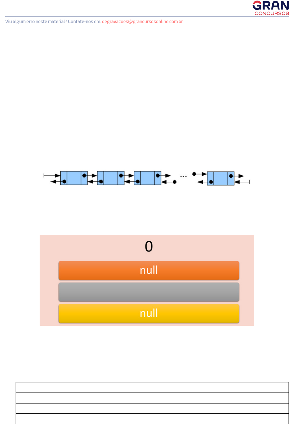 1www.grancursosonline.com.br Viu algum erro neste material? Contate-nos em: degravacoes@grancursosonline.com.br A N O TA ÇÕ E S Estruturas de Dados – Listas – Listas Duplamente Encadeadas DESENVOLVIMENTO DE SISTEMAS ESTRUTURAS DE DADOS – LISTAS – LISTAS DUPLAMENTE ENCADEADAS CONCEITUAÇÃO • Cada elemento possui: – Espaço para armazenamento da informação – Espaço para armazenamento da referência do próximo elemento da lista – Espaço para armazenamento da referência do elemento anterior da lista Isto é, além da informação e do ponteiro para o próximo, as duplamente encadeadas trazem também um ponteiro para o anterior, permitindo ir e voltar nas informações. Dessa forma: Perceba que tanto o primeiro quanto o último elemento apontam para null. Criando uma Lista www.grancursosonline.com.br 2www.grancursosonline.com.br Viu algum erro neste material? Contate-nos em: degravacoes@grancursosonline.com.br A N O TA ÇÕ E S Estruturas de Dados – Listas – Listas Duplamente Encadeadas DESENVOLVIMENTO DE SISTEMAS Criando o Primeiro Elemento Inserindo um Elemento no Início da Lista 5m www.grancursosonline.com.br 3www.grancursosonline.com.br Viu algum erro neste material? Contate-nos em: degravacoes@grancursosonline.com.br A N O TA ÇÕ E S Estruturas de Dados – Listas – Listas Duplamente Encadeadas DESENVOLVIMENTO DE SISTEMAS Inserindo um Elemento no Final da Lista Inserindo um Elemento no Meio da Lista www.grancursosonline.com.br 4www.grancursosonline.com.br Viu algum erro neste material? Contate-nos em: degravacoes@grancursosonline.com.br A N O TA ÇÕ E S Estruturas de Dados – Listas – Listas Duplamente Encadeadas DESENVOLVIMENTO DE SISTEMAS Acessando um Elemento Removendo um Elemento no Início da Lista Veja que o elemento antes da lista tenha como próximo ninguém, e o agora primeiro ele- mento aponte para ninguém também. www.grancursosonline.com.br 5www.grancursosonline.com.br Viu algum erro neste material? Contate-nos em: degravacoes@grancursosonline.com.br A N O TA ÇÕ E S Estruturas de Dados – Listas – Listas Duplamente Encadeadas DESENVOLVIMENTO DE SISTEMAS Removendo um Elemento no Final da Lista A mesma lógica do anterior, mas é o novo último elemento que apontará para null, anu- lando o que antes era o último elemento. Removendo um Elemento no Meio da Lista Aqui é um caso um pouco diferente: o 75 aponta para 51 e o 51 aponta para 75, com nenhum dos dois elementos apontando para o elemento no meio. www.grancursosonline.com.br 6www.grancursosonline.com.br Viu algum erro neste material? Contate-nos em: degravacoes@grancursosonline.com.br A N O TA ÇÕ E S Estruturas de Dados – Listas – Listas Duplamente Encadeadas DESENVOLVIMENTO DE SISTEMAS DIRETO DO CONCURSO 1. (FGV/2021/TJ/RO/ANALISTA JUDICIÁRIO/ANALISTA DE SISTEMA/DESENVOLVI- MENTO DE SISTEMA) Considere a lista duplamente encadeada exibida a seguir. • (1, 3, 0, “Verde”) • (2, 4, 3, “Azul”) • (3, 2, 1, “Amarelo”) • (4, 0, 2, “Vermelho”) Cada elemento pertencente à lista é representado por uma quádrupla, com o seguin- te formato: • (<id>, <id do anterior>, <id do seguinte>, <conteúdo>). A ordem do conteúdo dos componentes, segundo a instância da lista apresentada, é: a. Amarelo, Verde, Azul, Vermelho; b. Azul, Verde, Vermelho, Amarelo; c. Verde, Vermelho, Amarelo, Azul; d. Vermelho, Amarelo, Azul, Verde; e. Vermelho, Azul, Amarelo, Verde. COMENTÁRIO Analisando como os itens apontam uns para os outros, a ordem seria: Vermelho, Azul, Amarelo, Verde. Obs.: � algumas bancas usam 0 (zero) como null. 10m www.grancursosonline.com.br 7www.grancursosonline.com.br Viu algum erro neste material? Contate-nos em: degravacoes@grancursosonline.com.br A N O TA ÇÕ E S Estruturas de Dados – Listas – Listas Duplamente Encadeadas DESENVOLVIMENTO DE SISTEMAS 2. (FGV/2018/MPE/AL/ANALISTA DO MINISTÉRIO PÚBLICO/ADMINISTRADOR DE BANCO DE DADOS) Considere a representação de uma lista duplamente encadeada que armazena os times de futebol que participam de um torneio. Assinale a ordem em que os times estão dispostos nessa lista. a. Barcelona, Chelsea, Bayern, Real Madrid, Roma. b. Chelsea, Bayern, Real Madrid, Roma, Barcelona. c. Real Madrid, Roma, Barcelona, Chelsea, Bayern. d. Barcelona, Bayern, Chelsea, Real Madrid, Roma e. Roma, Real Madrid, Bayern, Chelsea, Barcelona. COMENTÁRIO Real Madrid tem como anterior o nó 4 e posterior o nó 2, logo não poderia ser o primeiro ou o último. Roma tem como anterior 1 e posterior nada, logo ele é o último item. Barcelona tem como nó anterior o null, e o nó posterior 5, logo ele é o primeiro item. Bayern tem como nó anterior 5 e posterior 1. Chelsea tem como nó anterior o 3 e o posterior o 4. Então, analisando a tabela, teríamos a seguinte ordem: Barcelona, Chelsea, Bayern, Real Madrid, Roma. 15m www.grancursosonline.com.br 8www.grancursosonline.com.br Viu algum erro neste material? Contate-nos em: degravacoes@grancursosonline.com.br A N O TA ÇÕ E S Estruturas de Dados – Listas – Listas Duplamente Encadeadas DESENVOLVIMENTO DE SISTEMAS 3. (FGV/2016/SEE/PE/PROFESSOR DE DESENVOLVIMENTO DE SISTEMAS) Observe a estrutura de dados do tipo fila implementada em um arquivo cujas colunas e registros são exibidos a seguir Essa fila denota a classificação final dos cinco primeiros times numa certa edição do campeonato brasileiro. Assinale a opção que indica o time que ficou em terceiro lugar. a. Curitiba. b. Cruzeiro. c. Santos. d. São Caetano. e. São Paulo. COMENTÁRIO Analisando, a ordem seria Cruzeiro, Santos, São Paulo, São Caetano, Curitiba. 20m www.grancursosonline.com.br 9www.grancursosonline.com.br Viu algum erro neste material? Contate-nos em: degravacoes@grancursosonline.com.br A N O TA ÇÕ E S Estruturas de Dados – Listas – Listas Duplamente Encadeadas DESENVOLVIMENTO DE SISTEMAS 4. (FGV/2015/TCE/SE/ANALISTA DE TECNOLOGIA DA INFORMAÇÃO-DESENVOLVI- MENTO) A tabela a seguir deve ilus