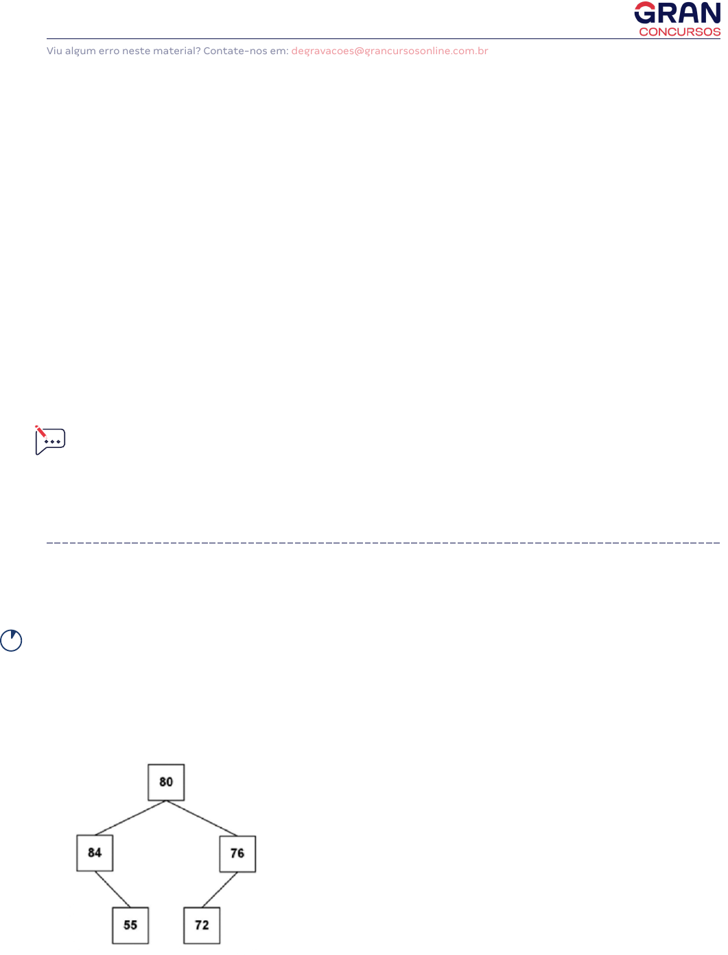 1www.grancursosonline.com.br Viu algum erro neste material? Contate-nos em: degravacoes@grancursosonline.com.br Estruturas de Dados - Árvores Binárias - Ordens de Percurso II DESENVOLVIMENTO DE SISTEMAS ESTRUTURAS DE DADOS - ÁRVORES BINÁRIAS ORDENS DE PERCURSO II 001. (IDECAN/2023/SEFAZ/RR/DESENVOLVEDOR DE SOFTWARE) A estrutura de dados em árvore é uma das mais importantes estruturas de dados não lineares utilizadas na programação. Selecione a alternativa que mostra as estratégias de ordenação de nós de uma árvore binária. a. malloc() b. Raiz; Nós; Folhas c. FIFO; LIFO; FEFO d. Pré-ordem; Pós-ordem e. Pré-ordem; Intra-ordem; Pós-ordem As estratégias de ordenação de nós de uma árvore binária são: Pré-ordem; Intra-ordem; Pós-ordem. 002. (CESGRANRIO/2023/BANCO DO BRASIL/AGENTE DE TECNOLOGIA/MICRORREGIÃO 158/TI) Um estudante de computação decidiu escrever um método Java para exibir, no console, em pré-ordem, os valores dos nós de uma árvore binária recebida como parâmetro. Ao executar esse método, os seguintes valores foram exibidos no console: • 80 84 55 76 72 Considerando os valores exibidos, qual árvore foi recebida como parâmetro? a. 5m 2www.grancursosonline.com.br Viu algum erro neste material? Contate-nos em: degravacoes@grancursosonline.com.br Estruturas de Dados - Árvores Binárias - Ordens de Percurso II DESENVOLVIMENTO DE SISTEMAS b. c. d. e. 3www.grancursosonline.com.br Viu algum erro neste material? Contate-nos em: degravacoes@grancursosonline.com.br Estruturas de Dados - Árvores Binárias - Ordens de Percurso II DESENVOLVIMENTO DE SISTEMAS [A] • Pré-ordem da questão: 80 84 55 76 72 • Pré-ordem: 80 84 55 76 72 • Em-ordem: 84 55 80 72 76 • Pós-ordem: 55 84 72 76 80 [B] • Pré-ordem da questão: 80 84 55 76 72 • Pré-ordem: 80 72 76 55 84 • Em-ordem: 76 72 80 55 84 • Pós-ordem: 76 72 84 55 80 [C] • Pré-ordem da questão: 80 84 55 76 72 • Pré-ordem: 72 84 55 76 80 • Em-ordem: 55 84 72 76 80 • Pós-ordem: 55 84 80 76 72 [D] • Pré-ordem da questão: 80 84 55 76 72 • Pré-ordem: 72 84 55 80 76 • Em-ordem: 55 84 72 80 76 • Pós-ordem: 55 84 76 80 72 [E] • Pré-ordem da questão: 80 84 55 76 72 • Pré-ordem: 55 84 72 76 80 • Em-ordem: 80 76 72 84 55 • Pós-ordem: 80 76 72 84 55 10m 15m 20m 4www.grancursosonline.com.br Viu algum erro neste material? Contate-nos em: degravacoes@grancursosonline.com.br Estruturas de Dados - Árvores Binárias - Ordens de Percurso II DESENVOLVIMENTO DE SISTEMAS 003. (FEPESE/2022/UDESC/ANALISTA DE SISTEMAS) Observe a figura abaixo que apresenta uma árvore. Assinale a alternativa que apresenta sequência decorrente do percurso pré-ordem (pre- order) dessa árvore binária. a. 90,70,66,50,35,44,31,25,24,22,1815,12,4,10 b. 4,10,12,15,18,22,24,25,31,35,44,50,66,70,90 c. 4,12,10,18,22,24,15,31,44,35,66,90,70,50,25 d. 4,12,18,24,31,44,66,90,10,22,35,70,15,50,25 e. 25,15,10,4,12,22,18,24,50,35,31,44,70,66,90 • Pré-ordem: 25 15 10 4 12 22 18 24 50 35 31 44 70 66 90 • Em-ordem: 4 10 12 15 18 22 24 25 31 35 44 50 66 70 90 • Pós-ordem: 4 12 10 18 24 22 15 31 44 35 66 90 70 50 25 [A] 90,70,66,50,35,44,31,25,24,22,1815,12,4,10 [B] 4,10,12,15,18,22,24,25,31,35,44,50,66,70,90 Em-ordem [C] 4,12,10,18,22,24,15,31,44,35,66,90,70,50,25 [D] 4,12,18,24,31,44,66,90,10,22,35,70,15,50,25 [E] 25,15,10,4,12,22,18,24,50,35,31,44,70,66,90 Pré-ordem GABARITO 1. e 2. a 3. e 25m 30m � Este material foi elaborado pela equipe pedagógica do Gran Concursos, de acordo com a aula preparada e ministrada pelo professor Rogério Gildo Araujo. A presente degravação tem como objetivo auxiliar no acompanhamento e na revisão do con- teúdo ministrado na videoaula. Não recomendamos a substituição do estudo em vídeo pela lei- tura exclusiva deste material.
