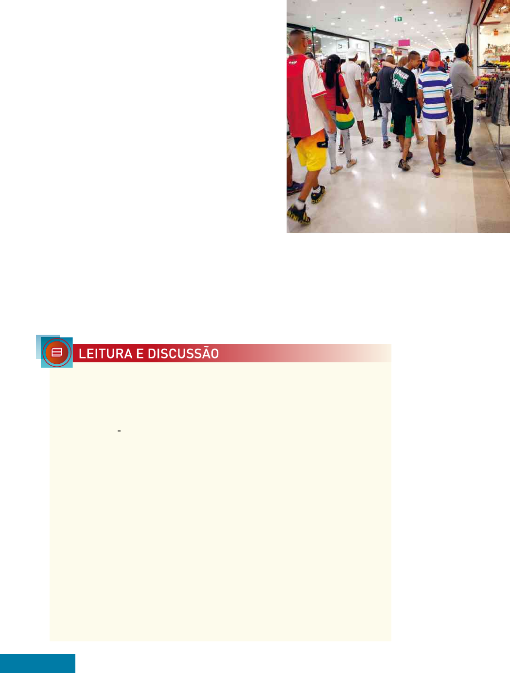 sociedade de consUMo No último século o desenvolvimento tecnológico acarretou um crescimento sem precedentes da pro- dução e a formação de uma sociedade fortemente estimulada ao consumo, que passou a exercer papel fundamental nas relações sociais. Vivemos em uma sociedade marcada pela desi- gualdade e na qual possuir determinados bens é uma demonstração de sucesso. A própria concepção de desenvolvimento econômico de um país está associada à capacidade de produzir e consumir bens materiais e outros serviços. para estimular a produção, o mercado cria hábitos e necessidades, reduz a vida útil dos produtos e multiplica as opções de mercadorias e embalagens descartáveis, estimulando a sociedade de consumo. Na fase atual, essa “lógica de mercado” apoia-se no desenvolvimento tecnológico incessante: novos produtos são criados ou a eles são acrescentados novos recursos, tornando a mercadoria obsoleta em um período cada vez mais curto (obsolescência planejada ou programada). As pessoas são estimuladas pelos meios de comunicação a consumir cada vez mais. As mensagens publicitárias, além de enaltecerem as qualidades de determinado produto, costumam associá-lo ao sucesso, ao prazer e à felicidade. Essa associação induz o consumidor a imaginar que a aquisição de determinado bem poderá propiciar ascensão social e realização pessoal (figura 4). Sobre a obsolescência planejada, veja Volume 2, Capítulo 9. Pode ser interessante problematizar a questão trazida pela imagem propondo uma discussão com os estudantes sobre consumismo, identidade e inserção na sociedade pela via da cultura do consumo. Essa discussão pode ser feita a partir dos rolezinhos ou de letras de música e do comportamento dos cantores do funk ostentação, e pode ser conduzida em uma abordagem interdisciplinar com Sociologia. Para apoiar as discussões, sugerimos a leitura de alguns textos e vídeos: Los Angeles Times discute os reflexos sociais da ascensão do funk ostentação. Jornal do Brasil, 10 abr. 2014. Disponível em: <www.jb.com. br/cultura/noticias/2014/04/10/los- angeles-times-discute-os-reflexos- sociais-da-ascensao-do-funk- ostentacao/>; e MOURA, Lisandro Lucas de Lima. Consumo, imaginário e “rolezinhos”. Blog Café com Sociologia, fev. 2014. Disponível em: <www. cafecomsociologia.com/2014/01/ consumo-imaginario-e-rolezinho. html>. Acessos em: dez. 2015. Figura 4. Adolescentes cami- nham em shopping center em São paulo (Sp), 2014. Sobre- tudo adolescentes e jovens são estimulados pela mídia a se sentir parte da sociedade por meio do consumo, por exemplo, de roupas, calçados, acessó- rios e eletrônicos de marca. por muito tempo, porém, par- cela da sociedade foi excluída desse “direito”. Os rolezinhos nos shopping centers das gran- des cidades brasileiras foram uma maneira de os jovens mais pobres dizerem à sociedade que eles querem consumir o que a mídia vende. A palavra é uma forma de resistência “Foi ao lembrar da infância na Romênia e da posterior mudança para a França que o autor [romeno] Matéi Visniec [1956-] explicou a 350 pessoas presentes à 4a Flica (Festa Literária Internacional de Cachoeira), cidade no Recôncavo Baiano, por que escrever é um ato político. Ao rememorar a censura que seus textos sofriam sob o regime de Nicolau Ceausescu [1918- -1989], ele contou que na primeira vez que publicou um texto percebeu a dimensão do poder que aquilo tinha: ‘Quando tinha 11 anos, publiquei um poema na revista da escola e me dei conta de que todo mundo poderia lê-lo. Foi a revelação da força da palavra. Decidi me tornar escritor e lutei para poder publicar as minhas palavras’, disse. ‘No país onde nasci, antes do fim do comunismo, era muito difícil conseguir fazer com que nossa palavra circulasse. Percebi ali que a palavra é uma forma de resistência, de se colocar contra a ditadura. A poesia era sempre mais forte que o poder. E, em um país onde não há liberdade, a cultura é um oxigênio social.’ Cansado da censura, em 1987 Visniec decidiu viver na França. A ideia que tinha de liberdade em países democráticos, no entanto, foi frustrada pelo estilo de vida capitalista que vigorava no país da Europa ocidental. ‘Entendi que nos grandes países democráticos existem outras formas de ditadura, e B r U N O p O L E t t I/ F O L h A p r E S S 226 Unidade 5 | natureza, sociedade e meio ambiente TS_V1_U5_CAP12_222-241.indd 226 5/7/16 1:30 PM 1. Por que o autor afirma que a palavra é uma forma de resistência? 2. A que o autor compara o consumismo? Explique. precisamos resistir também a outras formas de lavagem cerebral’, contou o autor [...]. ‘A minha impressão é que o meu papel não mudou, seja no tota- litarismo da Romênia e também no totalitarismo do consumo.’ [...] ‘Quando era jovem e escritor na Romênia, era muito fácil porque o mal era visível, sabíamos o que tínhamos de criticar, os símbolos do regime totalitário estavam presentes: o presidente, o partido, a polícia política’, disse. ‘Mas, nas grandes sociedades de consumo, às vezes não podemos ver onde está o mal. Na época de Stalin, era muito fácil criticar e identificar o mal. Mas como fazer isso hoje? Com a manipulação pela imagem, a indústria da televisão? Porque é muito mais fácil ter uma tela sem ter uma civilização por trás.’ [...]” GOMBATA, Marsílea. A palavra é uma forma de resistência, lembra Visniec. Carta Capital, 2 nov. 2014. Disponível em: <www.cartacapital.com.br>. Acesso em: nov. 2015. Ter ou Ser Observe o cartum do desenhista estadunidense Andy Singer (1965-). Filosofi a • Considerando a sociedade em que vivemos, explique o cartum. A N D y S IN g E r 227capítulo 12 – Questão socioambiental e desenvolvimento sustentável TS_V1_U5_CAP12_222-241.indd 227 5/7/16 1:30 PM