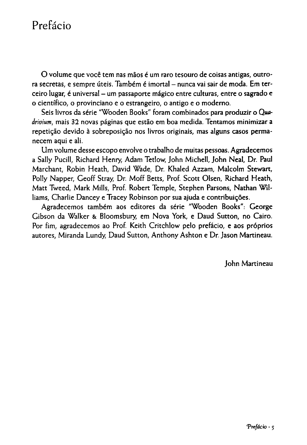 Prefácio O volume que você tem nas mãos é um raro tesouro de coisas antigas, outro- ra secretas, e sempre úteis. Também é imortal - nunca vai sair de moda. Em ter ceiro lugar, é universal - um passaporte mágico entre culturas, entre o sagrado e o científico, o provinciano e o estrangeiro, o antigo e o moderno. Seis livros da série "Wooden Books" foram combinados para produzir o Qua- driviutn, mais 32 novas páginas que estão em boa medida. Tentamos minimizar a repetição devido à sobreposição nos livros originais, mas alguns casos perma necem aqui e ali. Um volume desse escopo envolve o trabalho de muitas pessoas. Agradecemos a Sally Pucill, Richard Henry, Adam Tetlow, John Michell, John Neal, Dr. Paul Marchant, Robin Heath, David Wade, Dr. Khaled Azzam, Malcolm Stewart, Polly Napper, Geoff Stray, Dr. Moff Betts, Prof. Scott Olsen, Richard Heath, Matt Tweed, Mark Mills, Prof. Robert Temple, Stephen Parsons, Nathan Wil liams, Charlie Dancey e Tracey Robinson por sua ajuda e contribuições. Agradecemos também aos editores da série "Wooden Books": George Gibson da Walker & Bloomsbury, em Nova York, e Daud Sutton, no Cairo. Por fim, agradecemos ao Prof. Keith Critchlow pelo prefacio, e aos próprios autores, Miranda Lundy, Daud Sutton, Anthony Ashton e Dr. Jason Martineau. John Martineau ‘Prefácio - 5 O tetraktyj dos pitagóricos ampliado pelo lambda do Timeu. Platão manteve tris números escondi dos e revdou apenas sete: 1,2,3,4,8,9e 27, em relação aos planetas. Seixos ou khálix (forma grega para “cal’: resíduos dl minerais ou metais após a calcinação) era a norma grega para a matemática.