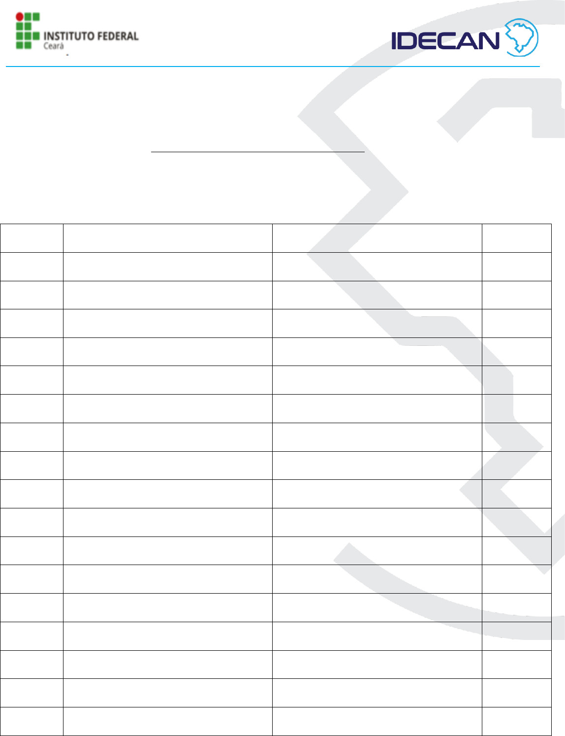 1 EDITAL Nº 2/2021/GABR/REITORIA–IFCE, DE 8 DE SETEMBRO DE 2021 CONCURSO PÚBLICO PARA PROVIMENTO DE CARGO DE PROFESSOR DE ENSINO BÁSICO, TÉCNICO E TECNOLÓGICO RESULTADO DEFINITIVO DA PROVA DE TÍTULOS 1. Resultado Definitivo da Prova de Títulos do Concurso Público para provimento de PROFESSOR DE ENSINO BÁSICO, TÉCNICO E TECNOLÓGICO, do Quadro de Pessoal Permanente do INSTITUTO FEDERAL DE EDUCAÇÃO, CIÊNCIA E TECNOLOGIA DO CEARÁ, realizada somente pelos candidatos aprovados na Prova de Desempenho Didático: INSCRIÇÃO NOME CARGO PONTUAÇÃO 609929 AISLANE RODRIGUES DE SOUSA CÓD. 1001 - ADMINISTRAÇÃO - SUBÁREA: ADMINISTRAÇÃO DE EMPRESAS 58,00 615033 ALEXANDRE AUGUSTO ALVES GUEDES CÓD. 1001 - ADMINISTRAÇÃO - SUBÁREA: ADMINISTRAÇÃO DE EMPRESAS 70,00 614790 DANIEL BARBOSA DA FONSECA CÓD. 1001 - ADMINISTRAÇÃO - SUBÁREA: ADMINISTRAÇÃO DE EMPRESAS 12,00 581978 DANIELLE FRANÇA RIBEIRO CÓD. 1001 - ADMINISTRAÇÃO - SUBÁREA: ADMINISTRAÇÃO DE EMPRESAS 20,00 599500 DANILO GONÇALVES RODRIGUES CÓD. 1001 - ADMINISTRAÇÃO - SUBÁREA: ADMINISTRAÇÃO DE EMPRESAS 30,00 614236 FERNANDA ROSALINA DA SILVA MEIRELES CÓD. 1001 - ADMINISTRAÇÃO - SUBÁREA: ADMINISTRAÇÃO DE EMPRESAS 60,00 583021 GILLIARD SANTOS DA SILVA CÓD. 1001 - ADMINISTRAÇÃO - SUBÁREA: ADMINISTRAÇÃO DE EMPRESAS 51,00 625305 HÉRIQUE COSTA RIBEIRO DE LIMA CÓD. 1001 - ADMINISTRAÇÃO - SUBÁREA: ADMINISTRAÇÃO DE EMPRESAS 30,00 554621 JANIELSON DE CASTRO LOPES CÓD. 1001 - ADMINISTRAÇÃO - SUBÁREA: ADMINISTRAÇÃO DE EMPRESAS 0,00 570418 JOSE ARI COSME DE LIMA MACIEL FILHO CÓD. 1001 - ADMINISTRAÇÃO - SUBÁREA: ADMINISTRAÇÃO DE EMPRESAS 36,00 584189 JOSÉ EVANDRO DA SILVA FIGUERÊDO CÓD. 1001 - ADMINISTRAÇÃO - SUBÁREA: ADMINISTRAÇÃO DE EMPRESAS 54,00 589734 JOSÉ JACINTO DO NASCIMENTO JÚNIOR CÓD. 1001 - ADMINISTRAÇÃO - SUBÁREA: ADMINISTRAÇÃO DE EMPRESAS 8,00 582152 JÚLIO CÉSAR DA COSTA JÚNIOR CÓD. 1001 - ADMINISTRAÇÃO - SUBÁREA: ADMINISTRAÇÃO DE EMPRESAS 51,00 619971 KATARINA LEAL CHAVES LACERDA CÓD. 1001 - ADMINISTRAÇÃO - SUBÁREA: ADMINISTRAÇÃO DE EMPRESAS 86,00 587732 LINÁRIA DE MELO OLIVEIRA CÓD. 1001 - ADMINISTRAÇÃO - SUBÁREA: ADMINISTRAÇÃO DE EMPRESAS 26,00 605698 MAYARA RODRIGUES DA SILVA SOUSA CÓD. 1001 - ADMINISTRAÇÃO - SUBÁREA: ADMINISTRAÇÃO DE EMPRESAS 22,00 605133 SUZANA MELISSA DE MOURA MAFRA DA SILVA CÓD. 1001 - ADMINISTRAÇÃO - SUBÁREA: ADMINISTRAÇÃO DE EMPRESAS 30,00 2 INSCRIÇÃO NOME CARGO PONTUAÇÃO 580727 ALDIR DIAS DE AMURIM CÓD. 1002 - ADMINISTRAÇÃO - SUBÁREA: CIÊNCIAS CONTÁBEIS 22,00 608300 CINTHYA RACHEL FIRMINO DE MORAIS CÓD. 1002 - ADMINISTRAÇÃO - SUBÁREA: CIÊNCIAS CONTÁBEIS 42,00 616016 CYUMARA KALYANE MORAIS LIMA CÓD. 1002 - ADMINISTRAÇÃO - SUBÁREA: CIÊNCIAS CONTÁBEIS 20,00 559434 DANIELLE SALES SILVA CÓD. 1002 - ADMINISTRAÇÃO - SUBÁREA: CIÊNCIAS CONTÁBEIS 2,00 614569 KEILA PATRÍCIA DA ROCHA CÓD. 1002 - ADMINISTRAÇÃO - SUBÁREA: CIÊNCIAS CONTÁBEIS 8,00 581116 MÁRCIO CÉSAR DE OLIVEIRA QUIRINO CÓD. 1002 - ADMINISTRAÇÃO - SUBÁREA: CIÊNCIAS CONTÁBEIS 74,00 587733 PATRICIA MARIA VIANA DE CASTRO (Sub judice) CÓD. 1002 - ADMINISTRAÇÃO - SUBÁREA: CIÊNCIAS CONTÁBEIS 28,00 576871 VICENTE HUDSON SOUSA PEREIRA CÓD. 1002 - ADMINISTRAÇÃO - SUBÁREA: CIÊNCIAS CONTÁBEIS 44,00 624384 FRANCISCO DE ASSIS DA SILVA CÓD. 1003 - AGRONOMIA - SUBÁREA: CIÊNCIAS ECONÔMICAS SOCIAIS E PROCESSAMENTO DE PRODUTOS AGROPECUÁRIOS 31,00 623546 KATIA ARAUJO RIBEIRO CÓD. 1003 - AGRONOMIA - SUBÁREA: CIÊNCIAS ECONÔMICAS SOCIAIS E PROCESSAMENTO DE PRODUTOS AGROPECUÁRIOS 48,00 588886 NIELYSON JUNIO MARCOS BATISTA CÓD. 1003 - AGRONOMIA - SUBÁREA: CIÊNCIAS ECONÔMICAS SOCIAIS E PROCESSAMENTO DE PRODUTOS AGROPECUÁRIOS 54,00 605925 THIAGO COSTA DOS SANTOS CÓD. 1003 - AGRONOMIA - SUBÁREA: CIÊNCIAS ECONÔMICAS SOCIAIS E PROCESSAMENTO DE PRODUTOS AGROPECUÁRIOS 18,00 555041 VALDENIO MENDES MASCENA CÓD. 1003 - AGRONOMIA - SUBÁREA: CIÊNCIAS ECONÔMICAS SOCIAIS E PROCESSAMENTO DE PRODUTOS AGROPECUÁRIOS 75,00 611416 ANA MARIA PEREIRA BISPO DE CASTRO CÓD. 1004 - AGRONOMIA - SUBÁREA: FITOTECNIA 42,00 566172 GEANDERSON NASCIMENTO DA SILVA CÓD. 1004 - AGRONOMIA - SUBÁREA: FITOTECNIA 38,00 572464 LUCAS BOSCOV BRAOS CÓD. 1004 - AGRONOMIA - SUBÁREA: FITOTECNIA 40,00 567842 RONALDO SILVA GOMES CÓD. 1004 - AGRONOMIA - SUBÁREA: FITOTECNIA 48,00 558210 SIRLENE LOPES DE OLIVEIRA CÓD. 1004 - AGRONOMIA - SUBÁREA: FITOTECNIA 18,00 3 INSCRIÇÃO NOME CARGO PONTUAÇÃO 551929 TIAGO DE SOUSA LEITE CÓD. 1004 - AGRONOMIA - SUBÁREA: FITOTECNIA 44,00 565460 YNAYANNA NARIZA MEDEIROS SILVA CÓD. 1004 - AGRONOMIA - SUBÁREA: FITOTECNIA 18,00 580149 BRUNO CALDEIRA CÓD. 1005 - ARTES - SUBÁREA: CANTO POPULAR 27,00 680426 CRISYANI SOARES LIMA CÓD. 1005 - ARTES - SUBÁREA: CANTO POPULAR 34,00 579814 FRANCISCA AMANDA BEZERRA FELIX CÓD. 1005 - ARTES - SUBÁREA: CANTO POPULAR 0,00 616259 JARDANNY MARREIRO BARROS DA SILVA CÓD. 1005 - ARTES - SUBÁREA: CANTO POPULAR 6,00 611100 RAFAEL GOMES CRUZ CÓD. 1005 - ARTES - SUBÁREA: CANTO POPULAR 0,00 567078 REGIS LUIS DE CARVALHO SILVA CÓD. 1005 - ARTES - SUBÁREA: CANTO POPULAR 34,00 583938 VICENTE DE PAULO BARROSO ALVES CÓD. 1005 - ARTES - SUBÁREA: CANTO POPULAR 33,00 590970 JULIANA COPETTI HICKMANN CÓD. 1007 - ARTES - SUBÁREA: PINTURA 58,00 590339 NAYANA CAMURCA DE LIMA CÓD. 1007 - ARTES - SUBÁREA: PINTURA 20,00 566597 VIVIANE COSTA VILELLA CÓD. 1007 - ARTES - SUBÁREA: PINTURA 4,00 626190 BRENO CÉSAR DE ALBUQUERQUE CUNHA CÓD. 1008 - ARTES - SUBÁREA: TECLAS PIANO TECLADO ELÉTRICO ACORDEOM 37,00 610119 GEORGE DE ALMEIDA PESSOA CÓD. 1008 - ARTES - SUBÁREA: TECLAS PIANO TECLADO ELÉTRICO ACORDEOM 51,00 600511 RAILTON RÔMULO DA CUNHA MENEZES CÓD. 1008 - ARTES - SUBÁREA: TECLAS PIANO TECLADO ELÉTRICO ACORDEOM 27,00 593719 RENAN GREGÓRIO CRUZ CÓD. 1008 - ARTES - SUBÁREA: TECLAS PIANO TECLADO ELÉTRICO ACORDEOM 34,00 582785 ROSIVAL CARDOSO DE QUEIROZ CÓ