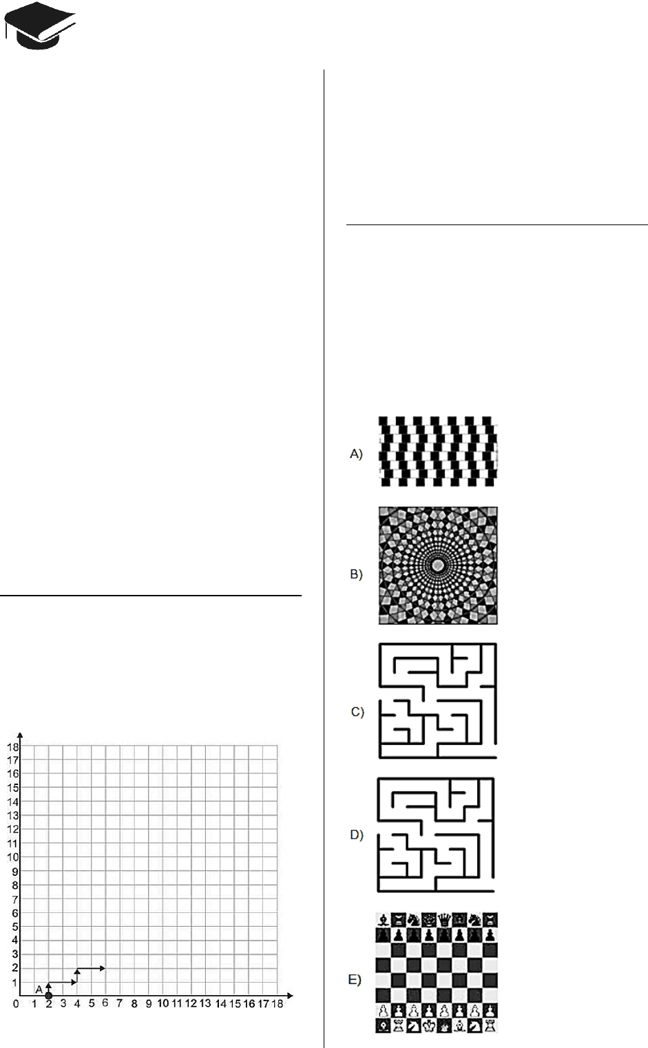 CADERNO MATEMÁTICA ENEM 2009 a 2018 30 novocadernoenem@gmail.com Questão 100 (2009.3) Ao retornarem de avião à sua cidade, 100 pes- soas foram infectadas por um vírus contagioso exatamente na hora que desembarcaram na cidade. Anteriormente a esse episódio de con- tágio, esse vírus não existia na cidade, e sabe- se que ele é transmitido em 50% das vezes que duas pessoas trocam apertos de mão. Entretan- to, o contágio só pode ocorrer entre o momento de contágio e 24 horas após esse momento. Considerando que as informações do texto es- tão corretas e que, em média, as pessoas na referida cidade trocam apertos de mão, em mé- dia, 3 vezes por dia, é correto concluir que A) há uma grande probabilidade de que o núme- ro de contaminados na cidade aumente nos próximos dias. B) há uma grande probabilidade de que o núme- ro de contaminados na cidade diminua nos pró- ximos dias. C) há uma grande probabilidade de que o nú- mero de contaminados permaneça inalterado nos próximos dias. D) campanhas para diminuir o número médio de apertos de mão na cidade para meio por dia não seriam efetivas para fazer que o número de infectados caia nos próximos dias. E) se o tempo de contágio do vírus fosse de 20 horas em vez de 24 horas, não deverá haver o aumento de contágio nos próximos dias. Questão 101 (2009.3) O gráfico a seguir mostra o início da trajetória de um robô que parte do ponto A (2, 0), movi- mentando-se para cima ou para a direita, com velocidade de uma unidade de comprimento por segundo no plano cartesiano. O gráfico exempli- fica uma trajetória desse robô, durante 6 segun- dos. Supondo que esse robô continue essa mesma trajetória, qual será sua coordenada após 18 segundos de caminhada, contando o tempo a partir do ponto A? A) (14, 6) B) (6, 14) C) (18, 0) D) (0, 18) E) (18, 2) Questão 102 (2009.3) Simetrias são encontradas, frequentemente, em nosso dia-a-dia. Elas estão nas asas de uma borboleta, nas pétalas de uma flor ou em uma concha do mar. Em linguagem informal, uma figura no plano é simétrica quando for possível dobrá-la em duas partes, de modo que essas partes coincidam completamente. De acordo com a descrição acima, qual das figuras a seguir é simétrica?
