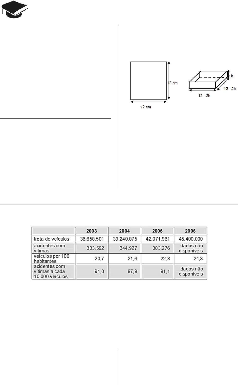 CADERNO MATEMÁTICA ENEM 2009 a 2018 38 novocadernoenem@gmail.com De acordo com o texto, o consumo anual de combustível da frota de veículos daquela cidade corresponde a: A) retirar 136.000 kg de CO2 da atmosfera e injetar 7.960 kg de O2. B) retirar 84.000.000 kg de CO2 da atmosfera e injetar 42.600.000 kg de O2. C) retirar 42.000 kg de CO2 da atmosfera e inje- tar 21.000 kg de O2. D) retirar 228.000.000 kg de CO2 da atmosfera e injetar 183.600.000 kg de O2. E) retirar 136.000.000 kg de CO2 da atmosfera e injetar 79.600.000 kg de O2. Questão 130 (2009.3) Muitas indústrias têm procurado modificar as embalagens de seus produtos de forma a eco- nomizar material, mas mantendo o mesmo vo- lume. Considere que se tenha uma folha de papelão quadrada e se deseje encontrar a me- lhor altura (h) para fazer uma caixa sem tampa, cortando-se os quatro cantos da folha. As exi- gências são que as dimensões da caixa sejam números inteiros e que o volume seja o maior possível. No modelo apresentado na figura se- guinte, a folha tem 12 cm de lado e, nesse caso, a caixa de maior volume terá altura 2 cm. Para encontrar esse número, é calculado o volume em função da altura e prossegue-se atribuindo valores a h e calculando o volume, enquanto o valor do volume aumentar. Se a folha quadrada tiver 20 cm de lado, qual deve ser a medida do lado do quadrado a ser cortado em cada um dos cantos, de modo a obter uma caixa sem tampa cujas dimensões sejam números inteiros e cujo volume seja o maior possível? A) 6 cm B) 3 cm C) 5 cm D) 2 cm E) 4 cm Questão 131 (2009.3) O quadro a seguir apresenta dados sobre a frota de veículos, e as estatísticas de acidentes de trânsito no Brasil no período compreendido entre 2003 e 2006. Suponha que, em 2006, o indicador relativo à quantidade de acidentes com vítimas a cada 10.000 veícu- los tenha sido a média dos valores correspondentes a esse indicador nos anos de 2003 a 2005. Nesse caso, o total de acidentes com vítimas ocorridos em 2006 foi igual a: A) 413.594. B) 353.932. C) 408.600. D) 399.066 E) 433.053. Questão 132 (2009.3) Adultos e crianças têm o hábito de colecionar miniaturas de carros. Vários padrões de coleção são encontrados, desde modelos com marcas específicas até modelos de um determinado período. A “fidelidade” ao modelo original das miniaturas encanta qualquer pessoa, isso é possível, entre outros itens, pela “obediência” às proporções de um veículo original. São encon- trados carros em miniatura numa escala de 1:90 ou 1:45.