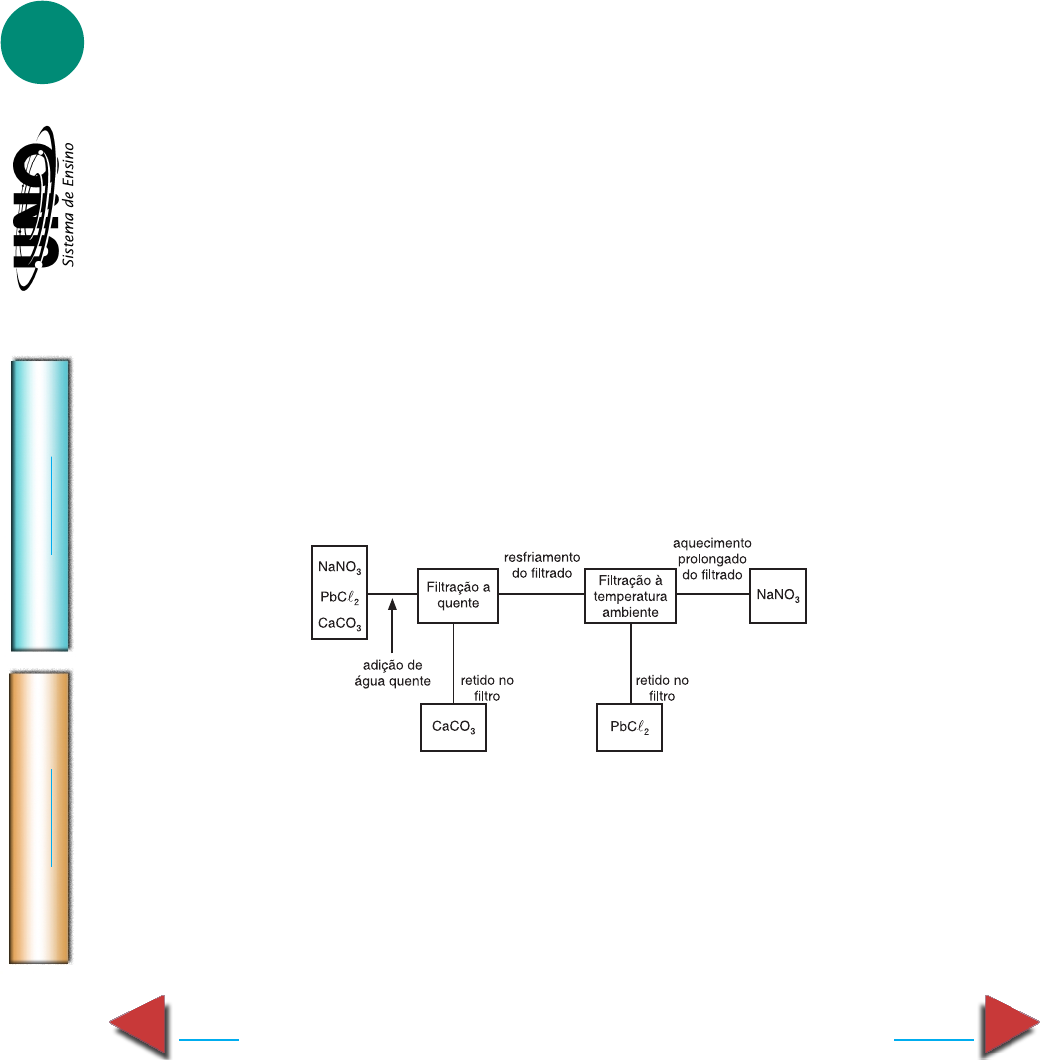 QUÍMICA - Compostos inorgânicos IM PR IM IR Voltar GA BA RI TO Avançar 11 53. UNICAMP-SP O tratamento da água é fruto do desenvolvimento científico que se tra- duz em aplicação tecnológica relativamente simples. Um dos processos mais comuns para o tratamento químico da água utiliza cal virgem (óxido de cálcio) e sulfato de alu- mínio. Os íons alumínio, em presença de íons hidroxila, formam o hidróxido de alumínio que é pouquíssimo solúvel em água. Ao hidróxido de alumínio formado adere a maioria das impurezas presentes. Com a ação da gravidade, ocorre a deposição dos sólidos. A água é então separada e encaminhada a uma outra fase de tratamento. a) Que nome se dá ao processo de separação acima descrito que faz uso da ação da gravidade? b) Por que se usa cal virgem no processo de tratamento da água? Justifique usando equação(ões) química(s). c) Em algumas estações de tratamento de água usa-se cloreto de ferro (III) em lugar de sulfato de alumínio. Escreva a fórmula e o nome do composto de ferro formado nesse caso. 54. Unifor-CE Borbulhando-se, em água, os produtos gasosos da decomposição do carba- mato de amônio forma-se, principalmente, solução de: a) “gelo seco”; b) ácido carbônico; c) hidróxido de amônio; d) amônia líquida; e) carbonato de amônio. 55. UFSE A maioria dos sais dos elementos do grupo 1 (exceto H) da Tabela Periódica são solúveis em água, o que não acontece com os do grupo 2, sendo, por exemplo, os cloretos solúveis em água, enquanto que os carbonatos e sulfatos são de maneira geral, pouco solúveis. Assim, considerando-se os seguintes sais: carbonato de cálcio, cloreto de magnésio e sulfato de sódio seria mais provável que se encontrasse dissolvido na água do mar, a) sulfato de sódio, somente; b) carbonato de cálcio, somente; c) cloreto de magnésio e o carbonato de cálcio; d) sulfato de sódio e o cloreto de magnésio; e) sulfato de sódio e o carbonato de cálcio. 56. UFSE Tem-se uma mistura de 3 sais: NaNO3, PbCl2 e CaCO3 que foi submetida as operações descritas no esquema a seguir. Partindo-se de massas iguais desses sais, a ordem crescente de solubilidade em água, a temperatura ambiente, e: a) PbC� 2 , CaCO 3 NaNO 3 b) NaNO 3 , CaCO 3 , PbC� 2 c) NaNO 3 , PbC� 2 , CaCO 3 d) CaCO 3 , PbC� 2 , NaNO 3 e) CaCO 3 , NaNO 3 , PbC� 2 QUÍMICA - Compostos inorgânicos IM PR IM IR Voltar GA BA RI TO Avançar 12 57. ITA-SP I. A chuva ácida é um problema ambiental que atinge os grandes centros industriais. A liberação de óxidos de enxofre na queima de combustível em larga escala é uma das principais causas desse problema. Para evitar que esses gases sejam despejados na atmosfera, as fábricas devem utilizar filtros contendo X. II. O suco gástrico é o responsável pela etapa de digestão que ocorre no estômago. Esse suco contém uma solução aquosa de ácido clorídrico e as enzimas responsáveis pela hidrólise das proteínas. Uma disfunção comum no estômago é o excesso de acidez, causando azia e gastrite. Para combater o excesso de acidez no estômago, pode-se tomar Y como medicamento. III. Os refrigerantes são soluções que contêm grande quantidade de açúcar, tornando-se um meio propício para o desenvolvimento de fungos e bactérias. Para conservá-los, é ne- cessário manter o seu pH baixo (em torno de 3) e, para isso, é geralmente utilizado Z. IV. A alternativa que apresenta as substâncias adequadas para as situações descritas é X Y Z a) Dióxido de manganês Hidróxido de magnésio Hidróxido de sódio b) Cloreto de cálcio Hidróxido de sódio Ácido clorídrico c) Óxido de cálcio Ácido ascórbico Ácido acético d) Óxido de alumínio Bicarbonato de sódio Cloreto de sódio e) Óxido de cálcio Carbonato de sódio Ácido fosfórico 58. U. Salvador-BA Em muitas regiões do estado, quando se cavam poços ou cisternas, obtém-se água dura. Em relação a esse líquido, é correto afirmar: a) Possui considerável quantidade de íons Na+, K+. b) É poluído, tóxico para os seres vivos. c) Possui moléculas com deutério e tritio. d) É conhecido como água carbonatada. e) É rico em sais de cálcio e magnésio. 59. UFRN O NaHCO3, carbonato monoácido de sódio, mais conhecido como bicarbonato de sódio, é usado como fermento químico porque, quando aquecido, produz: a) H2CO3 c) CO b) CO2 d) NaH 60. FUVEST-SP Um químico leu a seguinte instrução num procedimento descrito no seu guia de laboratório: “Dissolva 5,0 g do cloreto em 100 mL de água, à temperatura ambiente…” Dentre as substâncias abaixo, qual pode ser a mencionada no texto? a) Cl 2 b) CCl 4 c) NaClO d) NH 4 Cl e) AgCl 61. UFPB A água do mar pode ser fonte de sais usados na fabricação de fermento em pó, de água sanitária e de soro fisiológico. Os principais constituintes ativos desses materiais são, respectivamente, a) Na2CO3, HC� e NaC� b) NaHCO3, C�2 e CaC�2 c) NaHCO3, NaOC� e NaC� d) Na2CO3, NaC� e KC� e) NaOC�, NaHCO3 e NaC� 62. UFRN As substâncias puras podem ser classificadas, por exemplo, de acordo com sua com- posição e sua estrutura. Essas características determinam as diversas funções químicas. As substâncias NaOH, HC� e MgC� 2 são classificadas, respectivamente, como: a) ácido, sal e hidróxido; c) sal, oxi-sal e hidróxido; b) oxi-sal, oxi-ácido e ácido; d) hidróxido, ácido e sal.