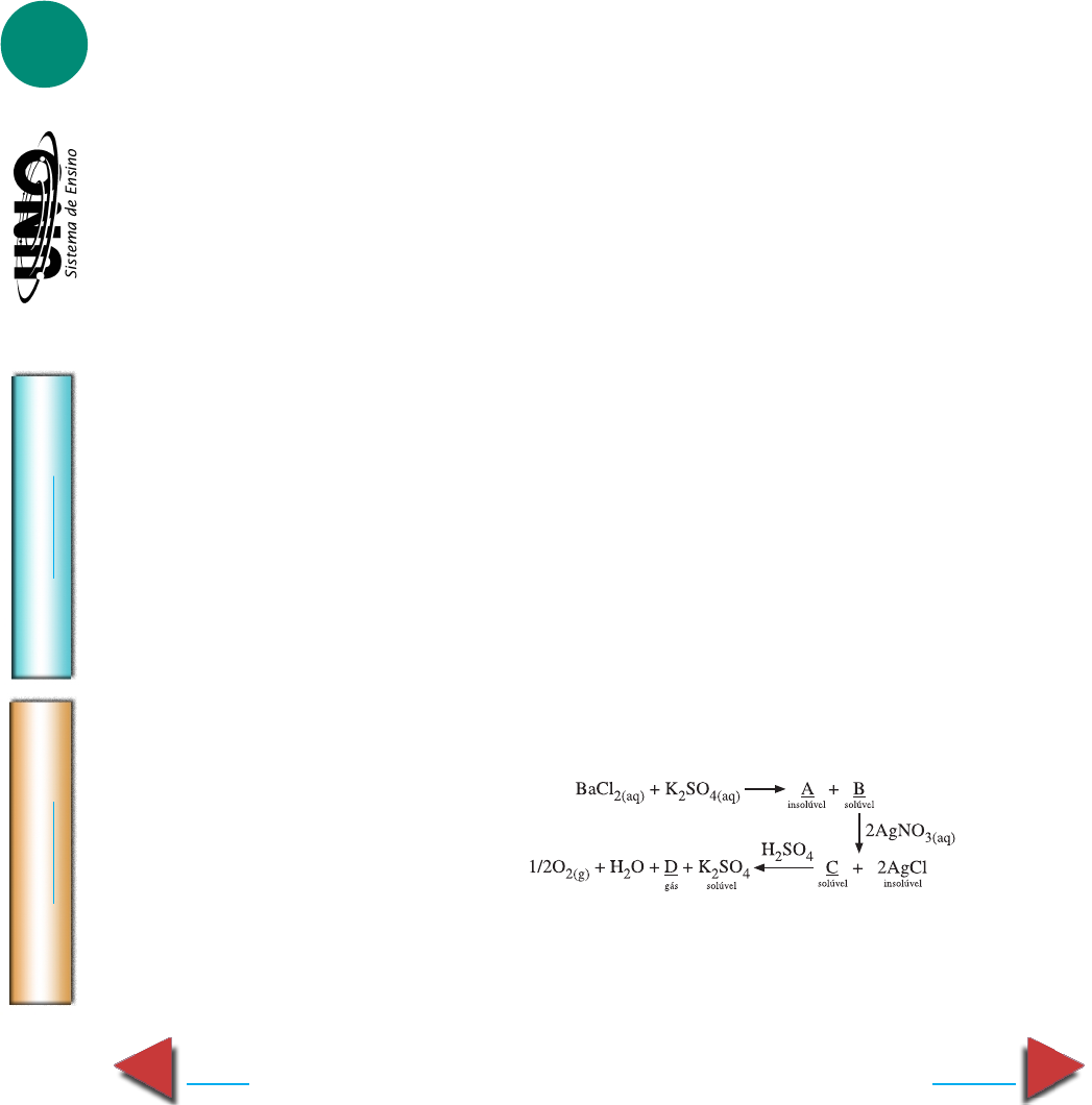 QUÍMICA - Tipos de reações químicas IM PR IM IR Voltar GA BA RI TO Avançar 2 5. Univali-SC Você sabe como são pressurizadas as bolas de tênis? Antes que as duas partes da bola sejam seladas, pequenas quantidades de NH4Cl e NaNO2 são colocadas dentro de cada uma das metades. O calor utilizado para selar essas duas partes provoca as seguintes reações: NH4Cl + NaNO2 → NH4NO2 + NaCl NH4NO2 → N2 + 2H2O Qual gás é o responsável pela pressurização da bola? a) NH4NO2 b) NH4Cl c) NaCl d) NaNO2 e) N2 6. UFSE Na embalagem de certo comprimido antiácido efervescente verifica-se a presen- ça dos seguintes componentes: I. acido cítrico II. bicarbonato de sódio III. carbonato de sódio IV. citrato de sódio Colocando o comprimido em água, há liberação de dióxido de carbono decorrente da inte- ração da água com: a) I e IV b) II e III c) III e IV d) I, II e III e) II, III e IV 7. U. Alfenas-MG O SO 2 é um gás incolor, tóxico e um seríssimo poluente atmosférico. Uma das formas desse óxido ser obtido é pela queima de enxofre com o oxigênio do ar. O SO 2 no ar oxida-se parcialmente a SO 3 que se dissolve na água da chuva, produzindo a chuva ácida, que contém H 2 SO 4 . A chuva ácida produz danos à vegetação e para comba- ter a acidez do solo é comum o uso de cal viva, CaO, que em contato com a água produz Ca(OH) 2 . Com base nessas informações assinale a alternativa correta. a) A reação de formação do SO2 é um exemplo de reação de síntese total, a reação que se refere ao combate à acidez trata-se de uma reação de neutralização. b) O SO3 e o CaO reagem com a água por se tratarem de um óxido anfótero e básico, respectivamente. c) Na síntese parcial do SO3 ocorre alteração do número de oxidação do enxofre de +6 para +4, tratando-se portanto, de um processo redox. d) Na reação de combate à acidez obtém-se um sal de cálcio, conhecido como sulfito de cálcio e água. e) Deve-se ter muito cuidado com o manuseio da cal viva, pois trata-se de uma substân- cia facilmente absorvida pelo organismo, o que causa sérios danos à saúde. 8. F.M. IItajubá-MG Zn , ZnO e Zn (OH)2 são anfotéricos, logo: 1. Zn(OH)2 + 2NaOH → Na2ZnO2 + H2 2. Zn + 2HCl → ZnCl2 + H2 3. ZnO + 2NaOH → Na2ZnO2 + H2O 4. ZnO + 2HCl → ZnCl2 + 2H2O 5. Zn(OH)2 + 2HCl → ZnCl2 + H2O 6. Zn + 2NaOH → Na2ZnO2 + H2 Considerando as equações químicas acima, do modo quantitativo como se apresentam, concluímos que são reações exeqüíveis: a) 1, 3, 5 b) 2, 4, 6 c) 4, 5, 6 d) 2, 3, 6 e) 1, 5, 6 9. U.F. Juiz de Fora-MG Com rela- ção à seqüência de reações abaixo, assinale a alternativa incorreta: a) o composto A formado é o sal de cloreto de potássio; b) a relação estequiométrica en- tre B e nitrato de prata é de 1:1; c) a reação entre C e ácido sulfúrico é classificada como uma reação de oxi-redução; d) o produto D obtido é o dióxido de nitrogênio. QUÍMICA - Tipos de reações químicas IM PR IM IR Voltar GA BA RI TO Avançar 3 10. U.F. Juiz de Fora-MG A tabela periódica apresentada destaca os elementos químicos que têm importância biológica. Com relação aos compostos formados por alguns desses elementos, podemos afirmar: a) o magnésio sólido reage com o oxigênio com formação de Mg(OH) 2 ; b) o ferro, ao reagir com o oxigênio, forma um óxido ácido; c) o zinco, quando em contato com vapores de água à alta temperatura, produz hidrogê- nio e ZnO, um óxido anfótero e insolúvel em água; d) o oxigênio apresenta alta energia de ionização e forma apenas compostos iônicos. 11. U.E. Londrina-PR O iodo pode ser obtido a partir dos iodetos naturais, tais como NaI, ao se tratar soluções aquosas do iodeto com: a) cal extinta; d) soda cáustica; b) cloreto de sódio; e) cloro. c) ácido clorídrico; 12. PUC-PR Dada a reação: Na2CO3(aq) + H2SO4(aq) → ao completá-la, obter-se-á : a) um sal insolúvel; b) um produto gasoso; c) um ácido insolúvel; d) uma base insolúvel; e) uma base solúvel. 13. PUC-PR Com base nas propriedades funcionais das substâncias inorgânicas, uma das reações abaixo não ocorre. a) 2NaNO3 + H2SO4 → 2HNO3 + Na2SO4 b) H3PO4 + 3KOH → K3PO4 + 3H2O c) Cl2 + 2NaBr → 2NaCl + Br2 d) AgNO3 + NaOH → AgOH + NaNO3 e) CaO + H2O → Ca(OH)2 14. UFR-RJ Dadas as substâncias (PbCl2, Na2SO4, Zn, H2SO4, C, O2 e Na2S), combine-as duas a duas de tal modo que se obtenha um produto com: a) formação de um precipitado; c) formação de um hidrácido; b) formação de um óxido gasoso; d) variação do número de oxidação. 15. UFRN A quimiossíntese é um processo biológico que tem semelhança com a fotossín- tese. Um tipo de quimiossíntese é realizado pelas sulfobactérias. A equação que repre- senta essa reação é: 2 H2S + O2 → 2 H2O + 2 S Pode-se afirmar que essa reação é do tipo: a) dupla troca; c) oxidação-redução; b) síntese; d) neutralização. 16. U. Uberaba-MG/Pias Quando se lava um ferimento com solução a 3% de peróxido de hidrogênio, H 2 O 2 , obtido em farmácias como água oxigenada, a solução borbulha indi- cando que houve interação com um componente presente no sangue produzindo gás. Assinale a afirmativa correta: a) Hidrogênio b) Oxigênio c) Hidrogênio e oxigênio d) Gás carbônico