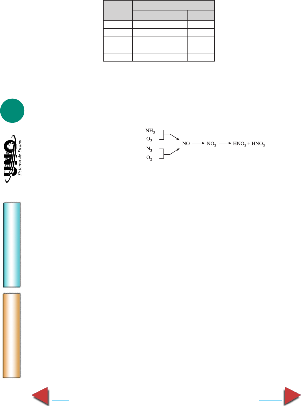 QUÍMICA - Tipos de reações químicas IM PR IM IR Voltar GA BA RI TO Avançar 4 17. UFRJ O desenvolvimento da ciência depende tanto da formulação de teorias quanto de experimentos rigorosamente realizados; por esse motivo, a produção e a interpretação de dados obtidos experimentalmente deve ser o fundamento básico do ensino da Química. A tabela a seguir fornece valores experimentais das 1ª. , 2ª. e 3ª. energias de ionização dos cinco únicos metais localizados no segundo e no terceiro períodos da classificação periódi- ca, representados pelas letras A, B, C, D e E. a) Identifique o elemento representado pela letra C e apresente a equação da sua reação com o ácido clorídrico. b) Escreva a fórmula e classifique o óxido do elemento representado pela letra A. 18. UFRJ O ácido nítrico é um produto industrial da maior importância. Ele é fundamental para a indústria de explosivos (trinitrotolueno – TNT), para a indústria de fertilizantes (nitratos) e em muitas outras aplicações. O esquema ao lado representa o processo de obtenção do ácido nítrico a partir do nitrogênio e do amoníaco. a) Observe a reação do amonía- co com o oxigênio. Além do NO, um outro composto, que não está representado no esquema, é produzido. Apresente a equação desta reação. b) Escreva a equação da reação de neutralização do ácido nítrico com o hidróxido de bário. 19. PUC-PR Quais das substâncias abaixo, que, em solução aquosa, ao reagirem, formam um produto gasoso: Na2CO3 H2SO4 Mg(OH)2 KMnO4 CaO a) CaO + H2O → b) Na2CO3 + KMnO4 → c) Na2CO3 + H2SO4 → d) H2SO4 + Mg(OH)2 → e) CaO + Mg(OH)2 → 20. ITA-SP Quando carbeto de alumínio (Al 4 C 3 ) é adicionado em um béquer contendo água líquida a 25 °C, ocorre a formação de hidróxido de alumínio e a liberação de um gás. O gás formado é o a) H 2 b) CO c) CO 2 d) CH 4 e) C 2 H 2 21. VUNESP A reação de obtenção de amônia (NH 3 ), pelo processo Haber, a partir dos gases hidrogênio (H 2 ) e nitrogênio (N 2 ), pode ser classificada como a) reação de análise com expansão de volume. b) reação de síntese com contração de volume. c) reação de simples troca com liberação de calor. d) reação de dupla troca com liberação de calor. e) reação de óxido-redução com expansão de volume. A B C D E Energias de ionização em eV 6,0 5,4 7,6 5,1 9,3 Elementos (metais) 18,8 75,6 15,0 47,3 18,2 28,4 122,4 80,1 71,6 153,9 1ª. 2ª. 3ª. QUÍMICA - Tipos de reações químicas IM PR IM IR Voltar GA BA RI TO Avançar 5 22. Mackenzie-SP A argamassa, que é um produto usado por pedreiros para assentar tijolos, é uma mistura de cal extinta, areia e água. A cal extinta (hidróxido de cálcio) combina-se com o gás carbônico do ar, produzindo carbonato de cálcio, que endurece e prende a areia e, conseqüentemente, os tijolos. A equação corretamente balanceada que represen- ta a reação entre a cal extinta e o gás carbônico é: Dado: Ca (Z = 20) a) 2 CaOH + CO 2 → 2 CaCO 3 + H 2 O b) Ca(OH) 2 + CO 2 → CaCO 3 + H 2 O c) Ca(HCO 3 ) 2 + CaO → 2 CaCO 3 + H 2 O d) 2 CaHCO 3 + CaO → 3 CaCO 3 + H 2 O e) CaO + H 2 O → Ca(OH) 2 23. FUVEST-SP Ácido clorídrico pode reagir com diversos materiais, formando diferentes produtos, como mostrado no esquema abaixo: produtos HC/(aq) I solução aquosa de AgNO3 raspas de Al produtos III II produtos suspensão aquosa de Mg(OH) 2 Os seguintes sinais evidentes de tansformações químicas: liberação de gás, desapareci- mento parcial ou total de sólido e formação de sólido são observáveis, respectivamente, em: a) I, II e III b) II, I e III c) II, III e I d) III, I e II e) III, II e I