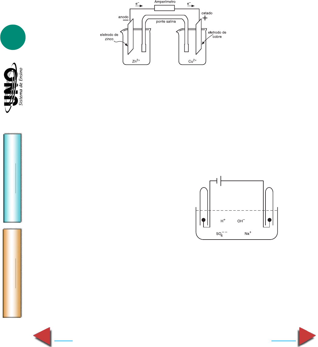 QUÍMICA - Eletroquímica IM PR IM IR Voltar GA BA RI TO Avançar 11 37. U. Alfenas-MG Um acumulador de chumbo é uma pilha galvânica que funciona atra- vés das semi-reações abaixo apresentadas. PbSO4(s) + H+ + 2e– → Pb + HSO4–1 Eº = – 0,300V PbO2(s) + 3H+ + HSO4–1 + 2e– → PbSO4(s) + 2H2O Eº = 1,630V Através desses dados é correto afirmar que: a) o dióxido de chumbo é oxidado a sulfato de chumbo II; b) o ácido sulfúrico funciona como catalisador; c) o dióxido de chumbo é empregado na constituição do ânodo; d) a ddp dessa pilha é de 1,270 V; e) há deposição de sulfato de chumbo II nos dois eletrodos. 38. U.F. Juiz de Fora-MG Observe o esquema abaixo representado e responda: Dados: * Zn2+ + 2e– → Zn Eº = – 0,76 V * Cu2+ + 2e– → Cu Eº = – 0,34 V a) Sabendo-se que o béquer da esquerda contém solução de ZnSO4 1 mol/L (solução incolor) e o béquer da direita contém solução de CuSO4 1 mol/L (solução azul), o que se observa quando os dois eletrodos entram em contato com as soluções, após certo tempo de funcionamento da pilha galvânica? b) Qual a função da ponte salina neste processo químico? c) Identifique a espécie redutora e a oxidante. Redutora: Oxidante: 39. PUC-PR Na eletrólise aquosa do Na2SO4(aq), com eletrodos inertes, obteremos no anodo e no cátodo, respectivamente? a) H2(g) e SO2(g) d) Na(s) e O2(g) b) Na(s) e SO2(g) e) O2(g) e H2(g) c) O2(g) e Na(s) 40. PUC-PR Dados os potenciais: Na0 → Na+ +1e– E0 = –2,71 V Ni0 → Ni2+ +2e– E0 = – 0,25 V Fe2+ → Fe3+ +1e– E0 = + 0,77 V Co2+ → Co3+ +1e– E0 = + 1,84 V Ag0 → Ag1+ +1e– E0 = + 0,80 V o agente reprodutor mais forte presente na tabela é o: a) Na0 d) Ni2+ b) Ag0 e) Co2+ c) Fe2+ QUÍMICA - Eletroquímica IM PR IM IR Voltar GA BA RI TO Avançar 12 41. VUNESP As células primárias são células galvânicas (pilhas) com os reagentes selados dentro de um invólucro. Elas não podem ser recarregadas e quando descarregam-se são descartadas, tornando-se um problema ao meio ambiente. Uma célula seca é um tipo de célula primária mais popular, conhecida simplesmente por pilha. Nesta pilha, a região cilíndrica de zinco serve como ânodo, e no centro fica o cátodo, um bastão de carbono. O interior da pilha é forrado com papel que serve como barreira porosa. O eletrólito é uma mistura pastosa e úmida de cloreto de amônio, NH 4 Cl, óxido de manganês (IV), MnO 2 , carbono finamente pulverizado e um suporte inerte, usualmente goma. A amônia, NH 3 , proveniente dos íons amônio, forma o complexo Zn(NH 3 ) 4 2+ com os íons Zn2+, e impede seu aumento e conseqüentemente redução do potencial. Essas células secas são larga- mente utilizadas em diversos aparelhos, tais como lanternas, brinquedos e relógios. Quanto à pilha citada, é correto afirmar que a) produz energia através de um processo espontâneo. b) o zinco metálico é reduzido a Zn2+. c) o fluxo de elétrons parte do cátodo para o ânodo. d) a diferença de potencial dessa pilha é um valor negativo. e) no ânodo ocorre a oxidação do Zn2+. 42. FUVEST-SP Um método de obtenção de H 2 (g) , em laboratório, se baseia na reação de alumínio metálico com solução aquosa de hidróxido de sódio. a) Escreva a equação balanceada dessa reação, sabendo-se que o hidrogênio provém da redu- ção da água e que o alumínio, na sua oxidação, forma a espécie aluminato, Al(OH)–4 b) Para a obtenão do H 2 , foram usados 0,10 mol de alumínio e 100 mL de uma solução aquosa de NaOH, de densidade 1,08 g/mL e porcentagem em massa (título) 8,0%. Qual dos reagentes, Al ou NaOH, é o reagente limitante na obtenção do H 2 ? Justifi- que, calculando a quantidade, em mol, de NaOH usada. Dado: Massa molar do NaOH = 40 g/mol 43. UEMS A massa de sódio depositada, quando uma corrente de 15A atravessa uma certa quantidade de NaCl fundido durante 20,0 minutos, é: Dados carga de 1 mol de elétrons = 96500C a) 42,9 g d) 66,2 g b) 6,62 g e) 10,9 g c) 4,29 g 44. UFRN A produção industrial de alumínio pela eletrólise da bauxita fundida é um pro- cesso industrial que consome grande quantidade de energia elétrica. A semi-reação de redução do alumínio é dada por: Al3+ + 3e- → Al Para se produzirem 2,7 g de alumínio metálico, a carga elétrica necessária, em coulombs, é: a) 9650 d) 57900 b) 28950 e) 19300 c) 32160 45. Unifor-CE Pretende-se obter cloro (Cl2) pela eletrólise da salmoura: NaCl (salmoura) → 1 2 Cl2(g) + NaOH (aq) + 1 2 H2 (g) Admitindo rendimento total, de acordo com a equação acima, quantos faradays são ne- cessários para obter 100 g de solução aquosa de NaOH com 80%, em massa, desta subs- tância? Dado: F = faraday = carga de 1 mol de elétrons a) 1 F d) 4 F b) 2 F e) 5 F c) 3 F