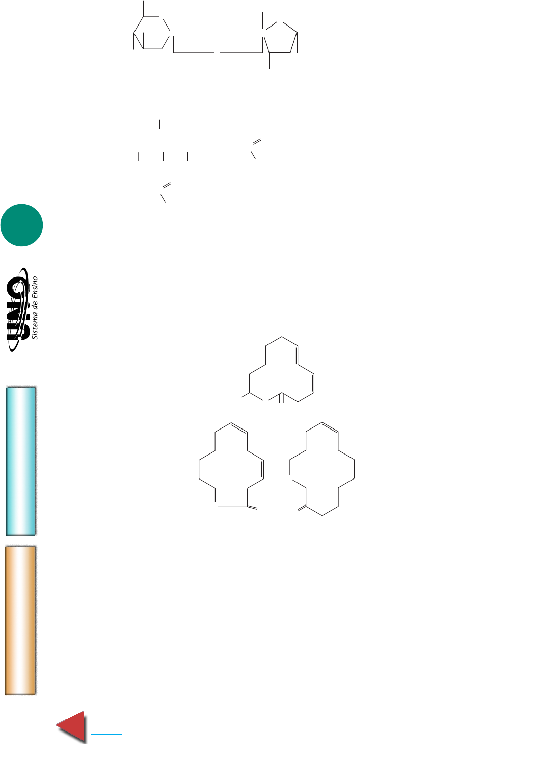 QUÍMICA - Compostos orgânicos II IM PR IM IR Voltar GA BA RI TO Avançar 11 34. U. F. Santa Maria-RS Entre os compostos a seguir, assinale o que, quando misturado com a água, produz solução capaz de conduzir a corrente elétrica (solução iônica) com maior intensidade. CH OH2 O C OH OH OH O HOH C2 C OH O OH CH OH2 H C3 CH2 OH H C3 C CH3 O CH2 CH CH CH CH C H O OH OH OH OH OH CH3 C OH O a) b) c) d) e) 35. Univali-SC Todos os anos, agricultores europeus sofrem grandes prejuízos devido à pre- sença de pequenos besouros que se alimentam de trigo estocado nos celeiros. Cientistas ingleses conseguiram isolar os compostos A, B e C, cujas fórmulas aparecem a seguir, utilizados pelos besouros para comunicar-se e transmitir aos outros a mensagem “achei comida, venham todos para cá!” Esses pesquisadores acreditam ser possível construir armadilhas para os tais besouros, utilizando esses compostos para atraí-los. Assinale a resposta correta, a respeito dos compostos pesquisados: a) A, B e C apresentam o grupo funcional éster; b) A molécula C apresenta mais átomos de carbono do que a molécula A; c) A molécula A apresenta o grupo funcional cetona; d) As moléculas A e B apresentam o grupo funcional éter; e) B e C apresentam cadeias ramificadas. O OH C3 A O O B C O O G A B A R IT O IM PR IM IR Voltar Avançar 1 QUÍMICA - Compostos orgânicos II QUÍMICA COMPOSTOS ORGÂNICOS II CH2 NH2C H CH3 CH3O OCH3 CH3 1. 02 + 04 = 06 2. B 3. D 4. B 5. a) b) a função oxigenada presente na molécula é éter 6. B 7. B 8. D 9. C 10. B 11. E 12. C 13. B 14. B 15. B 16. B 17. C 18. D 19. C 20. E 21. D 22. B 23. C 24. a) A fórmula estrutural da sulfa ou p-aminobenzeno sulfonamida é: Fórmula molecular: C 6 H 8 N 2 SO 2 . Obs.: p no nome de um composto aromático indica posi- ção para ou 1,4 no anel aromático. b) A parte semelhante do ácido fólico com a sulfa é: 25. D 26. A 27. 1 + 4 + 16 + 32 = 53 28. D 29. A 30. C NH2 NH2SO2 O NH C NH amina amida 31. A 32. A 33. D 34. E 35. B