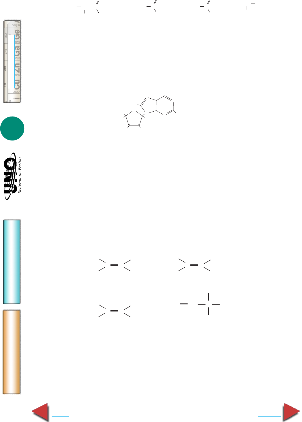 QUÍMICA - Isomeria IM PR IM IR Voltar GA BA RI TO Avançar 5 TA BE LA P ER IÓ DI CA 18. UFRN Os isômeros óticos se diferenciam, fundamentalmente, pelo sentido para o qual desviam o plano da luz polarizada. O composto orgânico que apresenta isomeria ótica é: a) b) c) d) 19. Unifor-CE Há isômeros opticamente ativos em compostos com a fórmula a) CH 2 Br – CH 2 – CH 2 – CH 2 Br d) CH 2 = CH – CH = CH 2 b) CH 3 – CHBr – CHBr – CH 3 e) CH 3 – CBr 2 – CBr 2 – CH 3 c) CH 3 – CH = CH – CH 3 20. U. F. Juiz de Fora-MG Com relação à fórmula estrutural da adenosina, representada abaixo, podemos afirmar que: a) estão presentes as funções álcool, ácido carboxílico e amida. b) é uma substância opticamente ativa. c) possui cadeia carbônica saturada e homogênea. d) é uma substância que possui somente dois átomos de carbono assimétricos. 21. U. F. Juiz de Fora-MG Sobre o n-heptano (octanagem 0) e o 2, 2, 4-trimetilpentano (octanagem 100) assinale a opção correta: a) os ângulos entre as ligações carbono-carbono são todos de 120º; b) são isômeros de cadeia; c) possuem a fórmula geral C n H 2n ; d) não possuem isomeria óptica. 22. UFRS Dados os seguintes compostos orgânicos: Assinale a afirmativa correta. a) O composto II apresenta isomeria geométrica e o composto IV, isomeria óptica. b) Apenas os compostos I e III apresentam isomeria geométrica. c) Apenas o composto IV apresenta isomeria geométrica. d) Todos os compostos apresentam isomeria geométrica. e) Os compostos I e IV apresentam isomeria óptica. NH2 CH3 CH C O OH 2CH3 CH C O OH 2CH3 CH C O H NH2 CH3 CH CH3 OH OH H HOH2C H H H N H N O NH2 HN N CH CH2 3 C CH CH3 2 CH3 C H H I C H CH3 C II CH3 C CH CH3 2 CH3 C III CH3 CH CH3 2 CH C IV CH CH H OH2 3 QUÍMICA - Isomeria IM PR IM IR Voltar GA BA RI TO Avançar 6 TA BE LA P ER IÓ DI CA 23. PUC-PR Dada a estrutura ao lado: Para torná-la opticamente ativa, o R deverá ser: a) -H ou -NH 2 b) -CH 3 ou -NH 2 c) -CH 3 ou -CH 2 CH 3 d) -H ou -CH 3 e) -CH 2 CH 3 ou -NH 2 24. UEL-PR Considere as fórmulas estruturais dos compos- tos orgânicos a seguir. Sobre essas fórmulas, é correto afirmar: a) IV e V representam isômeros ópticos. b) I e III representam isômeros geométricos. c) I, II e IV representam substâncias diferentes. d) As fórmulas moleculares de I e V são diferentes. e) As fórmulas moleculares de I e II são iguais, portanto representam a mesma substância. 25. UFRJ Isomeria é o fenômeno que se caracteriza pelo fato de uma mesma fórmula molecu- lar representar diferentes estruturas. Considerando a isomeria estrutural plana para a fórmula molecular C 4 H 8 , podemos identi- ficar os isômeros dos seguintes tipos: a) cadeia e posição c) função e compensação b) cadeia e função d) posição e compensação 26. U. Uberaba-MG Assinale a alternativa que apresenta o(s) tipo(s) de isomeria observado(s) nos compostos que possuem a fórmula molecular C 4 H 10 : a) estrutural, c) funcional, b) estrutural e óptica, d) estrutural, funcional e óptica. 27. U. E. Maringá-PR Assinale o que for correto. 01) Butanol-1 e metilpropanol são isômeros de cadeia. 02) O metanoato de etila com o etanoato de metila apresentam isomeria de compensação ou metameria. 04) O etanal (aldeído) e o etenol (enol) são isômeros de função. 08) O 2,2-diclorobutano apresenta isomeria ótica. 16) O 2,3-dimetil penteno-1 apresenta isomeria cis-trans. 32) O 2-cloro-3-hidroxibutano apresenta isomeria ótica, dois carbonos assimétricos e um total de três isômeros. Dê, como resposta, a soma das alternativas corretas H C3 NH2 CH2 C C O OHR CI CI CI CI I II CI CI CI CI III IV CI V CI