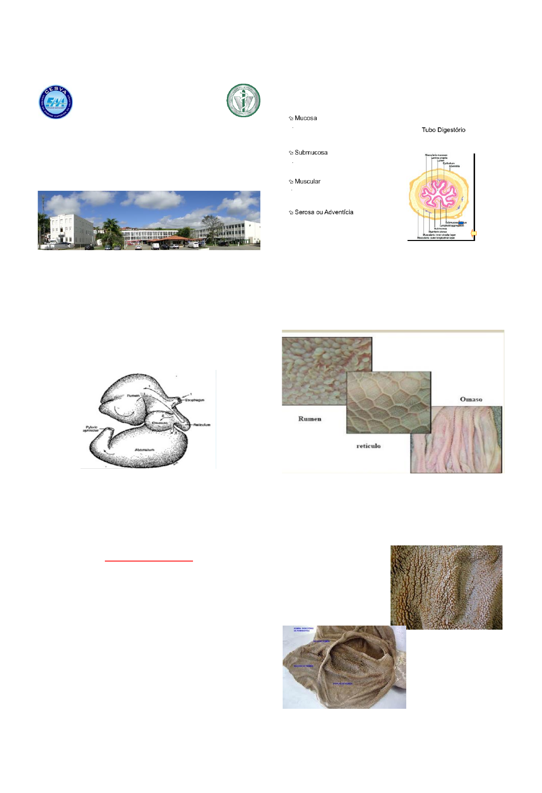 1 Ana Paula Aragão anapaula.aragao@faa.edu.br 1 Fundação Educacional Dom André Arcoverde Centro de Ensino Superior de Valença Faculdade de Medicina Veterinária de Valença Histologia Veterinária Aplicada Sistema Digestório Poligástricos Tubo Digestório Estrutura geral . Epitélio de revestimento . Lâmina própria (tecido conjuntivo frouxo) . Muscular da mucosa . Tecido conjuntivo frouxo à semi denso . Plexo nervoso submucoso (Meissner) . Fibras musculares lisas (circular interna e longitudinal externa) . Plexo nervoso mioentérico (Auerbach) . Tecido conjuntivo frouxo . Mesotélio (epitélio simples pavimentoso) Mucosa Submucosa Muscular Serosa ou Adventícia Feedback da Aula Anterior Principais características morfológicas dos segmentos do tubo digestório Objetivos da Aula de Hoje Caracterizar morfologicamente e fisiologicamente os pré estômagos dos ruminantes Não glandular Rúmen (“Pança”) • Possui Função Mecânica • “Grande cuba de fermentação” – produção AGV • Papilas ruminais - Aumentam a superfície do rúmen em sete vezes; Ausentes no teto e nos pilares; • Absorção de ácidos graxos, água e vitaminas; • Mudam conforme a composição energética do alimento: Alimentação volumoso – alongamento; Alimentação concentrado – encurtamento. 2 Rúmen Papilas do Rúmen Mucosa Ep. Pavimentoso estratificado queratinizado Não Possui Muscular da Mucosa LP/Submucosa Camada muscular Serosa Caracterização histológica Rúmen Rúmen Não glandular Retículo (“Barrete”) • Pregas reticulares, com aspecto de favos de mel e formato lanceolar • Compartimento mais cranial; • Face diafragmática (perigo – ingestão de corpos estranhos); • Face visceral – contato com rúmen (óstio ruminorreticular); • “Ação mecânica converte a ingesta fermentada em uma massa de matéria finamente particulada” 3 Retículo Pregas reticulares com músculo liso no ápice Papilas 2ª e 3ª Mucosa - Epitélio estratificado pavimentoso queratinizado LP/ Submucosa Camada muscular Camada Serosa Não glandular Omaso (“Folhoso”) LÂMINAS DO OMASO • Em torno de 100; • Dispostas como as páginas de um livro; Função: • Prensagem do alimento para compactação e absorção de líquidos. • Muscular da Mucosa se projeta muito, formando um eixo de músculo liso em toda extensão da prega. Está presente também uma lâmina de musculatura lisa da circular interna. Omaso Papilas 4 Glandular Abomaso • Digestão enzimática • Descrição de estômago glandular = monogástricos Centro de Ensino Superior de Valença – CESVA/FAA 20 Feedback da Aula Principais características morfológicas e fisiológicas dos pré estômagos dos ruminantes Próximo Assunto... Sistema digestório das aves Referências Bibliográficas BANKS, W.J. Histologia veterinária aplicada. 2.ed. São Paulo: Manole, 1992. JUNQUEIRA, Luis Carlos Uchoa; JUNQUEIRA, J. C. Histologia básica. 11.ed. Rio de Janeiro: Guanabara Koogan, 2011. GARTNER, Leslie P.; HIATT, James L. Tratado de histologia em cores. 3.ed. Rio de Janeiro: Elsevier, 2007. KIERSZENBAUM, A.L. Histologia e Biologia Celular. 2ª ed. Elsevier, Rio de Janeiro, 2008. DI FIORI, M.S.H. Novo atlas de histologia normal de Di Fiori. 1.ed. Rio de Janeiro: Guanabara Koogan, 2008. ROSS, M. H.; PAWLINA, W.; BARNASH, T. A. Atlas de histologia descritiva. Porto Alegre: Artmed, 2012. 22