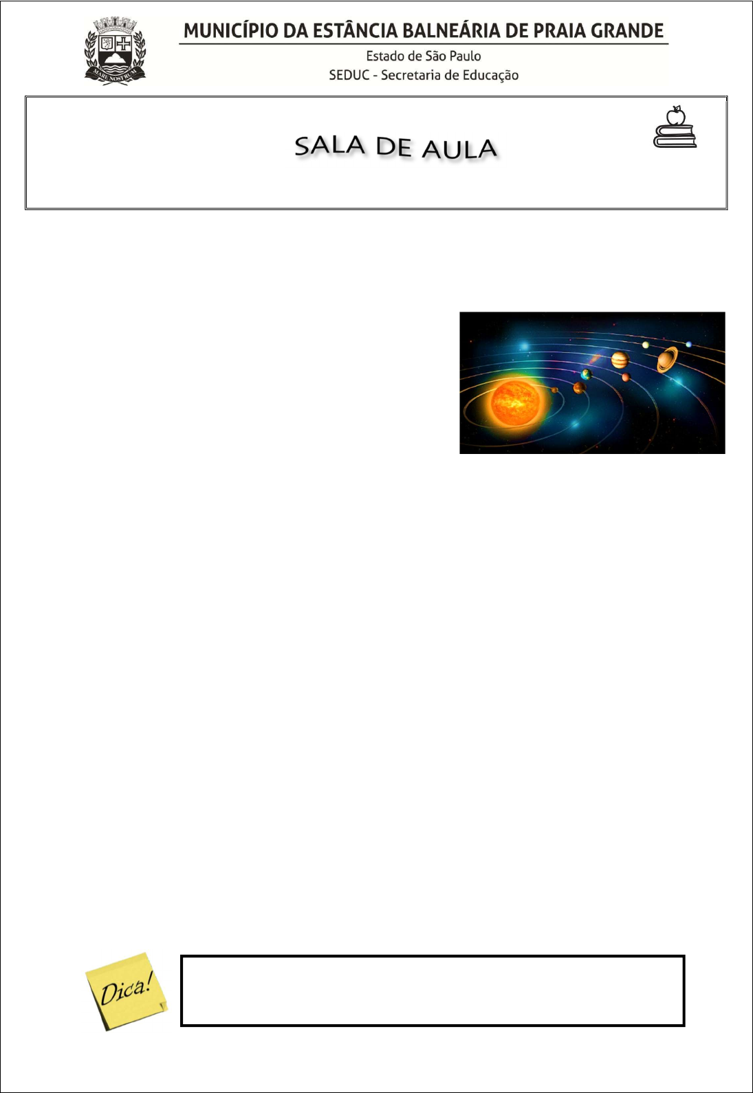 O sistema solar Dentro do universo está a nossa galáxia, a Via Láctea, e dentro dela está o Sistema Solar, que é composto por: Oito planetas - Mercúrio, Vênus, Terra, Marte, Júpiter, Saturno, Urano e Netuno; O Sol - Nossa estrela mais próxima, é o centro do nosso sistema solar; Satélites naturais - A Lua; Satélites artificiais - Os de telefonia e TV a cabo; Cometas - Pequenos corpos gelados do Sistema Solar que, ao passarem perto do Sol, aquecem e começam a liberar gases; Asteroides - Corpo rochoso composto por minerais e metais. Existem dois tipos de corpos celestes: os que possuem luz própria, como as estrelas e os que não têm luz própria como os planetas. O Sol é o centro do nosso sistema solar, e todos os planetas giram em torno dele. Esse movimento que os planetas fazem em torno do Sol chama-se órbita. Para observar o espaço o homem criou vários inventos como: lunetas, telescópios, planetários, naves espaciais, sondas, satélites artificiais e viagens espaciais. O planeta Terra não fica parado, ele tem dois movimentos principais, a rotação e a translação. O movimento da Terra em volta dela mesma é chamado rotação (com duração aproximada de 24 horas) e o movimento da terra em torno do Sol é chamado translação (com duração aproximada de 365 dias ou 1 ano). A Terra não fica sempre em pé, ela tem uma inclinação que se modifica no decorrer do ano, esse movimento chama-se inclinação sazonal. Essa diferença de inclinação dita as estações do ano. Os seres vivos se adaptam a essas variações sazonais (climáticas). Fontes – Acessos em 08 out. 2021. https://acessaber.com.br/atividades/o-sistema-solar-4o-ano/ https://www.terra.com.br/noticias/educacao/voce-sabia/qual-a-diferenca-entre-um-asteroide-e-um-cometa,c008c087e60ea310VgnCLD200000bbcceb0aRCRD.html https://cultura.estadao.com.br/blogs/marcelo-rubens-paiva/wp-content/uploads/sites/111/2014/09/sistema-solar.jpg SEMANAS 35 e 36 Disciplina: Ciências 4º ano do Ensino Fundamental Assista ao vídeo: O sistema solar em 3 D para crianças. https://www.youtube.com/watch?v=-oie4EFLs_0 Atividades Responda em seu caderno. 1- Quais são os 8 planetas que compõem o sistema solar? ___________________________________________________________________________ ___________________________________________________________________________ 2- Como se chama a estrela central do sistema solar? ___________________________________________________________________________ 3- Observe a imagem abaixo. A) Numere corretamente os planetas por sua distância do Sol ( ) Netuno. ( 1 ) Mercúrio. ( ) Vênus. ( ) Urano. ( ) Terra. ( ) Saturno. ( ) Marte. ( ) Júpiter. B) Qual é o planeta mais distante do Sol? _____________________________________ C) Qual é o nome do planeta em que vivemos? _________________________________