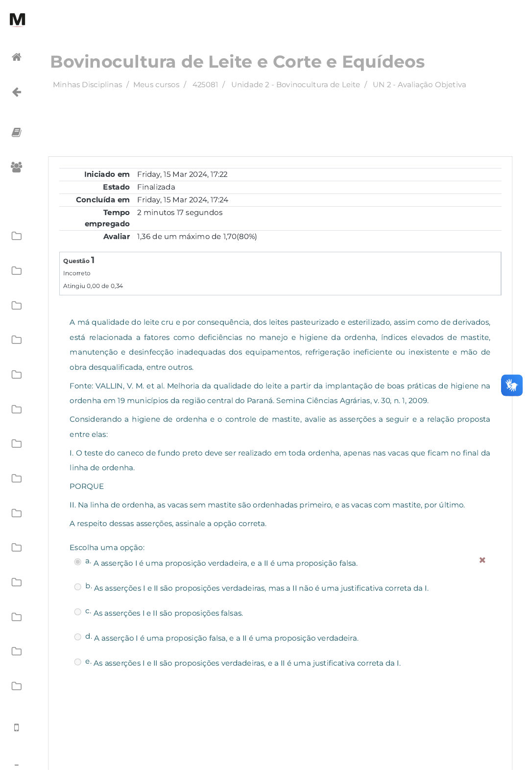 15/03/2024, 16:25 UN 2 - Avaliação Objetiva: Revisão da tentativa https://avap.multivix.edu.br/mod/quiz/review.php?attempt=4776060&cmid=1644854 1/5 Minhas Disciplinas / Meus cursos / 425081 / Unidade 2 - Bovinocultura de Leite / UN 2 - Avaliação Objetiva Bovinocultura de Leite e Corte e Equídeos Iniciado em Friday, 15 Mar 2024, 17:22 Estado Finalizada Concluída em Friday, 15 Mar 2024, 17:24 Tempo empregado 2 minutos 17 segundos Avaliar 1,36 de um máximo de 1,70(80%) Questão 1 Incorreto Atingiu 0,00 de 0,34 A má qualidade do leite cru e por consequência, dos leites pasteurizado e esterilizado, assim como de derivados, está relacionada a fatores como de�ciências no manejo e higiene da ordenha, índices elevados de mastite, manutenção e desinfecção inadequadas dos equipamentos, refrigeração ine�ciente ou inexistente e mão de obra desquali�cada, entre outros. Fonte: VALLIN, V. M. et al. Melhoria da qualidade do leite a partir da implantação de boas práticas de higiene na ordenha em 19 municípios da região central do Paraná. Semina Ciências Agrárias, v. 30, n. 1, 2009. Considerando a higiene de ordenha e o controle de mastite, avalie as asserções a seguir e a relação proposta entre elas: I. O teste do caneco de fundo preto deve ser realizado em toda ordenha, apenas nas vacas que �cam no �nal da linha de ordenha. PORQUE II. Na linha de ordenha, as vacas sem mastite são ordenhadas primeiro, e as vacas com mastite, por último. A respeito dessas asserções, assinale a opção correta. Escolha uma opção: a. A asserção I é uma proposição verdadeira, e a II é uma proposição falsa. b. As asserções I e II são proposições verdadeiras, mas a II não é uma justi�cativa correta da I. c. As asserções I e II são proposições falsas. d. A asserção I é uma proposição falsa, e a II é uma proposição verdadeira. e. As asserções I e II são proposições verdadeiras, e a II é uma justi�cativa correta da I. https://avap.multivix.edu.br/my/ https://avap.multivix.edu.br/course/view.php?id=26580 https://avap.multivix.edu.br/course/view.php?id=26580§ion=3 https://avap.multivix.edu.br/mod/quiz/view.php?id=1644854 https://avap.multivix.edu.br/my/ https://avap.multivix.edu.br/course/view.php?id=26580 https://avap.multivix.edu.br/user/index.php?id=26580 https://avap.multivix.edu.br/course/view.php?id=26580§ion=1 https://avap.multivix.edu.br/course/view.php?id=26580§ion=2 https://avap.multivix.edu.br/course/view.php?id=26580§ion=3 https://avap.multivix.edu.br/course/view.php?id=26580§ion=4 https://avap.multivix.edu.br/course/view.php?id=26580§ion=5 https://avap.multivix.edu.br/course/view.php?id=26580§ion=6 https://avap.multivix.edu.br/course/view.php?id=26580§ion=7 https://avap.multivix.edu.br/course/view.php?id=26580§ion=8 https://avap.multivix.edu.br/course/view.php?id=26580§ion=9 https://avap.multivix.edu.br/course/view.php?id=26580§ion=10 https://avap.multivix.edu.br/course/view.php?id=26580§ion=11 https://avap.multivix.edu.br/course/view.php?id=26580§ion=12 https://avap.multivix.edu.br/course/view.php?id=26580§ion=13 https://avap.multivix.edu.br/course/view.php?id=26580§ion=14 https://avap.multivix.edu.br/hooks/portal/ https://avap.multivix.edu.br/mod/page/view.php?id=1252%2F%22%20target%3D%22_blank https://avap.multivix.edu.br/ https://avap.multivix.edu.br/ https://avap.multivix.edu.br/ https://avap.multivix.edu.br/ https://avap.multivix.edu.br/ https://avap.multivix.edu.br/ 15/03/2024, 16:25 UN 2 - Avaliação Objetiva: Revisão da tentativa https://avap.multivix.edu.br/mod/quiz/review.php?attempt=4776060&cmid=1644854 2/5 Questão 2 Correto Atingiu 0,34 de 0,34 [...] independente de que o terneiro [bezerro] mame direto da mãe ou que se ordenhe a vaca para fornecimento do colostro, o essencial é se certi�car de que o terneiro ingeriu no mínimo dois litros de colostro nas primeiras duas horas de vida; quatro litros nas primeiras 12 horas e que ao completar suas primeiras 24 horas, o terneiro tenha ingerido cerca de 10-15% de seu peso vivo, ou seja, de cinco a seis kg de colostro. Fonte: SUÑÉ, R. W. Comunicado Técnico 51: importância do correto fornecimento do colostro na sobrevivência dos terneiros leiteiros. Bagé: Embrapa Pecuária Sul, 2002. Sobre o fornecimento de colostro em bovinos, avalie as a�rmações a seguir: I. Vacinas contra doenças reprodutivas comuns aplicadas na vaca podem proteger também o �lhote por meio da ingestão do colostro. II. O colostro pode trazer proteção ao bezerro contra diarreias. III. O bezerro nasce apenas com metade dos anticorpos de que necessita para a sobrevivência, precisando ingerir colostro para receber o restante. É correto o que se a�rma em: Escolha uma opção: a. II e III. b. I, II e III. c. I e II. d. Apenas II. e. Apenas III. https://avap.multivix.edu.br/my/ https://avap.multivix.edu.br/course/view.php?id=26580 https://avap.multivix.edu.br/user/index.php?id=26580 https://avap.multivix.edu.br/course/view.php?id=26580§ion=1 https://avap.multivix.edu.br/course/view.php?id=26580§ion=2 https://avap.multivix.edu.br/course/view.php?id=26580§ion=3 https://avap.multivix.edu.br/course/view.php?id=26580§ion=4 https://avap.multivix.edu.br/course/view.php?id=26580§ion=5 https://avap.multivix.edu.br/course/view.php?id=26580§ion=6 https://avap.multivix.edu.br/course/view.php?id=26580§ion=7 https://avap.multivix.edu.br/course/view.php?id=26580§ion=8 https://avap.multivix.edu.br/course/view.php?id=26580§ion=9 https://avap.multivix.edu.br/course/view.php?id=26580§ion=10 https://avap.multivix.edu.br/course/view.php?id=26580§ion=11 https://avap.multivix.edu.br/course/view.php?id=26580§ion=12 https://avap.multivix.edu.br/course/view.php?id=26580§ion=13 https://avap.multivix.edu.br/course/view.php?id=26580§ion=14 https://avap.multivix.edu.br/hooks/portal/ https://avap.multivix.edu.br/mod/page/view.php?id=1252%2F%22%20target%3D%22_blank https://avap.multivix.edu.br/
