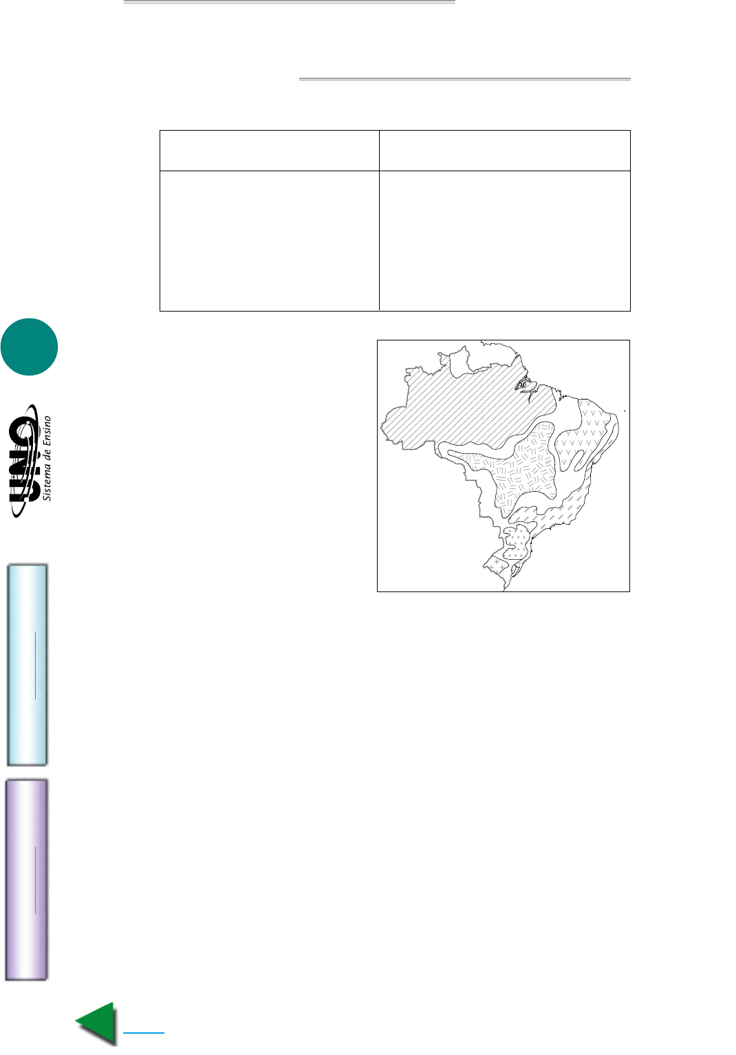 GEOGRAFIA - Domínios morfoclimáticos e naturais IM PR IM IR Voltar GA BA RI TO Avançar 10 32. Mackenzie-SP A região do cerrado brasileiro ganhará um EcoMuseu, o primeiro a céu aberto do país, que ocupará uma área de 400 mil hectares (…) o projeto surgiu em 1977 e é baseado em similares existentes na Europa, Canadá e Estados Unidos. (Oestado de São Paulo — 22/08/2000) Assinale a alternativa correta sobre as características naturais do domínio do cerrado con- forme AB’SABER: Características Características Climáticas Geomorfológicas a) Ausência de período seco Terras baixas e planícies aluvionais b) Temperaturas amenas Pequenas colinas arredondadas c) Alternância de estações úmida e seca Chapadas e chapadões sedimentares d) Elevadas médias térmicas todo o ano Escarpas e morros arredondados cristalinos e) Prolongado período seco Planaltos e chapadas areníticos e basálticos 33. U. F. Santa Maria-RS No mapa do Bra- sil a seguir, podem-se identificar os do- mínios morfoclimáticos e fitogeográfi- cos naturais, hoje bastante modificados pela ação humana. Numere os parênteses, estabelecendo a correta relação entre cada domínio iden- tificado no mapa e sua respectiva carac- terística. ( ) Área de chapadões tropicais e de- pressões interiores, com vegetação herbácea e arbustiva e com peque- nas árvores de troncos e galhos fi- nos e retorcidos adaptados à estia- gem sazonal. ( ) Área de relevo mamelonar, associ- ado ao intemperismo químico e à erosão em rochas cristalinas, com presença de floresta tropical úmida. ( ) Área de planaltos subtropicais, sedimentares e vulcânicos, com solos férteis na maior parte e topos cobertos originalmente por florestas aciculifoliadas. ( ) Área de depressões intermontanas e interplanálticas, de clima quente e seco e de solos pouco profundos, coberta por escassa vegetação arbustiva ressequida e esbran- quiçada. A seqüência correta é a) VI - II - VII - V. d) III - VII - II - VI. b) II - III - V - IV. e) IV - I - III - II. c) VII - V - IV - III. I II III V VI VII VII VII IV COELHO, M. de A. Geografia Geral: O espaço natural e sócio- econômico. São Paulo: Moderna, 1992. p. 44. GEOGRAFIA - Domínios morfoclimáticos e naturais IM PR IM IR Voltar 1 D O M ÍNIO S M O R FO C L IM ÁT IC O S E NAT UR A IS 1. A 2. A 3. E 4. 31 5. E 6. C 7. D 8. D 9. C 10. A 11. E 12. C 13. B 14. D 15. C 16. E 17. Solução e comentários: a) As savanas localizam-se em regiões de baixas latitudes, encontrando-se nos limites das florestas equatoriais sob clima tropical quente e pouco úmido. Tem como suas principais áreas de ocorrência o continente africano, destacando-se também o Centro Oeste brasilei- ro, onde recebe o nome de cerrados. b) Trata-se de uma formação campestre onde predominam arbustos de 2 a 3 metros de altura, além de algumas árvores distribuídas em meio a uma vegetação rasteira. De acordo com a estação, seca ou chuvosa, suas características fisionômicas mudam constantemente o seu aspecto. 18. E 19. Que o candidato identifique as ações dos homens em sociedade e suas conseqüências em diferentes espaços e tempos, demonstrando conhecer o funcionamento da natureza em suas múltiplas relações. 20. D 21. F V V F V V 22. B 23. D 24. E 25. V-V-F 26. V-F-F-V 27. B 28. C 29. C 30. D 31. 78 32. C 33. B G E O G R A F IA G A B A R IT O