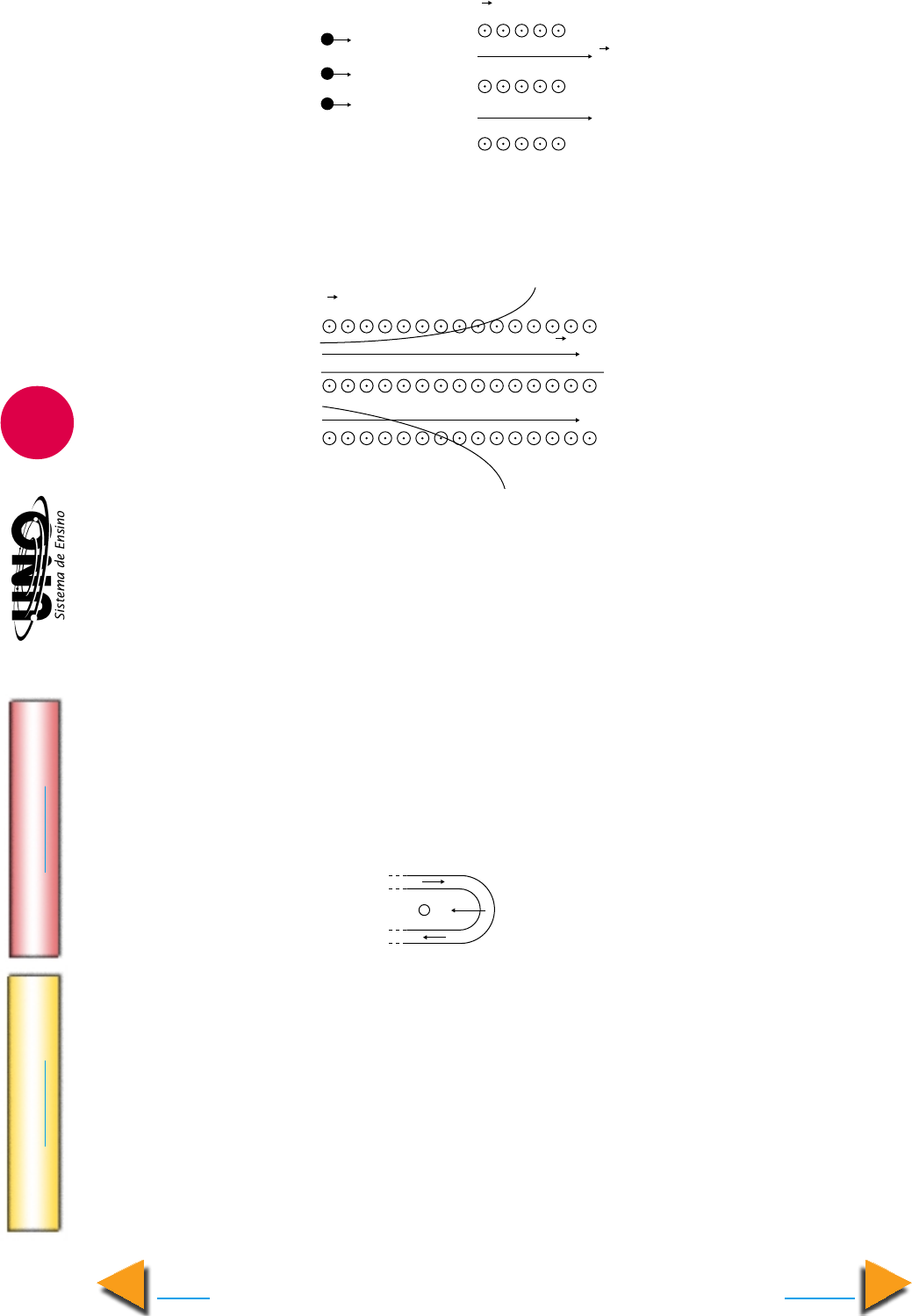 FÍSICA - Eletromagnetismo IM PR IM IR Voltar GA BA RI TO Avançar 19 59. UFMS Em uma certa região do espaço, temos presentes campos elétrico (E) e magnético (B) conforme a figura abaixo. Três partículas I, II e III penetram nessa região, vindas da esquerda da página, com veloci- dades v I , v II e v III , respectivamente. Depois de alguns instantes, as trajetórias das três partí- culas são as mostradas na figura abaixo. Com base nessas informações, é correto afirmar que (01) a partícula I possui carga negativa. (02) a partícula I possui carga positiva. (04) a partícula II não possui carga elétrica. (08) a partícula III possui carga positiva. (16) a partícula III possui carga negativa. Dê, como resposta, a soma das alternativas corretas. 60. U.Católica-GO Um gás monoatômico, constituído de íons (cada um deles portando uma carga elétrica positiva igual a 1,6 X 10–19C), flui por um tubo cuja forma se acha esquema- tizada na figura dada. Os íons se deslocam no tubo com velocidade constante v. A parte curva é de forma circular, cujo raio médio é r. Em uma secção reta do tubo passam 5 X 1016 íons por segundo. Na figura, A representa um anel circular de cobre. A partir desses dados, pode-se afirmar que: ( ) a corrente elétrica i no tubo é de 8 mA; ( ) o campo magnético no interior do anel, gerado pela corrente elétrica dos íons, está na direção perpendicular ao plano da página, com sentido penetrando nela; ( ) se a corrente elétrica no tubo for aumentando gradualmente, surgirá, por indução, uma corrente elétrica no anel de cobre, no sentido horário; ( ) se um campo magnético externo for aplicado na parte reta do tubo, na direção do movimento dos íons, então esse campo magnético provocará uma força magnética sobre esses íons, na mesma direção de seu movimento. A v v O r B E VIII VII VI B E I II III FÍSICA - Eletromagnetismo IM PR IM IR Voltar GA BA RI TO Avançar 20 61. UFMS A câmara de bolhas é um dispositivo muito usado em laboratórios para identificar partículas atômicas através de sua trajetória, que fica marcada no vapor que preenche a bolha. Para separar as partículas, é aplicado um campo magnético homogêneo de intensi- dade conhecida e direção perpendicular ao plano de trajetória das partículas. Nesse siste- ma podemos desconsiderar a atuação da força peso sobre as partículas. Suponha, então, que um feixe de partículas, todas com a mesma velocidade (módulo, direção e sentido), deslocando-se na direção horizontal da esquerda para a direita, composto por elétrons e nêutrons, entre nessa câmara onde o sentido do campo é dado na figura abaixo. Com relação à trajetória das diferentes partículas atômicas que compõem o feixe, é correto afirmar que Sendo dado: m NÊUTRON ∼ 1840 m ELÉTRON carga ELÉTRON = – e ∼ – 1,6 X 10–19 C carga NÊUTRON = nula (01) a direção de movimento do nêutron será desviada para cima da direção horizontal, enquanto que a direção de movimento do elétron não será alterada. (02) a direção de movimento do nêutron será desviada para baixo da direção horizontal, enquanto que a direção de movimento do elétron será desviada para cima da direção horizontal. (04) as direções de movimento do elétron e do nêutron serão desviadas para baixo da direção horizontal. (08) a direção de movimento do elétron será desviada para baixo da direção horizontal e a direção de movimento do nêutron permanecerá inalterada. (16) os raios de curvatura das trajetórias do elétron e do nêutron são iguais. Dê, como resposta, a soma das alternativas corretas. 62. UFMT A relação fenomenológica entre correntes elétricas e campos magnéticos se cons- titui numa das bases principais de toda a tecnologia contemporânea. Sobre esse tema, julgue as afirmativas como verdadeiras ou falsas. ( ) Conectando-se uma pilha a um solenóide, surgirá em torno deste um campo magné- tico semelhante ao campo gerado por um ímã permanente. ( ) Se no interior de um solenóide houver um ímã permanente, haverá o aparecimento de uma corrente. Como a intensidade do campo do ímã permanente é constante, a cor- rente também não variará com o tempo. ( ) Somente haverá o aparecimento de um campo magnético nas imediações de um sole- nóide se este for alimentado por uma corrente alternada. 63. U. F. São Carlos-SP No final do século XIX, uma disputa tecnológica sobre qual a corrente elétrica mais adequada para transmissão e distribuição da energia elétrica, gerada em usinas elétricas, tornou clara a vantagem do uso da corrente alternada, em detrimento da corrente contínua. Um dos fatores decisivos para essa escolha foi a possibilidade da utilização de transformadores na rede de distribuição de eletricidade. Os transformadores podem aumen- tar ou diminuir a tensão a eles fornecida, permitindo a adequação dos valores da intensidade da corrente transmitida e reduzindo perdas por efeito Joule, mas só funcionam em corrente alternada. O princípio físico em que se baseia o funcionamento dos transformadores e a característica da corrente alternada que satisfaz a esse princípio são, respectivamente, a) a conservação da carga e o movimento oscilante dos portadores de carga elétrica. b) a indução eletrostática e o movimento contínuo dos portadores de carga elétrica. c) a indução eletrostática e o movimento oscilante dos portadores de carga elétrica. d) a indução eletromagnética e o movimento contínuo de portadores de carga elétrica. e) a indução eletromagnética e o movimento oscilante dos portadores de carga elétrica. B Fexe de partículas