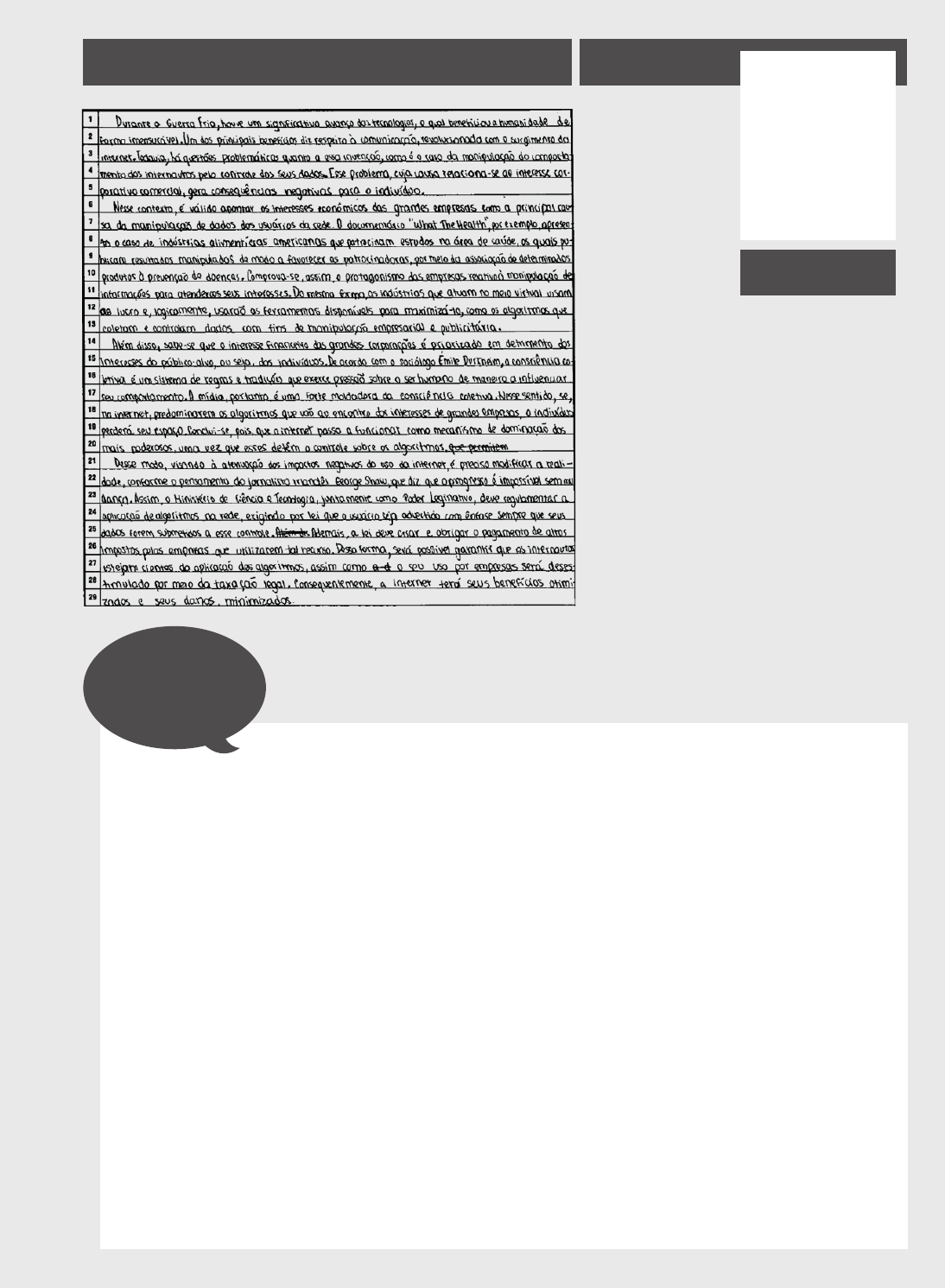 23 Umberto Mannarino | Catarina @nemvemenem Notas: C1: 180 C2: 200 C3: 200 C4: 200 C5: 200 980 Antes de começar a análise, eu gostaria de exaltar essa redação maravilhosa. Mesmo que as outras redações desta categoria tenham tirado 900+, esta foi a única que me fez parar tudo que eu estava fazendo e simplesmente aplaudir. Toda a argumentação está perfei- tamente organizada, com os parágrafos bem conectados e as referências socioculturais inseridas de maneira impecável. Em nenhum momento eu precisei ler duas vezes a mesma frase para entender o que a estudante estava querendo dizer. Você pode argumentar que as outras redações desta categoria também tiraram 900+, então em tese não tem dife- rença entre esta redação e as outras. E é verdade: todas tiraram uma nota excelente, sem dúvida. Mas na vida real... na vida fora das correções do ENEM... não existem pessoas que estão sendo pagas para ler os seus textos. Não existem corretores que precisam ler várias vezes para entender o que você quer dizer. Ou seja: se o seu texto está confuso, prolixo ou ambíguo, ninguém vai se dar ao trabalho de ler duas vezes para entender o que você está falando. Ninguém mesmo!! E, a depender do seu emprego futuro, você vai precisar escre- ver para as pessoas. Sendo assim, mesmo que você tenha tirado 1001 na redação do ENEM, um texto prolixo não vai atrair a atenção dos seus leitores. Por mais que você tenha tirado nota máxima nas 5 competências! Então aqui fica o meu recado: inspire-se nesta redação da Catarina para ver o que é de fato um texto impecável. Essa redação é o grande modelo em que você deve mirar na hora de escrever qualquer texto. (De novo, cá estou eu fazendo comentários que não se enquadram nas 5 competências do ENEM... mil perdões, mas eu não consigo me controlar. Eu sou meio fanático por essas coisas, então quando vejo uma pessoa que escreve maravilhosamente bem eu fico todo arrepiado....... Ah, dane-se, me deixa ser feliz). Comentário Inicial Transaction: HP15615591375004 e-mail: victormiranda13v@gmail.com 24 | Onde Já Se 1000 ( 1 ) ( 2 ) ( 3 ) ( 4 ) ( 5 ) ( 6 ) Análise por parágrafos: Introdução Durante a Guerra Fria ( 1 ), houve um significativo avanço das tecnologias, o qual beneficiou a humanidade de forma imensurável. Um dos principais benefícios diz respeito à comunica- ção, revolucionada com o surgimento da internet. Todavia ( 2 ), há questões problemáticas quanto a essa invenção ( 3 ), como é o caso da manipulação do comportamento dos inter- nautas pelo controle dos seus dados. Esse problema, cuja causa relaciona-se ao interesse corporativo comercial ( 4 ), gera consequências negativas para o indivíduo ( 5 , 6 ). A contextualização histórica é uma ótima forma de iniciar uma redação. No meu canal eu ainda vou postar um vídeo com as várias formas de montar uma introdução, e a contextualização histórica é uma delas. (PS: inscreva-se no meu canal: http://youtube.com/ExatasExatas). Conectivo de contraste para provocar uma quebra de expectativa e atrair a atenção do leitor. Excelente para a competência 4. “essa invenção” retomando “a internet”. Toptoptop. Elementos de retomada bem inseridos contribuem para a nota da competência 4. Já pincelando o argumento a ser tratado no desenvolvimento: o interesse corporativo comer- cial. Ótimo para a organização do texto – e, consequentemente, para a competência 3. Ótima construção: consequências “negativas”. É importante reforçar o ponto de vista do au- tor de que a manipulação do comportamento do usuário é um problema, senão a tese ficaria vaga e pouco concreta. Quanto mais adjetivos com posicionamento claro você utilizar, melhor. Termos vagos e ambíguos tornam a tese fraca e pouco organizada (vide comentário 6 da in- trodução da 2ª redação desta apostila). No caso dessa redação, a última frase da introdução foi a tese. É essa ideia que vai orientar todo o restante do texto. Tudo que a estudante falar a partir daqui precisa necessariamente estar atrelado à tese, senão a redação vai pecar na competência 3: organização e projeto de texto. Tanto a ausência quanto o excesso de informações nos parágrafos seguintes pode ser interpretado como projeto de texto incongruente. Felizmente, a estudante fez os 2 parágrafos do desenvolvimento muito bem conectados com a tese. Comentário sobre a Introdução Texto fluido, coerente e maravilhoso. A estudante começou com uma alusão histórica, traçan- do um paralelo entre a Guerra Fria e o contexto atual. O uso do conectivo “todavia” reforça o contraste de ideias, que chama a atenção do leitor. E o constante uso de termos “dissertativos” (“problema” e “consequências negativas”) demonstra autoria e indignação com o tema, o que contribui para uma tese forte que vai orientar todos os outros parágrafos (competência 3). Desenvolvimento 1 Nesse contexto ( 1 ), é válido apontar os interesses econômicos das grandes empresas como a principal causa da manipulação de dados dos usuários da rede ( 2 ). O documen- tário “What The Health”, por exemplo, apresenta o caso de indústrias alimentícias america- nas que patrocinam estudos na área de saúde, os quais publicam resultados manipulados Transaction: HP15615591375004 e-mail: victormiranda13v@gmail.com