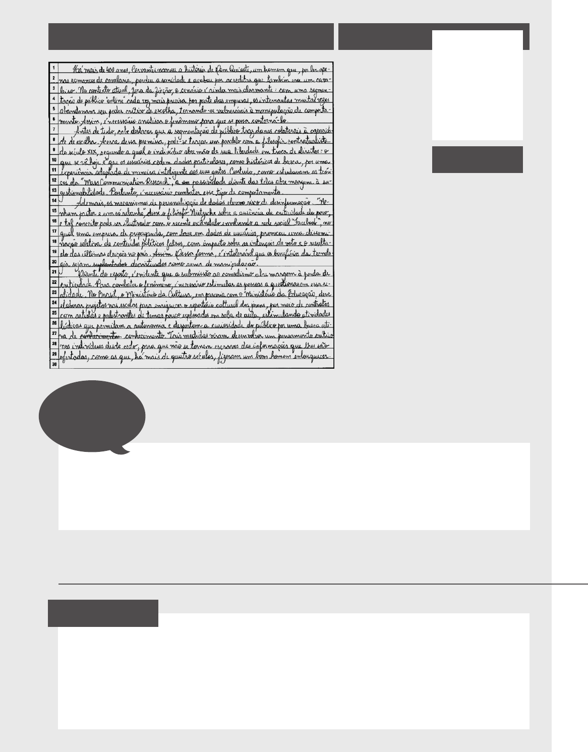 33 Umberto Mannarino | Umberto Notas: C1: 180 C2: 200 C3: 180 C4: 200 C5: 200 960 Comentário Inicial E vamos agora à minha redação. É sempre mais difícil procurar os erros no próprio texto, mas espero que com as dicas desta apostila você esteja começando a ficar mais crítico(a) com as próprias redações. É claro que seria melhor ter alguém para corrigir, mas preparei esta apostila com o máximo de comentários possível para justamente ajudar até quem não tem um professor por perto para fazer as correções. Vamos lá: Análise por parágrafos: Introdução Há mais de 400 anos, Cervantes narrou a história de Dom Quixote, um homem que, por ler apenas romances de cavalaria, perdeu a sanidade e acabou por acreditar que também era um cavaleiro ( 1 ). No contexto atual, fora da ficção, o cenário ( 2 ) é ainda mais alar- mante ( 3 ): com uma segmentação de público “online” cada vez mais precisa por parte das empresas ( 4 ), os internautas muitas vezes abandonam seu poder crítico de escolha, tornando-se vulneráveis ( 5 ) à manipulação de comportamento. Assim, é necessário ana- lisar ( 6 ) o fenômeno para que se possa contorná-lo. Transaction: HP15615591375004 e-mail: victormiranda13v@gmail.com 34 | Onde Já Se 1000 Como eu já disse em uma redação anterior, você pode usar literalmente qualquer repertório so- ciocultural para contextualização, desde que seu uso seja pertinente à argumentação. No caso, eu escolhi começar com Dom Quixote. Importante ressaltar que não é porque 400 anos atrás não ha- via internet que eu não posso citar Dom Quixote para falar da manipulação do comportamento do usuário pelo controle de dados na internet. Basta encontrar um traço comum entre o livro e a situ- ação atual. E foi o que eu fiz: na época, o personagem lia apenas um tipo de livro e acabou ficando louco; hoje, as pessoas que são expostas a um único tipo de informação perdem o senso crítico. Elemento de retomada “o cenário” para sintetizar a ideia exposta anteriormente. Uso de termo com posicionamento claro (“alarmante”) para evidenciar desde o início que se trata de um problema. Bom para a competência 3. Nesse ponto a argumentação ficou meio fraca, porque eu fui específico demais em relação ao problema: ao invés de falar de coisas amplas como os algoritmos, mirei na segmentação de público online. Ok que ela é um problema, mas teria se encaixado melhor em um dos desenvolvimentos, não na introdução. Essa especificidade excessiva pode ter sido o motivo de eu perder pontos na competência 3, porque acabou prejudicando a relação entre a intro- dução e o restante dos parágrafos (projeto de texto). Então fica a lição para pontuar bem na competência 3: a tese não deve ser nem genérica nem específica demais. Mais um termo forte: “vulnerável”. Perceba que eu estou deixando claro que isso se trata de um problema. Isso não chega a ser uma falha, mas a última frase da introdução poderia ter sido mais espe- cífica para já pincelar os argumentos. Ao invés de simplesmente dizer “analisar o fenômeno”, eu poderia ter feito como algumas das redações anteriores e já mencionado brevemente sobre o que vão se tratar os parágrafos de desenvolvimento. ( 1 ) ( 1 ) ( 2 ) ( 2 ) ( 3 ) ( 4 ) ( 5 ) ( 6 ) Comentário sobre a Introdução Eu fui específico demais na tese, o que definitivamente prejudicou o meu projeto de texto. De resto, os pontos fortes desse parágrafo são que eu usei vários termos com posiciona- mento claro e fiz uso de repertório sociocultural pertinente à argumentação, traçando um paralelo entre um livro da literatura clássica e os dias atuais (pontuando na competência 2). Desenvolvimento 1 Antes de tudo, cabe destacar que a segmentação de público traz danos colaterais ( 1 ) à capacidade de escolha. Acerca dessa premissa ( 2 ), pode-se traçar um paralelo ( 3 ) com a filosofia contratualista do século XIX ( 4 ), segundo a qual o indivíduo abre mão de sua liberdade em troca de direitos: o que se vê hoje é que os usuários cedem dados particu- lares ( 5 ), como histórico de busca, por uma experiência adaptada de maneira inteligente aos seus gostos. Contudo ( 6 ), como estudavam os teóricos da “Mass Communication Re- search”, a passividade diante das telas abre margem ( 7 ) à sugestionabilidade. Portanto, é necessário combater esse tipo de comportamento ( 8 ). Mais um termo com posicionamento claro (“danos colaterais”) para reforçar o caráter disserta- tivo do texto. Lembrando que um parágrafo exclusivamente expositivo (sem esses termos que deixam claro que é um problema) poderia comprometer a nota da competência 3, por passar a ideia de que tem coisa faltando no texto. E que “coisa” seria essa? Bem... simplesmente a infor- mação mais importante de todas em uma redação dissertativo-argumentativa: a consciência de que o assunto é um problema. Conectivo para ligar o tópico frasal ao restante do parágrafo. Pontinhos para a competência 4. Transaction: HP15615591375004 e-mail: victormiranda13v@gmail.com