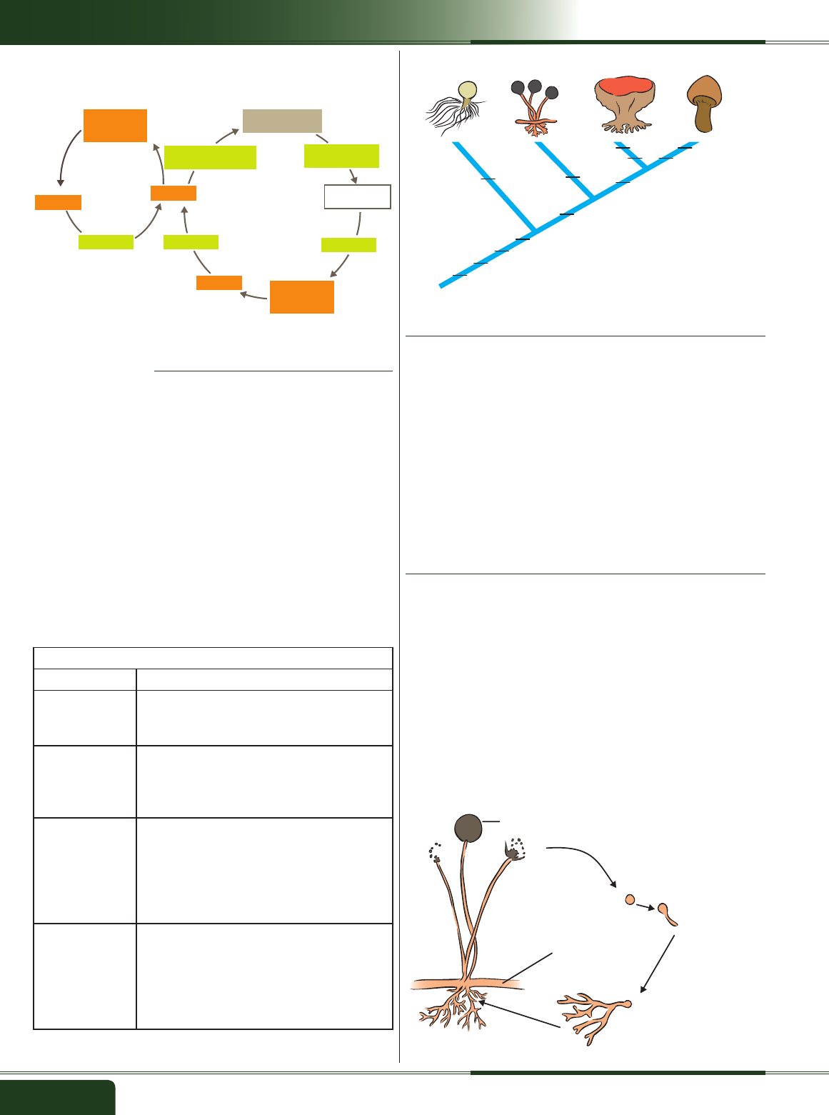 234 ciÊnciaS da natureZa e SuaS tecnologiaS Biologia I Anual – Volume 1 Os núcleos 2n do estágio diploide sofrem então meiose para dar origem a esporos sexuados, que germinarão para produzir novos micélios. Estrutura formadora de esporos (n) Reprodução assexuada Reprodução sexuada Plasmogamia (fusão do citoplasma) Esporos (n) Germinação Micélio (n) Germinação Esporos (n) Estrutura formadora de esporos (n) Meiose Estágio diploide (2n) Cariogamia (fusão dos núcleos) Estágio dicariótico (n+n) Reprodução assexuada (por esporos) e sexuada em fungos. Classifi cação dos fungos Os fungos são classificados em quatro filos, a saber: Chytridiomycota (citridiomiceto), Zygomycota (zigomiceto), Ascomycota (ascomiceto) e Basidiomycota (basidiomiceto). Os Zygomycotas, Ascomycotas e Basidiomycotas são considerados fungos teleomorfos, isto é, eles produzem esporos sexuais e assexuais. Alguns ascomicetos perderam a capacidade de se reproduzir sexuadamente. Esses fungos assexuais são chamados de anamorfos. O Penicillium e o Aspergillus são exemplos de fungos anamorfos que surgiram da mutação de um teleomorfo primitivo. Historicamente, os fungos cujo ciclo sexual ainda não havia sido observado eram colocados em uma “categoria de espera” denominada de Deuteromycota (deuteromiceto). Atualmente, os micologistas estão usando o sequenciamento do RNAr para reclassifi car esses organismos. Muitos dos que foram previamente classificados como deuteromicetos são fases anamórfi cas dos ascomicetos, e alguns são basidiomicetos. REINO FUNGI Filo Características principais Chytridiomycota Unicelulares ou fi lamentos (hifas cenocíticas). Apresentam fl agelos em algum estágio do ciclo de vida. Ex.: Allomyces arbuscula Zygomycota Hifas cenocíticas. Formam esporos sexuados chamados zigósporos. Sem corpo de frutifi cação. Ex.: Rhizopus nigricans, um bolor negro do pão. Ascomycota Hifas septadas. Formam esporos sexuados chamados ascósporos, em hifas especializadas chamadas ascos. Algumas espécies formam corpo de frutifi cação (ascocarpo ou ascoma). Ex.: Saccharomyces cerevisae (fermento-de- padaria ou levedo de cerveja). Basidiomycota Hifas septadas. Formam esporos sexuados chamados basidiósporos em hifas especializadas chamadas basídios. Algumas espécies formam um corpo de frutifi cação (basidiocarpo ou cogumelo). Ex.: Agaricus sp. (champignon). “Classifi cação dos fungos” (AMABIS e MARTHO. Biologia da célula. Volume 2. São Paulo: Moderna, 2007. Página 120). Zoósporos unif lagelados Chytr id iomycota Zygomycota Ascomycota Basidiomycota Zigósporo Ascocarpo Ascósporo Basidiocarpo Basidiósporo Corpo de frut i f icação Perda do f lagelo Reprodução por esporos Hifas Absorção de nutr ientes do meio Parede celular com quit ina Evolução dos fungos. Filo Chytridiomycota (quitridiomicetos) Os quitridiomicetos ou quitrídias são fungos terrestres e aquáticos, unicelulares e multicelulares, que em algum estágio do ciclo de vida apresentam células fl ageladas (esporos e/ou gametas). É o único fi lo do reino Fungi que possui representantes fl agelados, o que levou alguns autores a chamá-los de mastigomicetos (do grego mastix, fl agelo, e mycetos, fungo). Como os outros fungos, os quitridiomicetos apresentam quitina na parede celular e armazenam glicogênio. A maioria dos quitridiomicetos é sapróbia, entretanto, há espécies parasitas. Um exemplo de quitrídia parasita é Batrachochytrium dendrobatidis, que tem sido responsável pelo possível desaparecimento de anfíbios em vários continentes, incluindo a América do Sul. Filo Zygomycota (zigomicetos) O fi lo Zycomycota (do grego zygos, união) possui em torno de 1060 espécies, sendo cosmopolitas. Eles produzem esporos sexuais chamados zigósporos, que podem fi car dormentes por um determinado período. Podem ser unicelulares ou possuírem hifas cenocíticas, alcançando até o estágio de micélio. Alguns zigomicetos são utilizados na elaboração de produtos comercialmente importantes, como molho de soja, ácidos orgânicos, esteroides para drogas contraceptivas e anti-infl amatórias. Muitos desses fungos são decompositores, mas há espécies parasitas de plantas e animais. Um zigomiceto muito comum é o bolor preto do pão, Rhizopus stolonifer. Na reprodução assexuada dos zigomicetos ocorre a diferenciação no micélio de esporângios para a geração dos esporos assexuados. Isso ocorre quando as condições ambientais são favoráveis. Esporângio Esporo Hifas Ar (vento) Ambiente favorável Esporo em germinação Micélio Ciclo de reprodução assexuada do zigomiceto Rhizopus stolonifer. 235 ciÊnciaS da natureZa e SuaS tecnologiaSBiologia I Anual – Volume 1 Na reprodução sexuada, quando as hifas (+) e (–) se tocam, fundem-se, ocorrendo nesta área a formação dos gametângios com núcleos n (+) e (–) devido à fusão dos citoplasmas (plasmogamia), formando o estágio dicariótico (n + n). Em seguida, ocorre a fusão dos núcleos n (+) e (–) (cariogamia), formando o estágio diploide (2n) multinucleado. A parede celular dos gametângios fundidos se espessa e assume uma coloração negra, passando a estrutura a ser denominada zigoto. Este é altamente resistente e pode permanecer meses resistindo a condições adversas, até que o ambiente se torne propício para a germinação. Nessa etapa, o zigoto se abre e forma um único esporângio com todos os núcleos 2n, onde há a meiose para a produção e subsequente dispersão dos esporos. Cada esporo então origina um novo micélio. Esporangióforo Desenvolvimento do esporangióforo EsporângioEsporângio EsporângioEsporângio Esporos (n) Reprodução assexuada Micélio (n) Germinação do esporo Esporos (n) R!R! Detalhe da fusão de micélios sexualmente compatíveis MEIOSE Zigoto (zigosporângio) (2n) Fecundação Gametângios de sexos diferentes Ciclo de reprodução sexuada do zigomiceto Rhizopus stolonifer. Filo Ascomycota (as