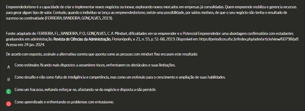 Empreendedorismo é a capacidade de criar e implementar novos negócios ou inovar, explorando novos mercados em empresas já consolidadas. Quem empreende mobiliza e gerencia recursos para gerar algum tipo de valor. Contudo, quando indivíduo se lança ao empreendedorismo, existe uma possibilidade, por vários de que seu negócio não tenha resultado de sucesso ou continuidade. De acordo com exposto, assinale a alternativa correta que aponta como as pessoas com mindset fixo encaram este resultado: A - Como estímulos ficando mais dispostos a assumirem riscos, enfrentarem os obstáculos e suas limitações. B - Como um fracasso, evitando afastando-se do negócio e disposta a não persistir. C - Como desafio e não como falta de inteligência e competência, mas como um estímulo para crescimento e ampliação de suas habilidades. D - Como aprendizado e enfrentando problemas com entusiasmo.