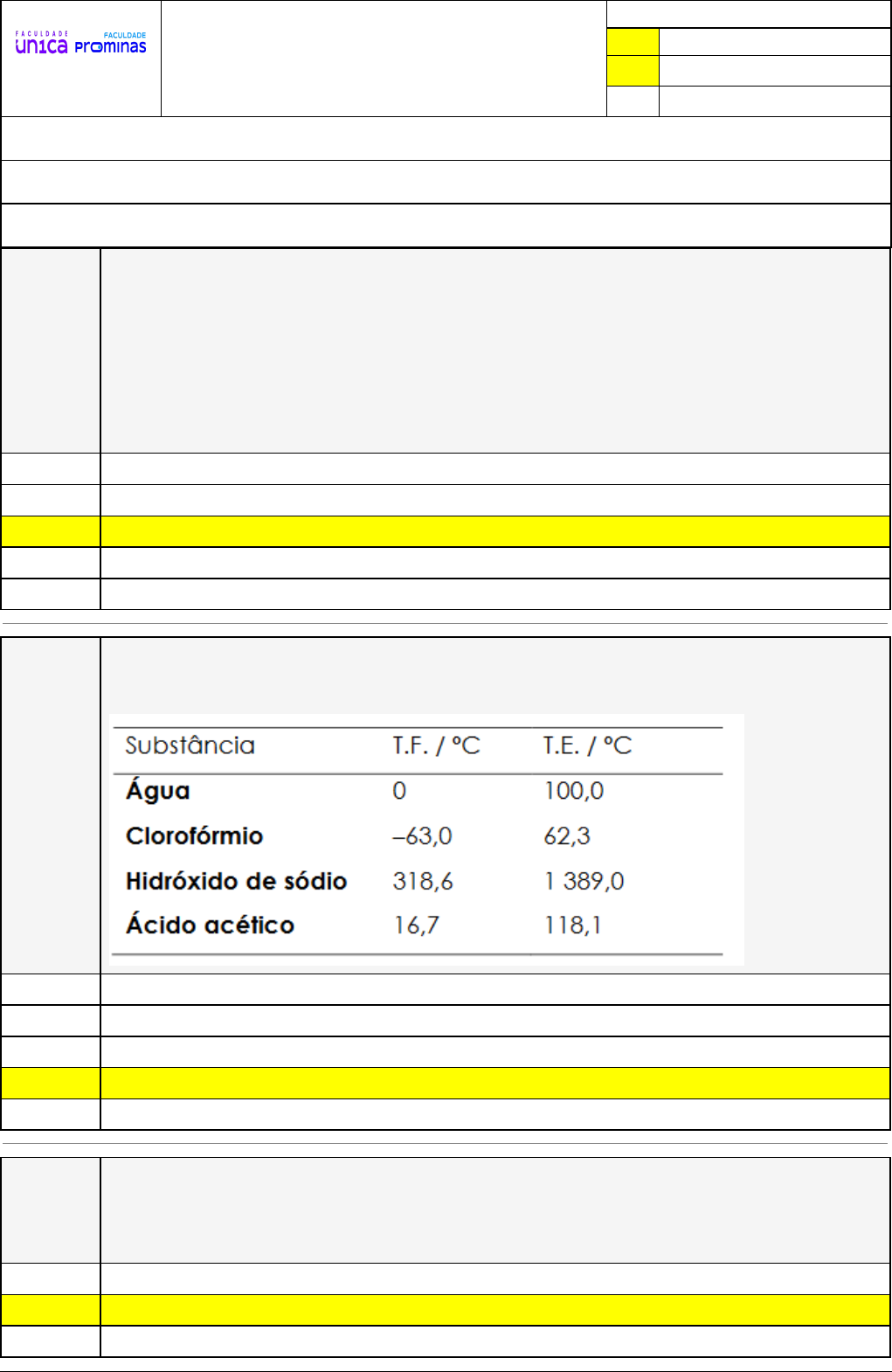 Pincel Atômico - 18/03/2024 12:45:44 1/3 LUCIA CABRAL DE MATTOS Exercício Caminho do Conhecimento - Etapa 2 (15646) Atividade finalizada em 18/03/2024 12:24:19 (1579664 / 1) LEGENDA Resposta correta na questão # Resposta correta - Questão Anulada X Resposta selecionada pelo Aluno Disciplina: QUÍMICA GERAL [1011374] - Avaliação com 5 questões, com o peso total de 3,33 pontos [capítulos - 1] Turma: Segunda Graduação: Segunda Graduação 6 meses - Licenciatura em Química - Grupo: FPD-JANEIRO/2024 - SGegu0A040124 [111103] Aluno(a): 91552060 - LUCIA CABRAL DE MATTOS - Respondeu 5 questões corretas, obtendo um total de 3,33 pontos como nota [353768_37966] Questão 001 Considere as seguintes propriedades de 3 substâncias: Substância A: quando colocada dentro de um recipiente move-se sempre para o fundo; Substância B: quando colocada dentro de um recipiente espalha-se por todo o espaço disponível; Substância C: quando colocada dentro de um recipiente, move-se sempre para o fundo, espalhando-se e cobrindo-o. Os estados físicos das substâncias A, B e C são, respectivamente: sólido, líquido e gasoso. gasoso, sólido e líquido. X sólido, gasoso e líquido. líquido, sólido e gasoso. gasoso, líquido e sólido. [353768_37984] Questão 002 Considere o quadro a seguir, que apresenta algumas substâncias e suas respectivas temperaturas de fusão (T.F.) e de ebulição (T.E.), ao nível do mar. Considerando-se esses dados, é CORRETO afirmar que: A 1500 °C o hidróxido de sódio é sólido O clorofórmio a 40 ºC é gasoso. A 320 ºC, o hidróxido de sódio é sólido. X A 25 ºC, tres das substâncias são líquidas. A substância mais volátil é o Ácido acético. [353769_37666] Questão 003 Icebergs flutuam na água do mar, assim como o gelo em um copo com água potável. Imagine a situação inicial de um copo com água e gelo, em equilíbrio térmico à temperatura de 0°C. Com o passar do tempo o gelo vai derretendo. Enquanto houver gelo, a temperatura do sistema diminui, assim como o volume do sistema. X permanece constante, mas o volume do sistema diminui. diminui e o volume do sistema aumenta. Pincel Atômico - 18/03/2024 12:45:44 2/3 Não ocorre alteração alguma. permanece constante, mas o volume do sistema aumenta. [353770_37670] Questão 004 Em um frasco de vidro transparente, um estudante colocou 500 ml de água e, sobre ela, escorreu vagarosamente, pelas paredes internas do recipiente, 50 ml de etanol. Em seguida, ele gotejou óleo vegetal sobre esse sistema. As gotículas formadas posicionaram-se na região interfacial, conforme mostrado nesta figura: Considerando-se esse experimento, é correto afirmar que: que todos os materiais possuem a mesma densidade. a massa da água, no sistema, é 10 vezes maior que a de etanol. a densidade da água é menor que a do etanol. a densidade do etanol é maior que a do óleo. X a densidade do óleo é menor que a da água. [353768_37977] Questão 005 Um estudante recebeu uma amostra de água pura, sob pressão de 1 atm, inicialmente à 50 °C. A amostra foi submetida ao resfriamento até alcançar 0°C, permanecendo por alguns minutos, nessa temperatura. Posteriormente, foi aquecida e mantida a 100 °C. Considerando-se que as temperaturas de fusão e ebulição da água pura, a 1 atm, são, respectivamente, 0 e 100 ºC, o gráfico da temperatura em função do tempo que esboça essa transformação é: Pincel Atômico - 18/03/2024 12:45:44 3/3 X