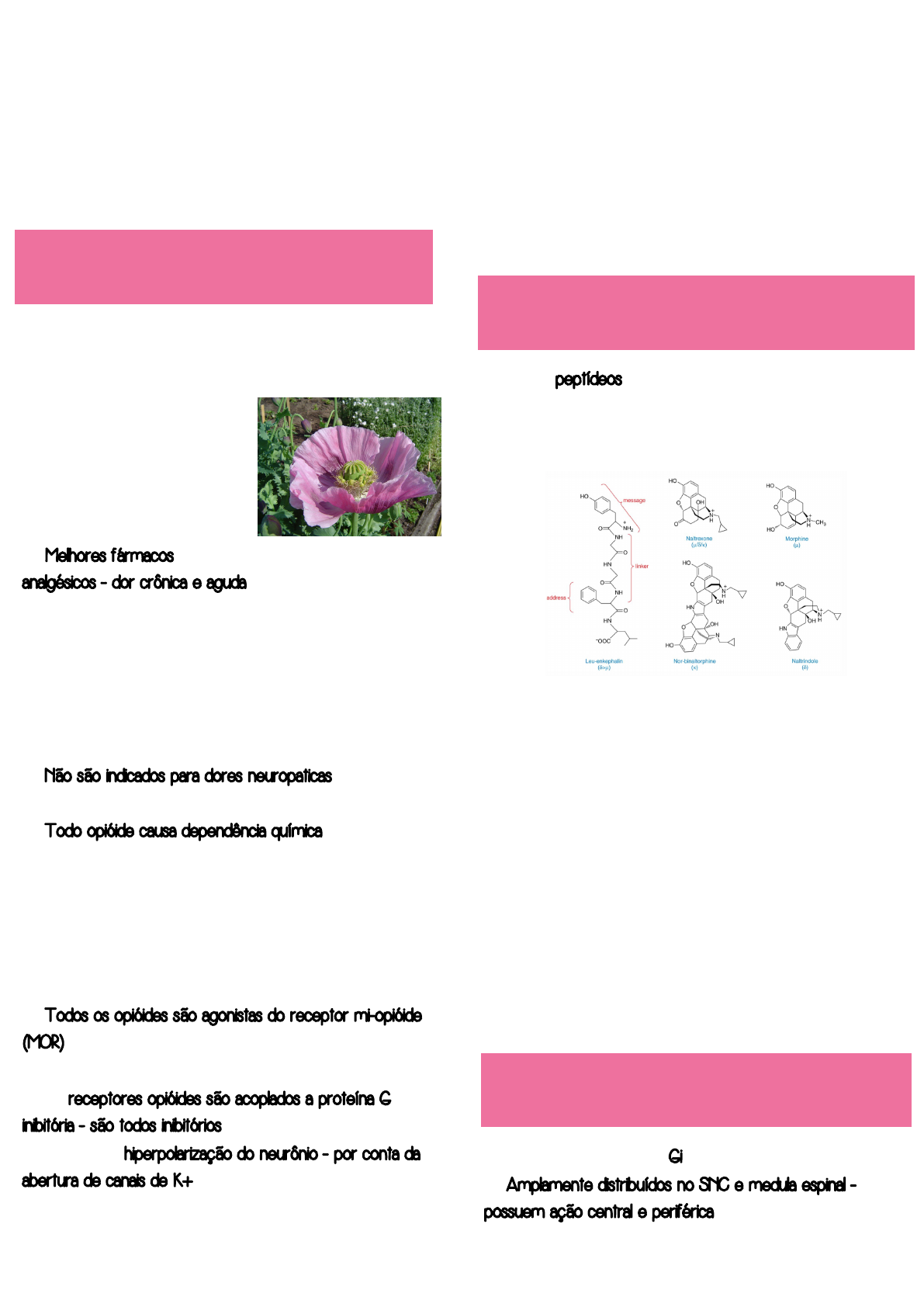 Camila Mariana Castro de Oliveira Medicina Nove de Julho Farmacologia dos opióides ➛ Ópio: droga vegetal derivada da Papaver somniferum (papoula) ✓ Naturais - ex: morfina, codeína ✓ Semi-sintéticos - ex: heroína ✓ Sintéticos - ex: fentanil ✓ Endógenos - ex: endorfina ➛ Melhores fármacos analgésicos - dor crônica e aguda ➛ Quando utilizada em doses altas causa sedação ➛ São fármacos que removem a dor e o aspecto emocional negativo da dor - quando utilizados em doses corretas não causa a perda da consciência, sensibilidade e coordenação ➛ A diferença entre esses fármacos está na dose e na farmacocinética (via de administração) ➛ Não são indicados para dores neuropaticas - dor no nervo (ex: neuropatia diabética) ➛ Todo opióide causa dependência química - necessidade de continuar utilizando o fármaco, caso contrário o paciente sofre com a falta dele (abstinência -> hiperalgesia) ➛ Receita amarela Mecanismo de ação: ➛ Todos os opióides são agonistas do receptor mi-opióide (MOR) ✓ Três subtipos de receptores opióides: mi, delta e kappa ➛ Os receptores opióides são acoplados a proteína G inibitória - são todos inibitórios ✓ Causam a hiperpolarização do neurônio - por conta da abertura de canais de K+ ✓ Isso faz com que haja o impedimento da formação de novas sinapses em neurônios ➛ Todos peptídeos - variam de 5 a 20 aminoácidos ➛ Met-encefalina, Leu-encefalina, Beta-endorfina, Dinorfina-A, Dinorfina-B, Alfa-endorfina, endomorfina ➛ Produzida no: ✓ Hipotálamo ✓ Núcleo do trato solitário ✓ Hipófise - glândula pituitária ✓ Medula adrenal ✓ Estômago e intestino ➛ Envolvidas no: ✓ Processamento da dor ✓ Modulação do comportamento afetivo ✓ Controle motor ✓ Controle do sistema nervoso autônomo ✓ Funções neuro endocrinológicas ➛ Todos GRPCRs, do tipo Gi ➛ Amplamente distribuídos no SNC e medula espinal - possuem ação central e periférica Farmacologia dos opioides Introdução: Agonias endógen - Endorfina: Receptor Opióid: Camila Mariana Castro de Oliveira Medicina Nove de Julho ➛ A ativação promove a redução da liberação de neurotransmissores (substância P e glutamato) por isso são depressores do SNC ➛ Presente em diversos tecidos periféricos - vasos, coração, pulmões, intestino, sistema imune Efeitos da estimulação do receptor μ-opióide: ➛ Analgesia - indicação terapêutica ✓ Diminuição total ou parcial da dor. A dor pode ainda ser sentida mas perde o componente emocional negativo ✓ Não há perda de consciência, fala, coordenação motora, sensibilidade tátil ou de temperatura ✓ Eficiente para dores crônicas e agudas ✓ Dores neuropáticas são mais difíceis de serem tratadas com opióides ➛ Constipação - pode atuar como efeito colateral ou como indicação terapêutica para pacientes com diarreia (Loperamida - opióide que não tem ação no SNC pois é substrato da glicoproteína P) ✓ Piora o quadro de náusea ✓ Inibe as secreções intestinais e bile ➛ Sedação - sonolência ➛ Miose - importante para o diagnóstico de intoxicação ➛ Inibição do reflexo da tosse ✓ Inibição direta do centro promotor da tosse ✓ Não está diretamente ligado a inibição respiratória ➛ Náuseas e vômitos ✓ Estímulo direto do quimiorreceptor na medula ✓ Pode ser revertido com antagonista 5-HT3 (ondansetrona) e procinéticos (metoclopramida) ➛ Depressão respiratória ✓ Perde a sensibilidade ao CO2 - a administração de O2 pode piorar o quadro pois retira o estímulo da pO2 ✓ Pode levar a morte ✓ Diminuição da frequência e volume de respiração ✓ Piora com álcool, sedativos, anestésicos, ansiolíticos ✓ Sono pode levar a apneia ➛ Bradicardia e Hipotensão ortostática - ocorre por conta de uma depressão do tônus simpático (efeito central) ➛ Vasodilatação periférica (Prurido) - devido a liberação de histamina ➛ Rigidez muscular ✓ Principalmente fentanil ✓ Pode ser revertida com bloqueadores da junção neuromuscular ➛ Inibição do estímulo para micção ➛ Efeito neuroendócrinos ✓ Inibe a liberação dos hormônios - Testosterona, cortisol, gonadotrofinas, LH, FSH - Diminui a libido e promove irregularidades no ciclo menstrual Farmacodinâmica: ➛ Os receptores opióides estão acoplados à proteína Gi/Go e quando estimuladas: ✓ Inibem adenilciclase e reduzem a concentração de AMPc ✓ Promovem a abertura de canais de potássio (hiperpolarização) ✓ Inibem a abertura de canais de cálcio voltagem dependente - redução da liberação de neurotransmissores ✓ Ativação de PKC e PLC ➛ A ativação aguda leva a: ✓ Dessensibilização: - Perda rápida do efeito de ativação do receptor - Acontece por internalização e fosforilação do receptor ➛ A ativação prolongada leva a: ✓ Tolerância: - Perda progressiva da efetividade, perda da potência - A perda do efeito pode ser revertida com o aumento da dose - A tolerância é reversível com o tempo - É dependente do órgão -> rápida: euforia; moderada: constipação, êmese, analgesia, sedação, depressão respiratória; lenta: miose - Efeito de tolerância cruzado com outros opióides Tríade fatal do opióide -> sedação, vômito e depressão respiratória Camila Mariana Castro de Oliveira Medicina Nove de Julho Dependência: ➛ Enquanto o paciente for tolerante à opióides ele será um dependente ➛ Todo usuário prolongado se torna dependente ➛ A falta da estimulação dos receptores leva a uma hiperativação celular que promove a “síndrome de abstinência” ✓ Agitação, hiperalgesia, hipertermia, hipertensão, diarréia, midríase, secreção de hormônios ✓ Quadro só é revertido com a administração de opióides ✓ O aparecimento do quadro é altamente aversivo e leva o usuário a buscar mais opióides Vicio: ➛ É um padrão comportamental de uso compulsivo ➛ Nem todo de